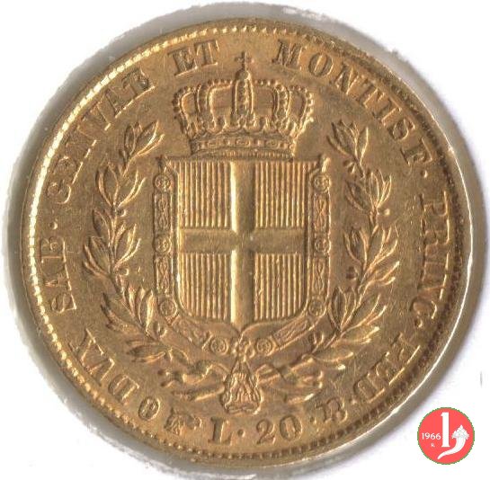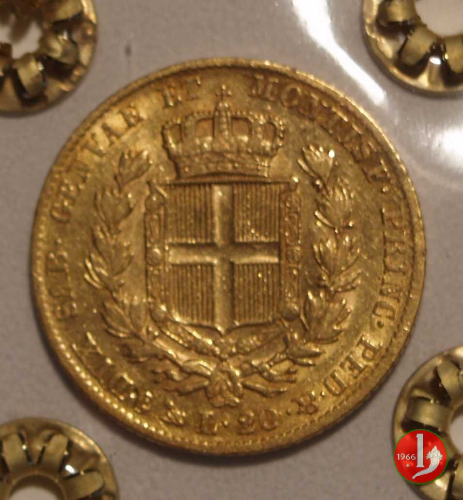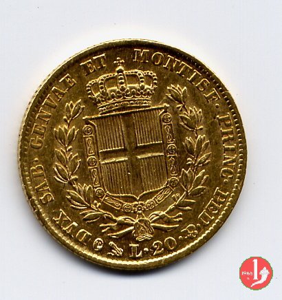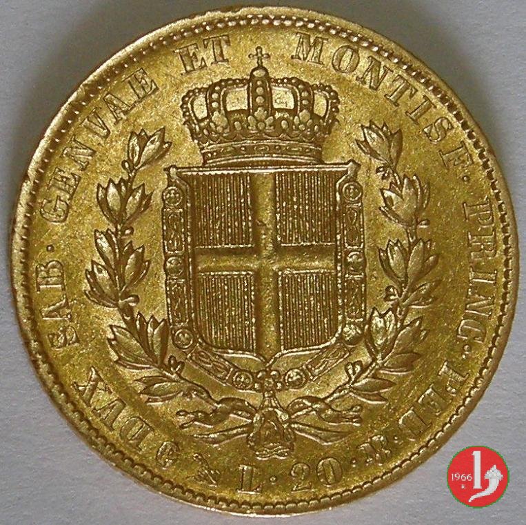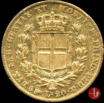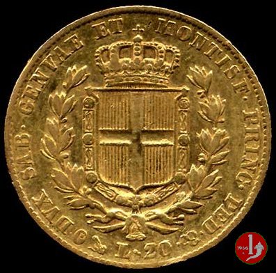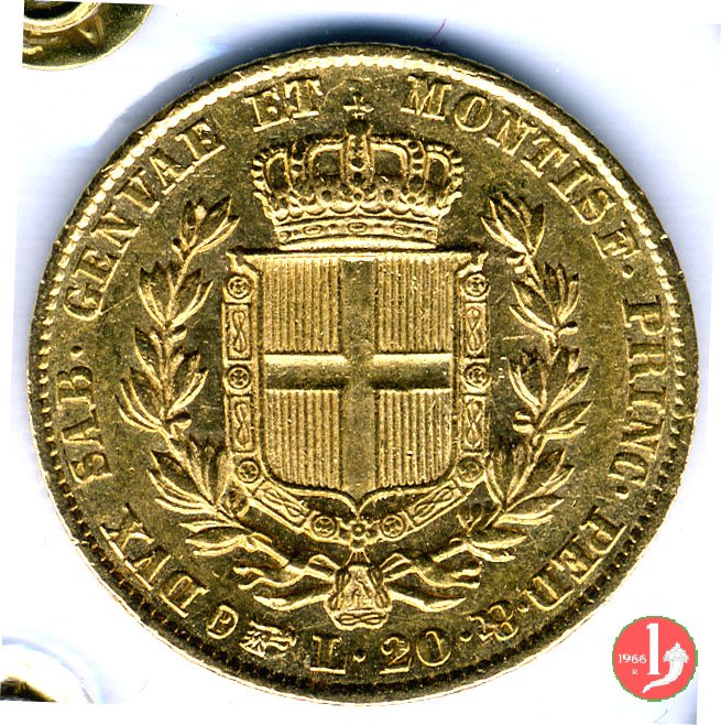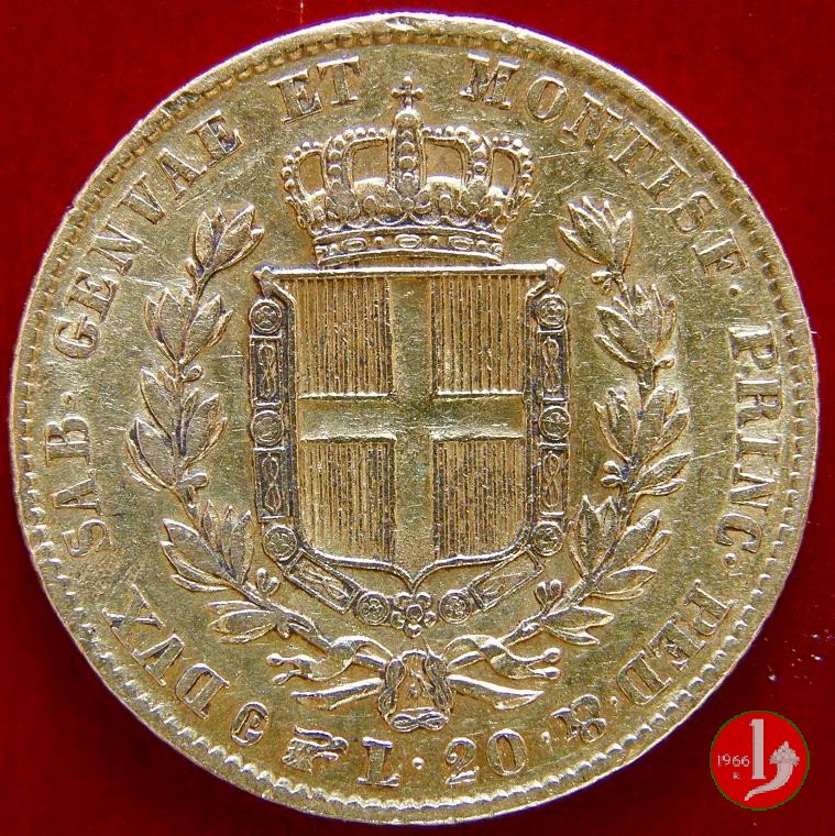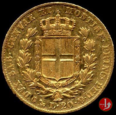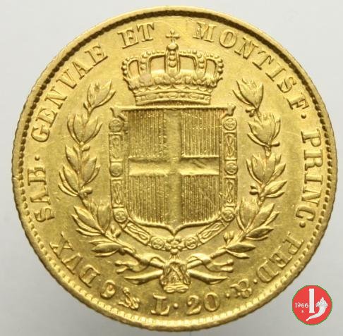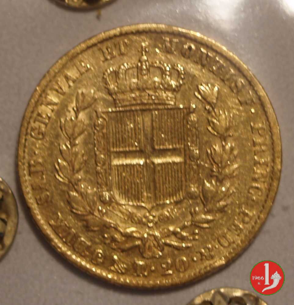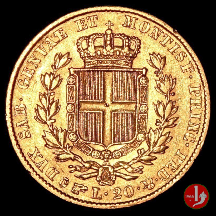 Testa del Re a sinistra, al di sotto della quale si trova il millesimo. Lungo il bordo, CAR • ALBERTVS D • G • REX SARD • CYP • ET HIER •. Sul taglio del collo indicazione dell'autore (F per Ferraris). Stemma con croce Sabauda sovrastato da Corona Reale e fregiato dal collare dell'Annunziata tra rami di lauro. Lungo il bordo: DVX SAB • GENVAE ET MONTISF • PRINC • PED • & •. In basso, da sinistra a destra, segno di zecca e indicazione del valore (L • 20).