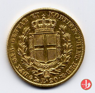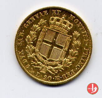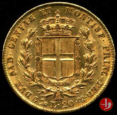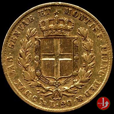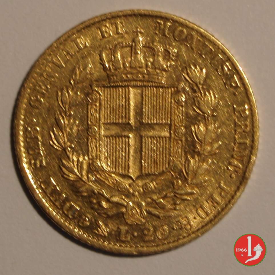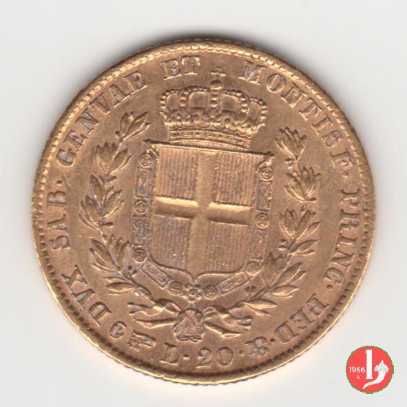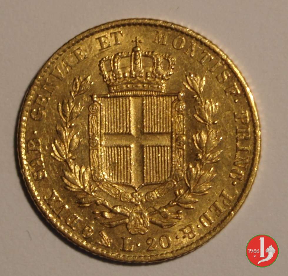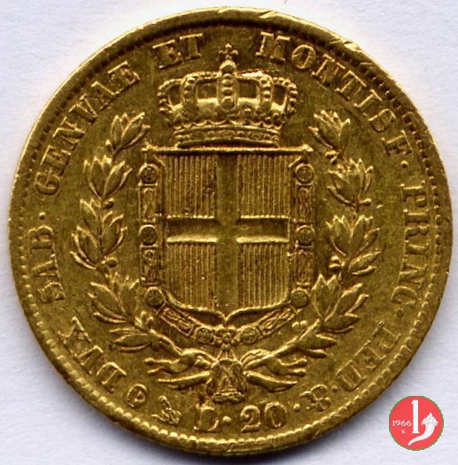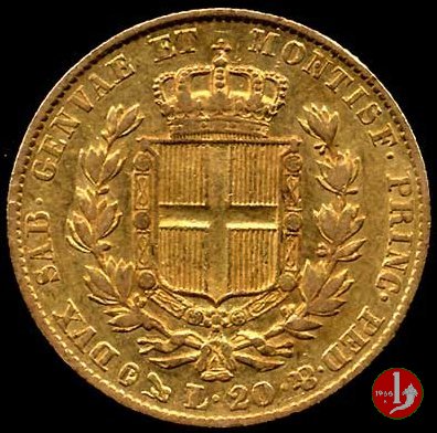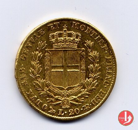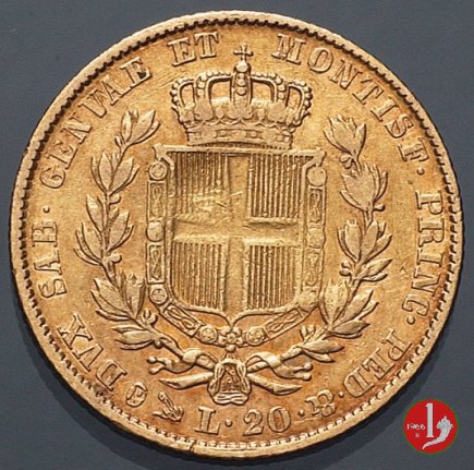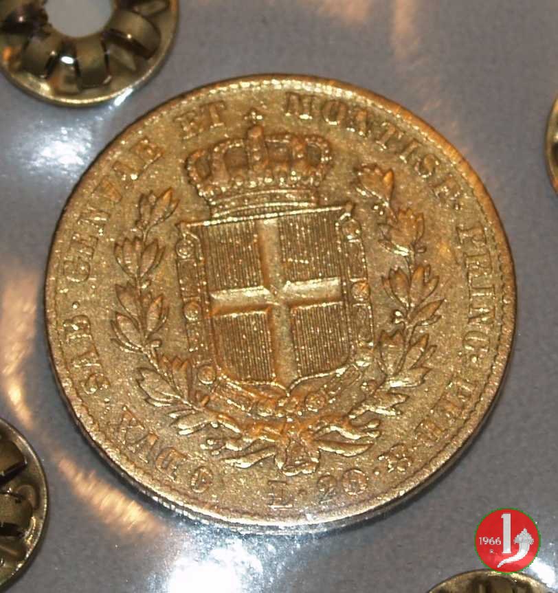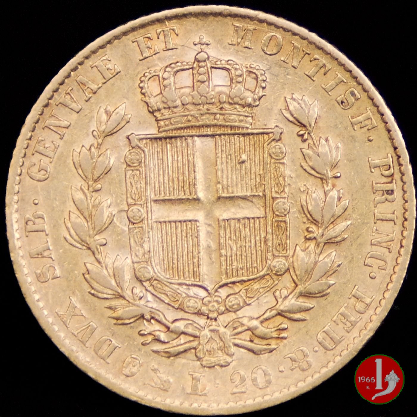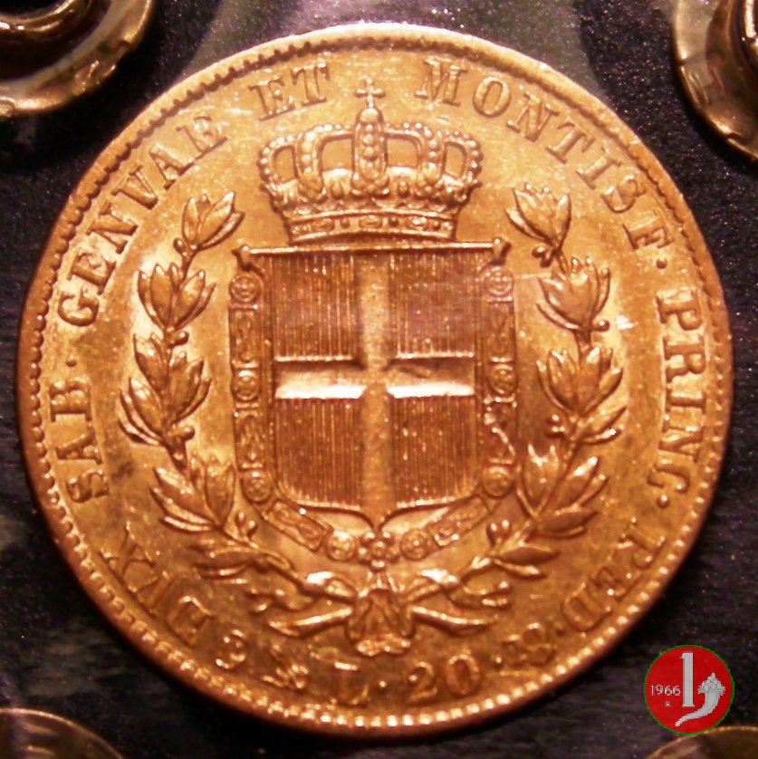 Testa del Re a sinistra, al di sotto della quale si trova il millesimo. Lungo il bordo, CAR • ALBERTVS D • G • REX SARD • CYP • ET HIER •. Sul taglio del collo indicazione dell'autore (F per Ferraris). Stemma con croce Sabauda sovrastato da Corona Reale e fregiato dal collare dell'Annunziata tra rami di lauro. Lungo il bordo: DVX SAB • GENVAE ET MONTISF • PRINC • PED • & •. In basso, da sinistra a destra, segno di zecca e indicazione del valore (L • 20).