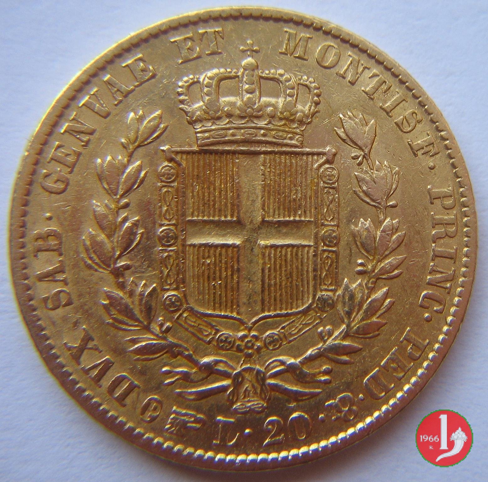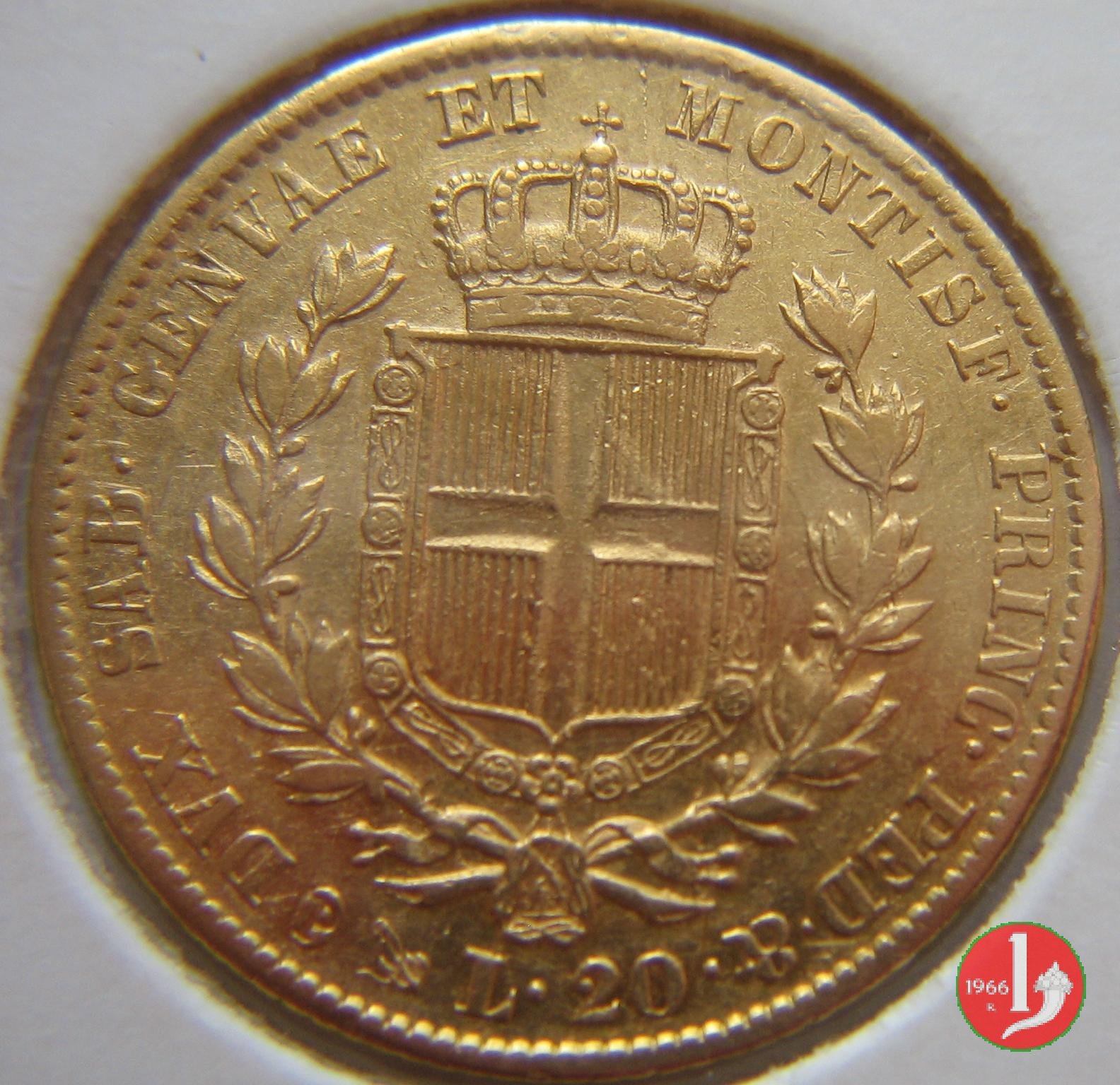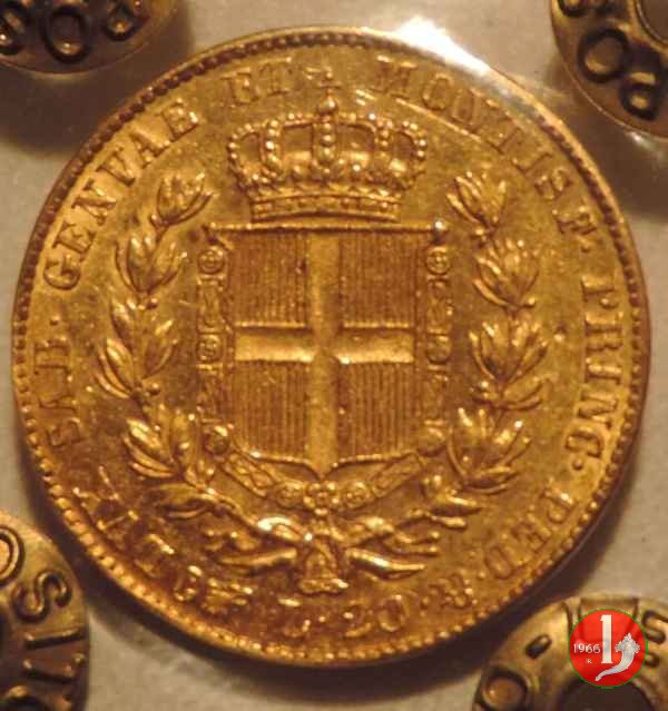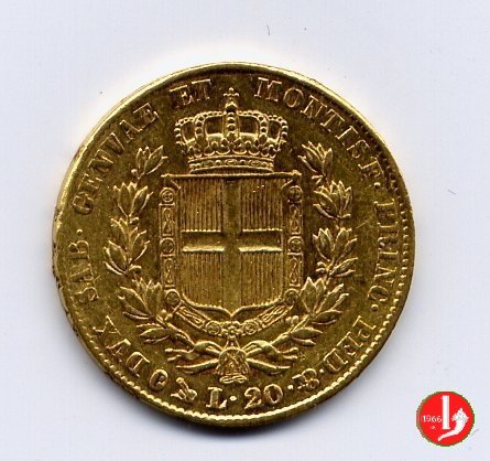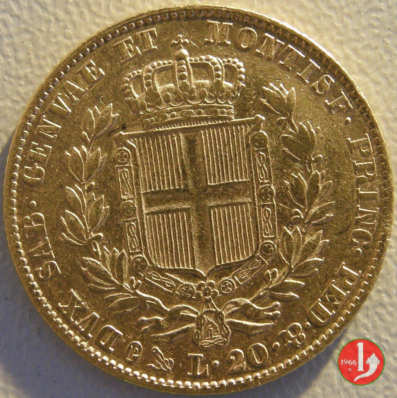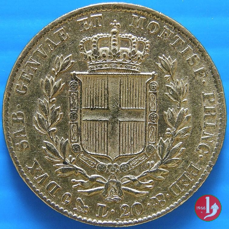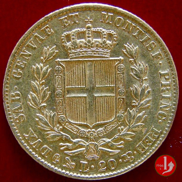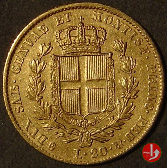 Testa del Re a sinistra, al di sotto della quale si trova il millesimo. Lungo il bordo, CAR • ALBERTVS D • G • REX SARD • CYP • ET HIER •. Sul taglio del collo indicazione dell'autore (F per Ferraris). Stemma con croce Sabauda sovrastato da Corona Reale e fregiato dal collare dell'Annunziata tra rami di lauro. Lungo il bordo: DVX SAB • GENVAE ET MONTISF • PRINC • PED • & •. In basso, da sinistra a destra, segno di zecca e indicazione del valore (L • 20).