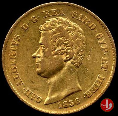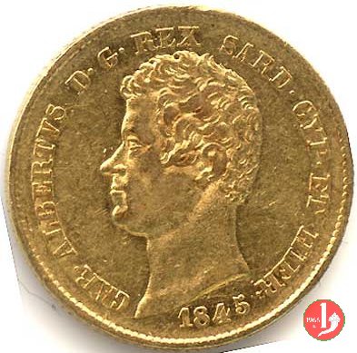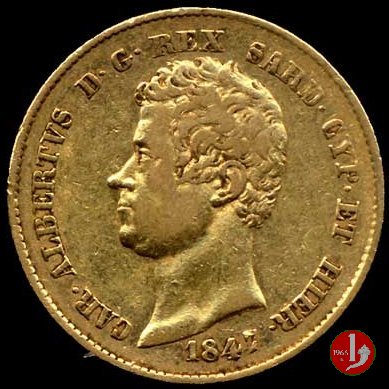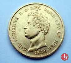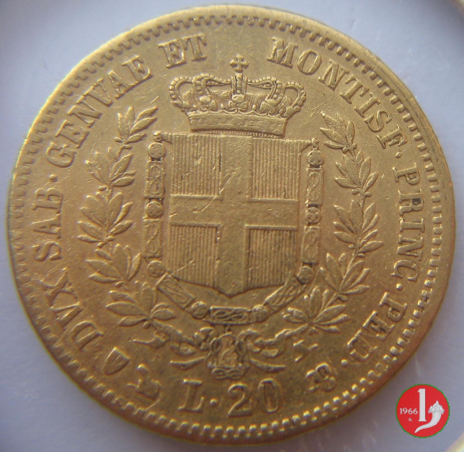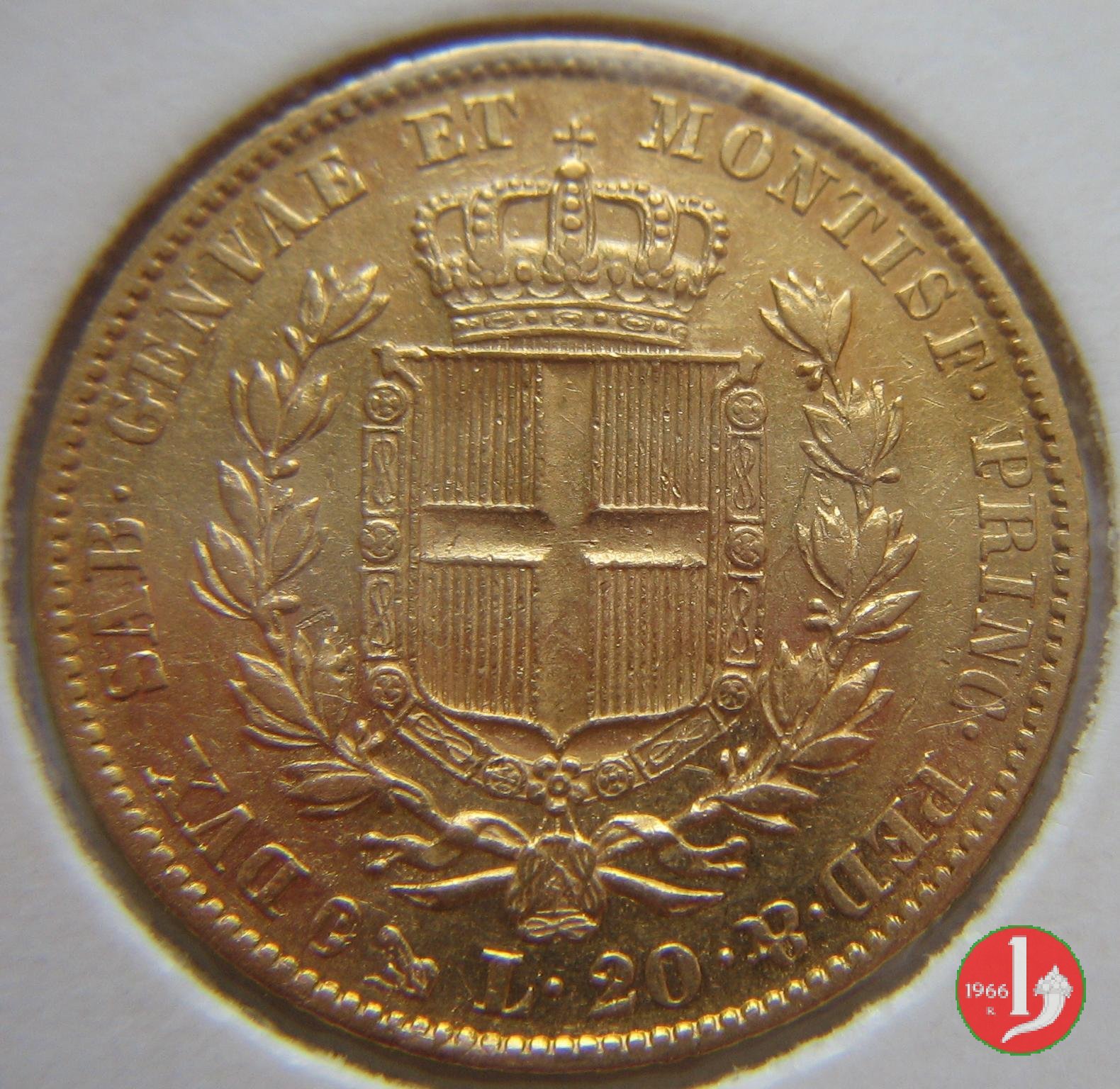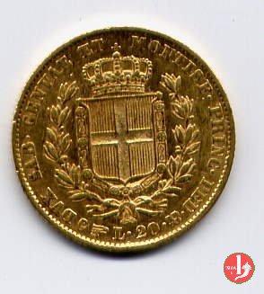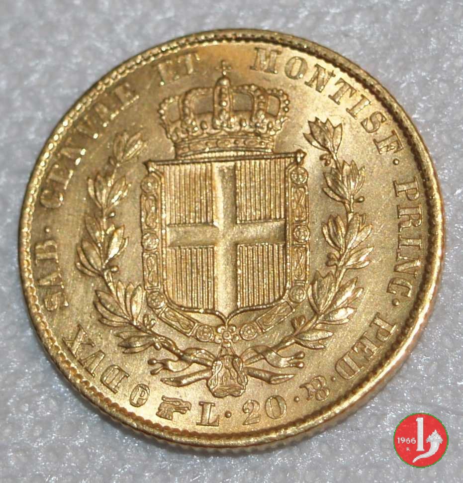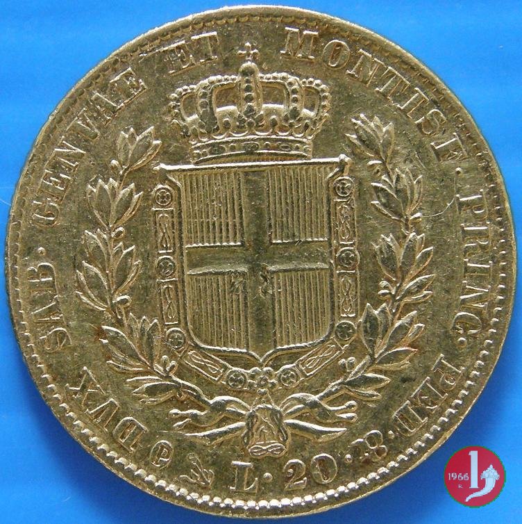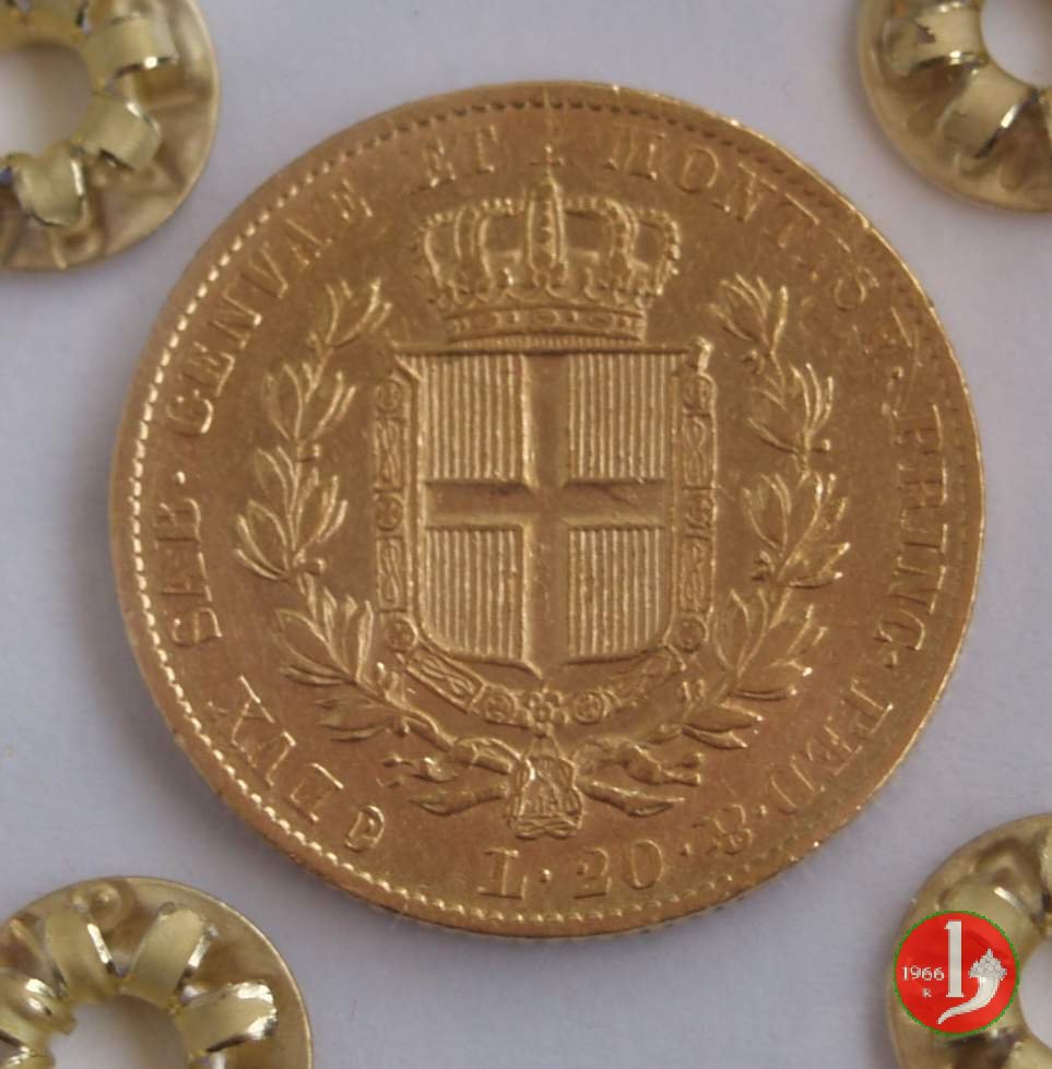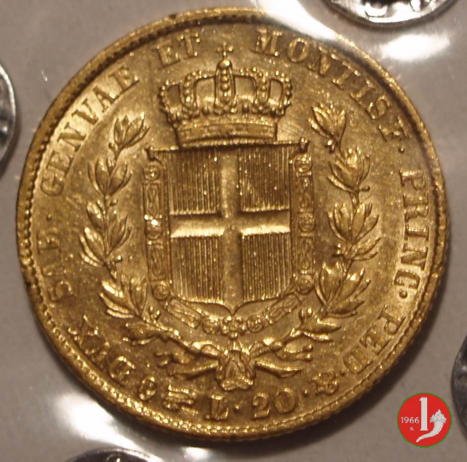 Testa del Re a sinistra, al di sotto della quale si trova il millesimo. Lungo il bordo, CAR • ALBERTVS D • G • REX SARD • CYP • ET HIER •. Sul taglio del collo indicazione dell'autore (F per Ferraris). Stemma con croce Sabauda sovrastato da Corona Reale e fregiato dal collare dell'Annunziata tra rami di lauro. Lungo il bordo: DVX SAB • GENVAE ET MONTISF • PRINC • PED • & •. In basso, da sinistra a destra, segno di zecca e indicazione del valore (L • 20).