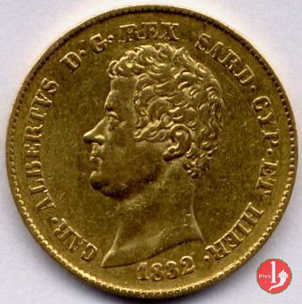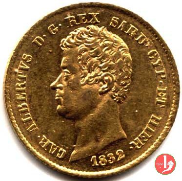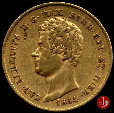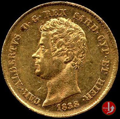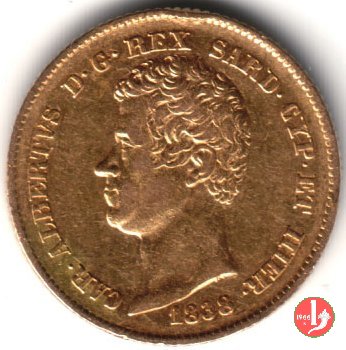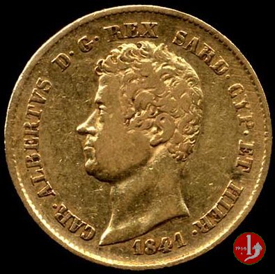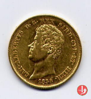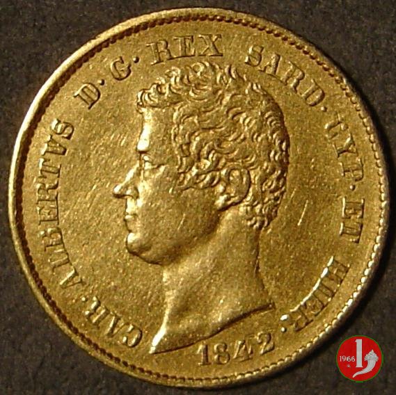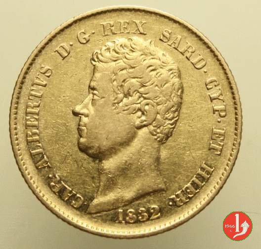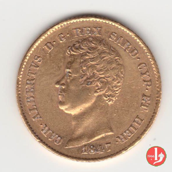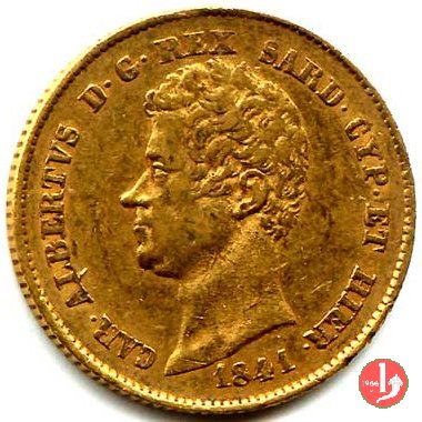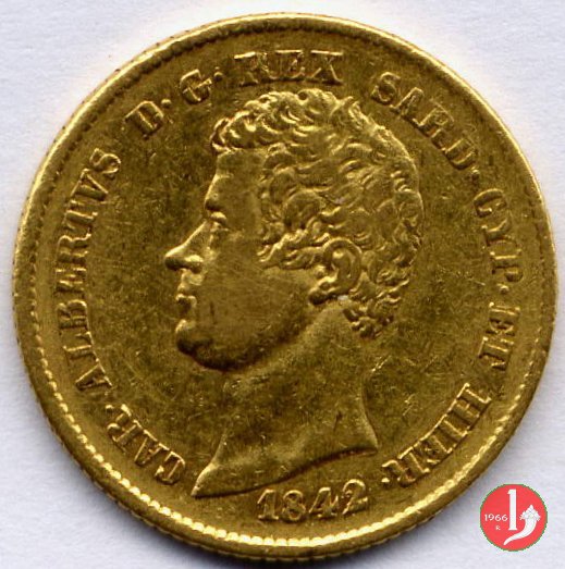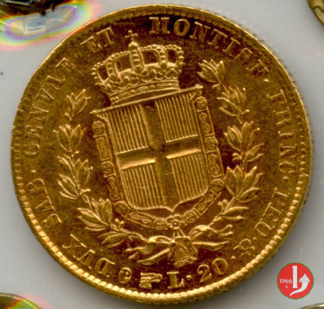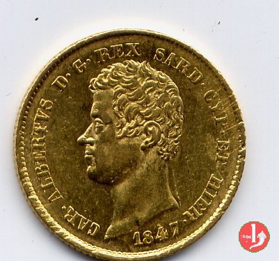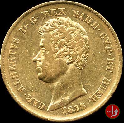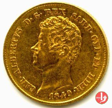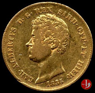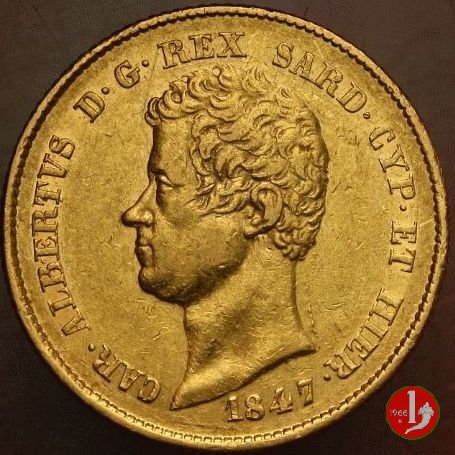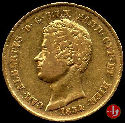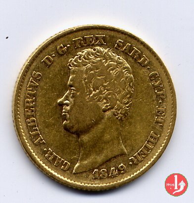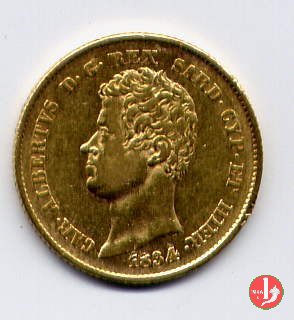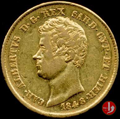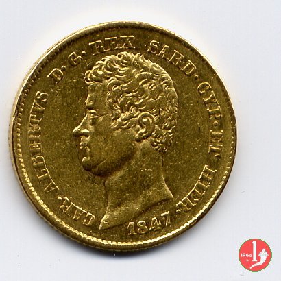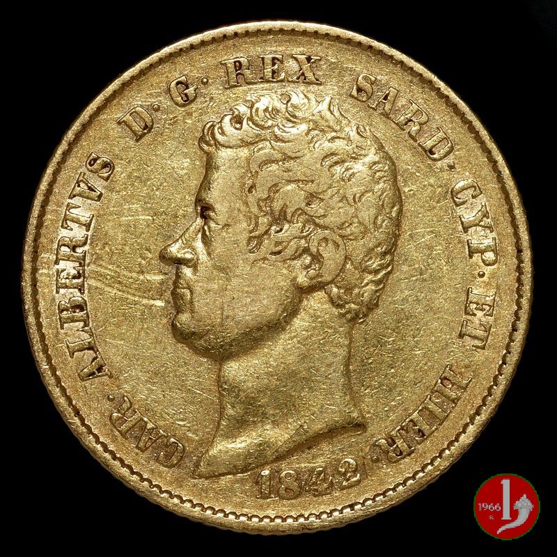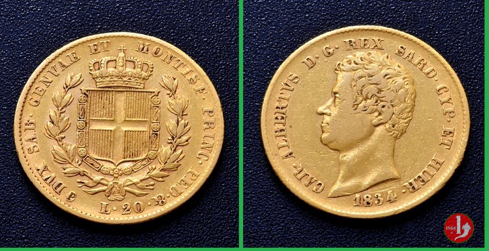 Testa del Re a sinistra, al di sotto della quale si trova il millesimo. Lungo il bordo, CAR • ALBERTVS D • G • REX SARD • CYP • ET HIER •. Sul taglio del collo indicazione dell'autore (F per Ferraris). Stemma con croce Sabauda sovrastato da Corona Reale e fregiato dal collare dell'Annunziata tra rami di lauro. Lungo il bordo: DVX SAB • GENVAE ET MONTISF • PRINC • PED • & •. In basso, da sinistra a destra, segno di zecca e indicazione del valore (L • 20).