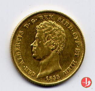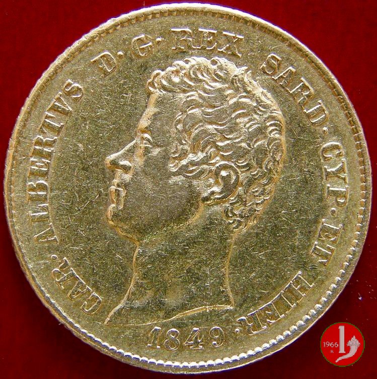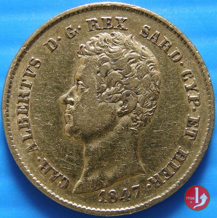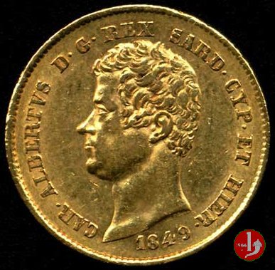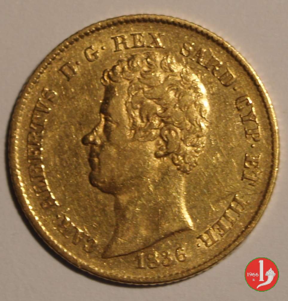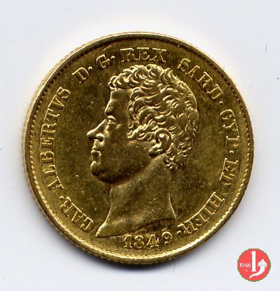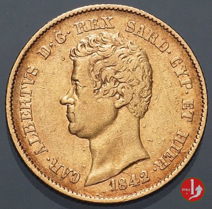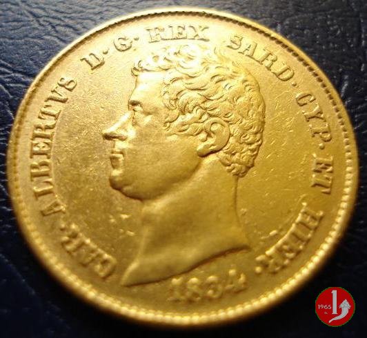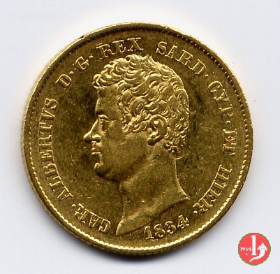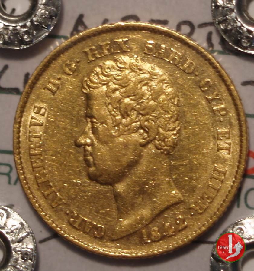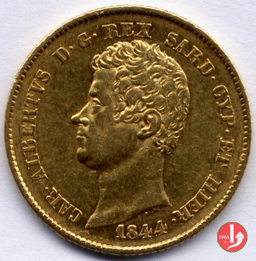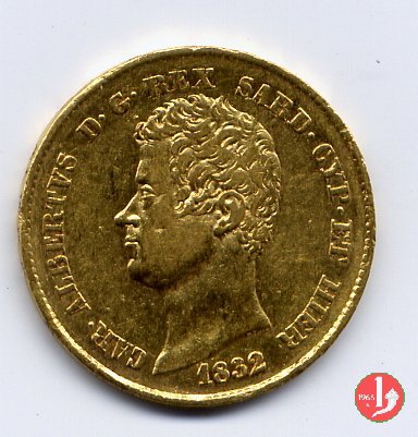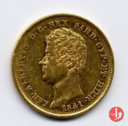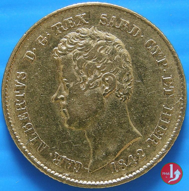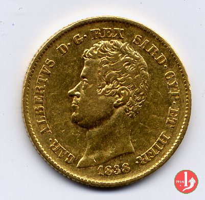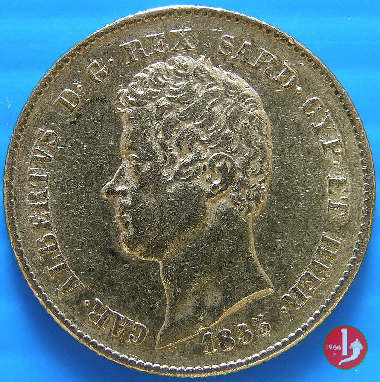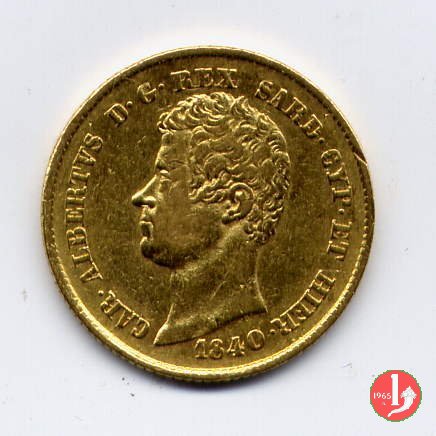Testa del Re a sinistra, al di sotto della quale si trova il millesimo. Lungo il bordo, CAR • ALBERTVS D • G • REX SARD • CYP • ET HIER •. Sul taglio del collo indicazione dell'autore (F per Ferraris). Stemma con croce Sabauda sovrastato da Corona Reale e fregiato dal collare dell'Annunziata tra rami di lauro. Lungo il bordo: DVX SAB • GENVAE ET MONTISF • PRINC • PED • & •. In basso, da sinistra a destra, segno di zecca e indicazione del valore (L • 20).