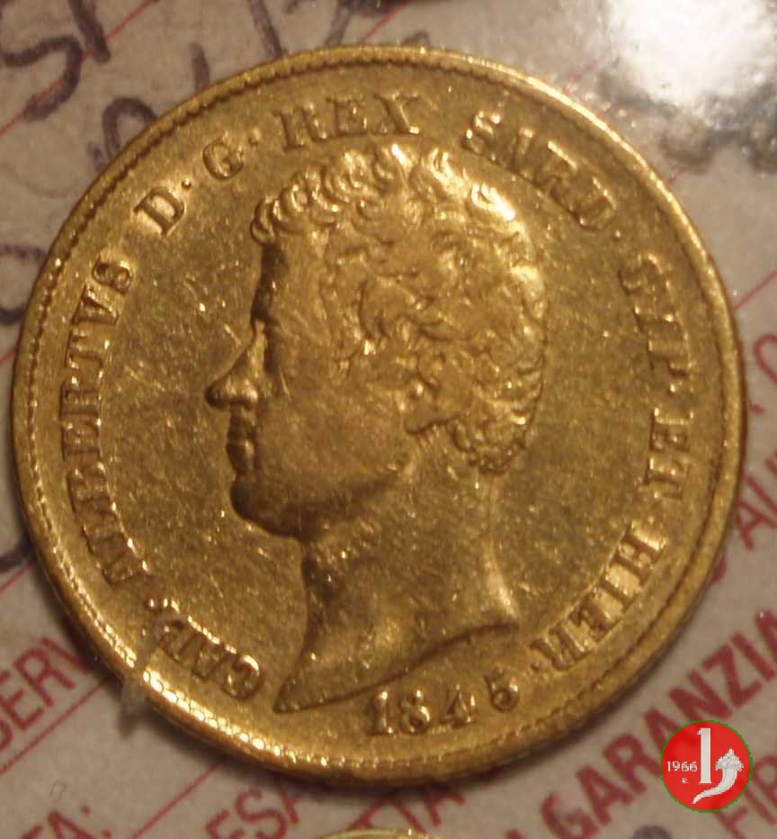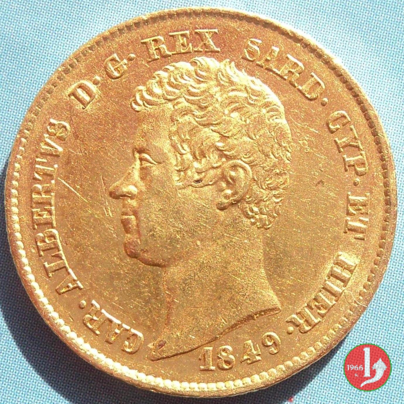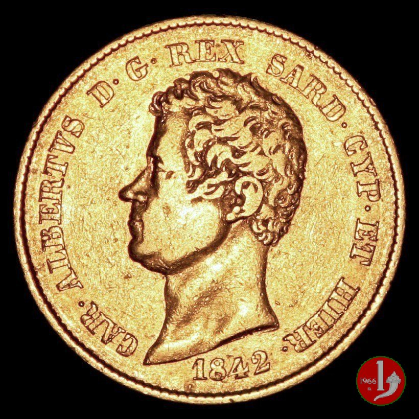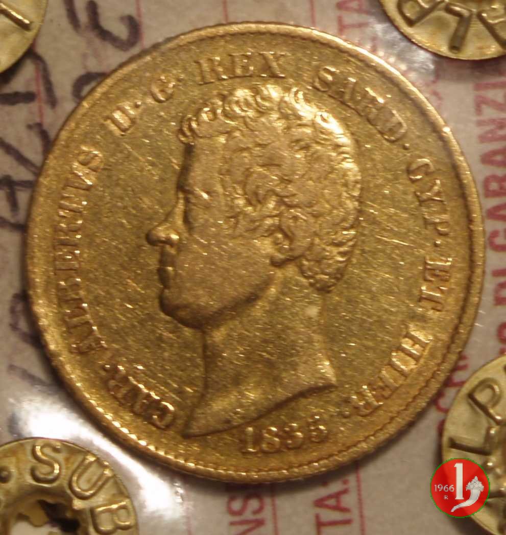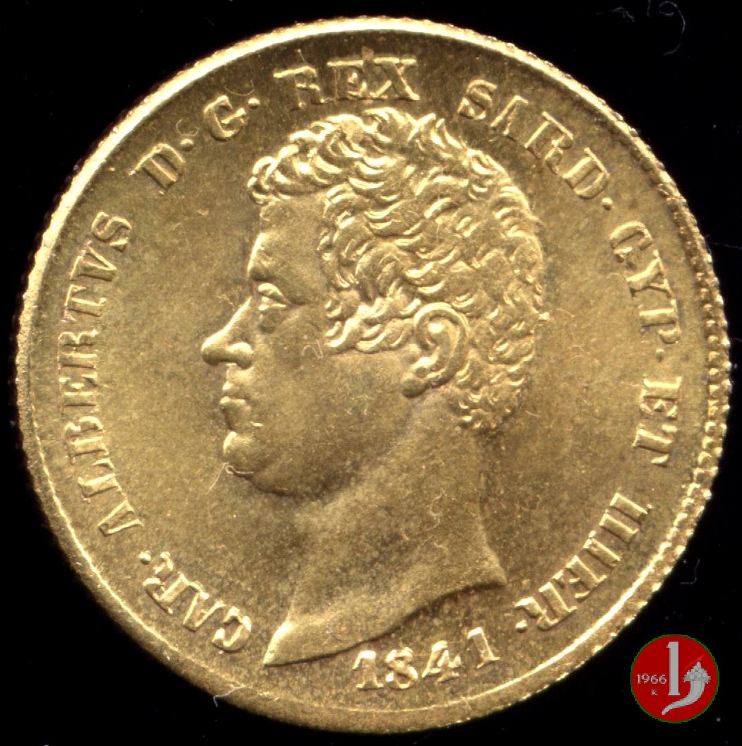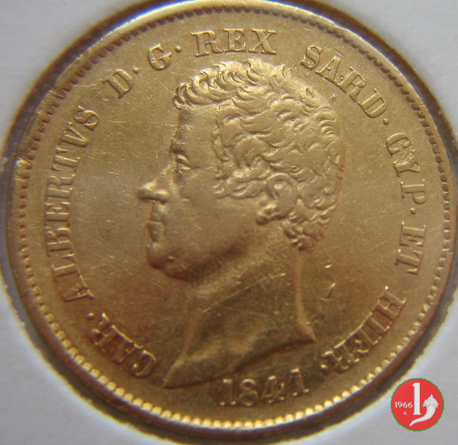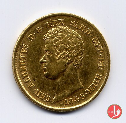 Testa del Re a sinistra, al di sotto della quale si trova il millesimo. Lungo il bordo, CAR • ALBERTVS D • G • REX SARD • CYP • ET HIER •. Sul taglio del collo indicazione dell'autore (F per Ferraris). Stemma con croce Sabauda sovrastato da Corona Reale e fregiato dal collare dell'Annunziata tra rami di lauro. Lungo il bordo: DVX SAB • GENVAE ET MONTISF • PRINC • PED • & •. In basso, da sinistra a destra, segno di zecca e indicazione del valore (L • 20).
