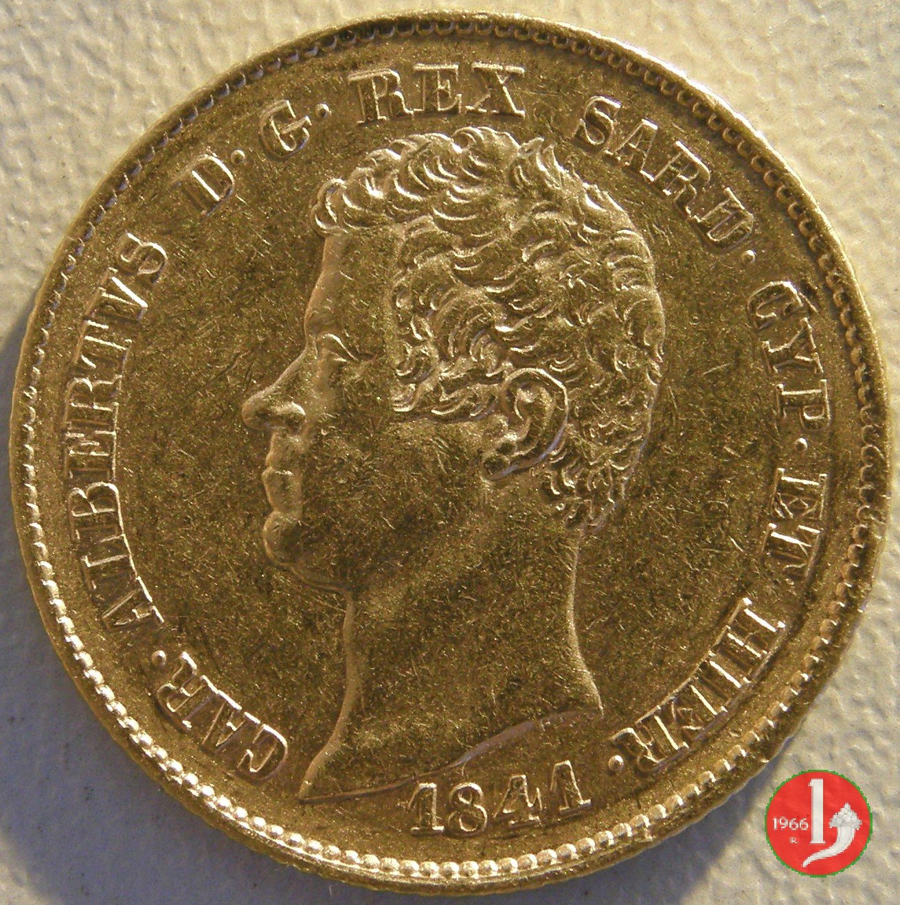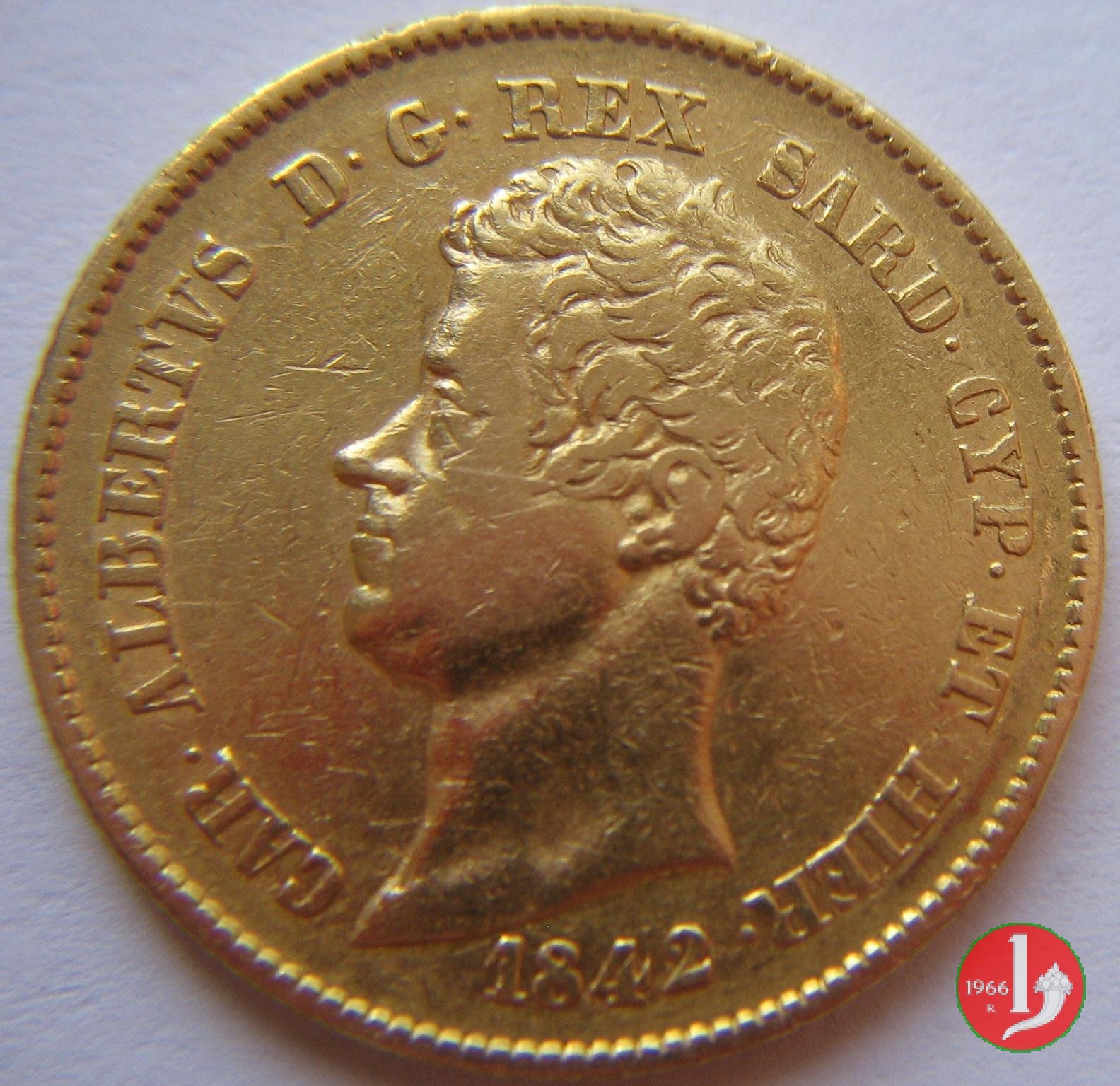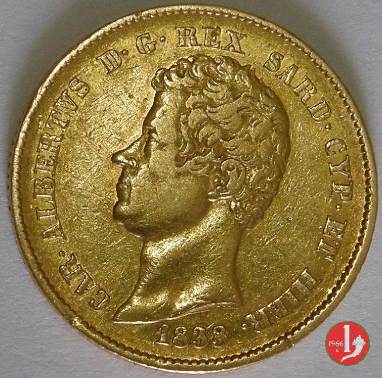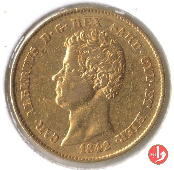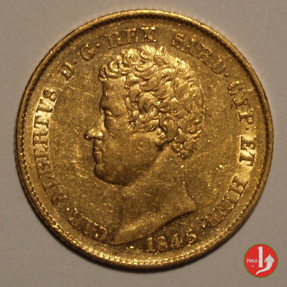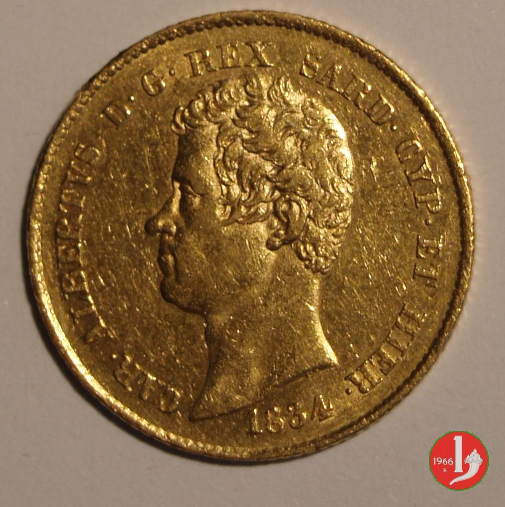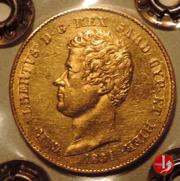Testa del Re a sinistra, al di sotto della quale si trova il millesimo. Lungo il bordo, CAR • ALBERTVS D • G • REX SARD • CYP • ET HIER •. Sul taglio del collo indicazione dell'autore (F per Ferraris). Stemma con croce Sabauda sovrastato da Corona Reale e fregiato dal collare dell'Annunziata tra rami di lauro. Lungo il bordo: DVX SAB • GENVAE ET MONTISF • PRINC • PED • & •. In basso, da sinistra a destra, segno di zecca e indicazione del valore (L • 20).
