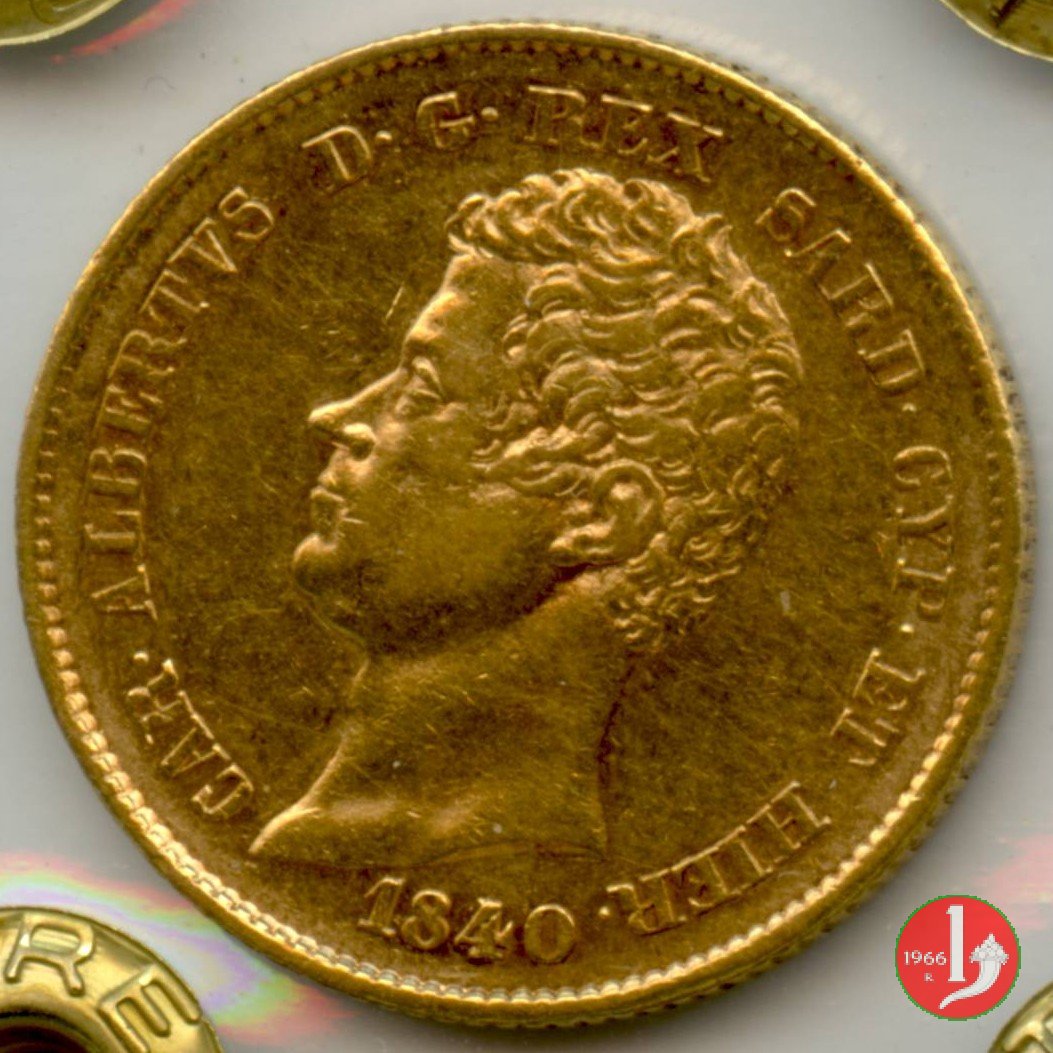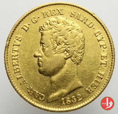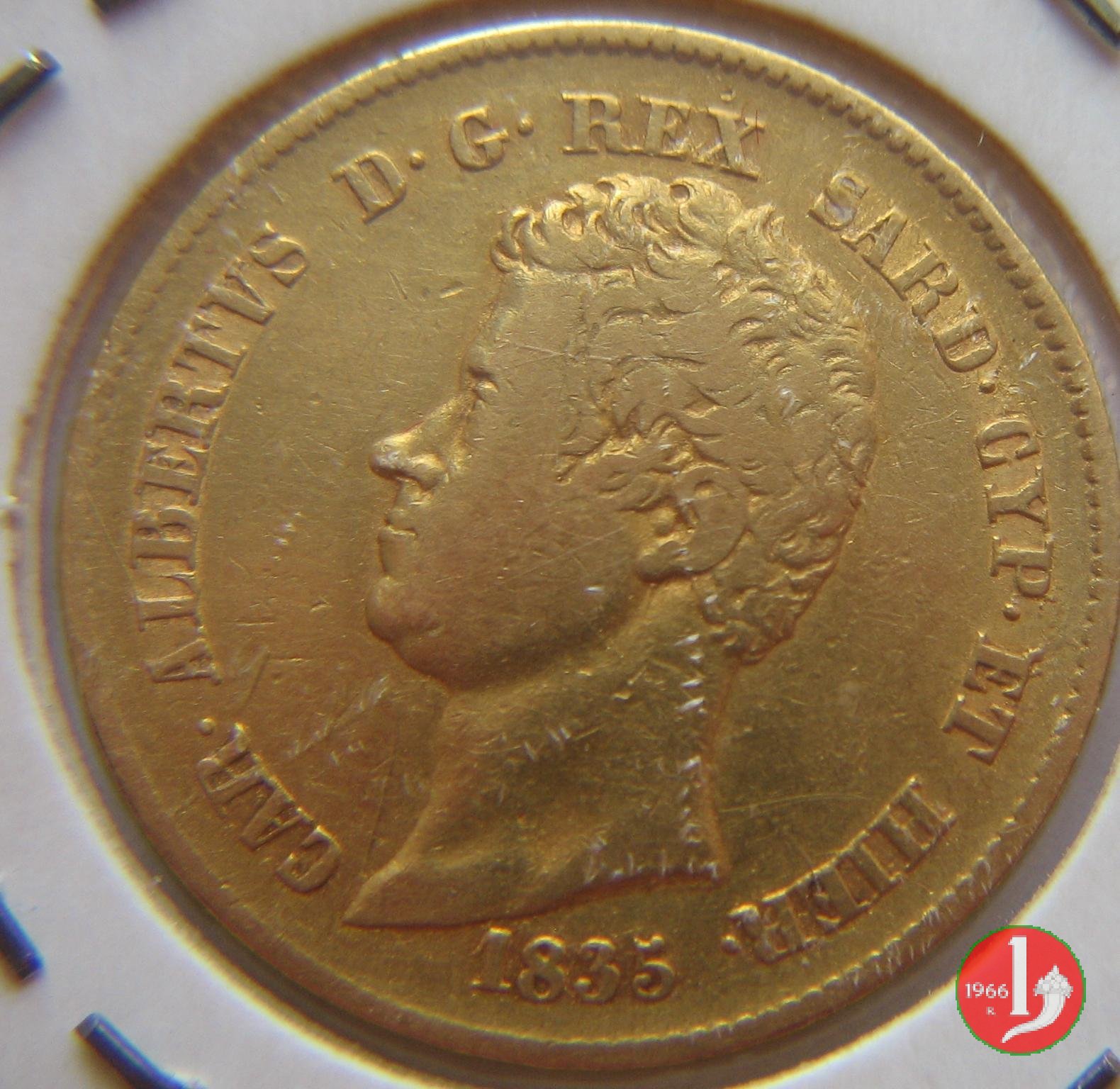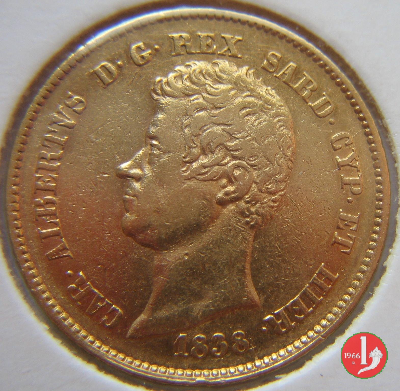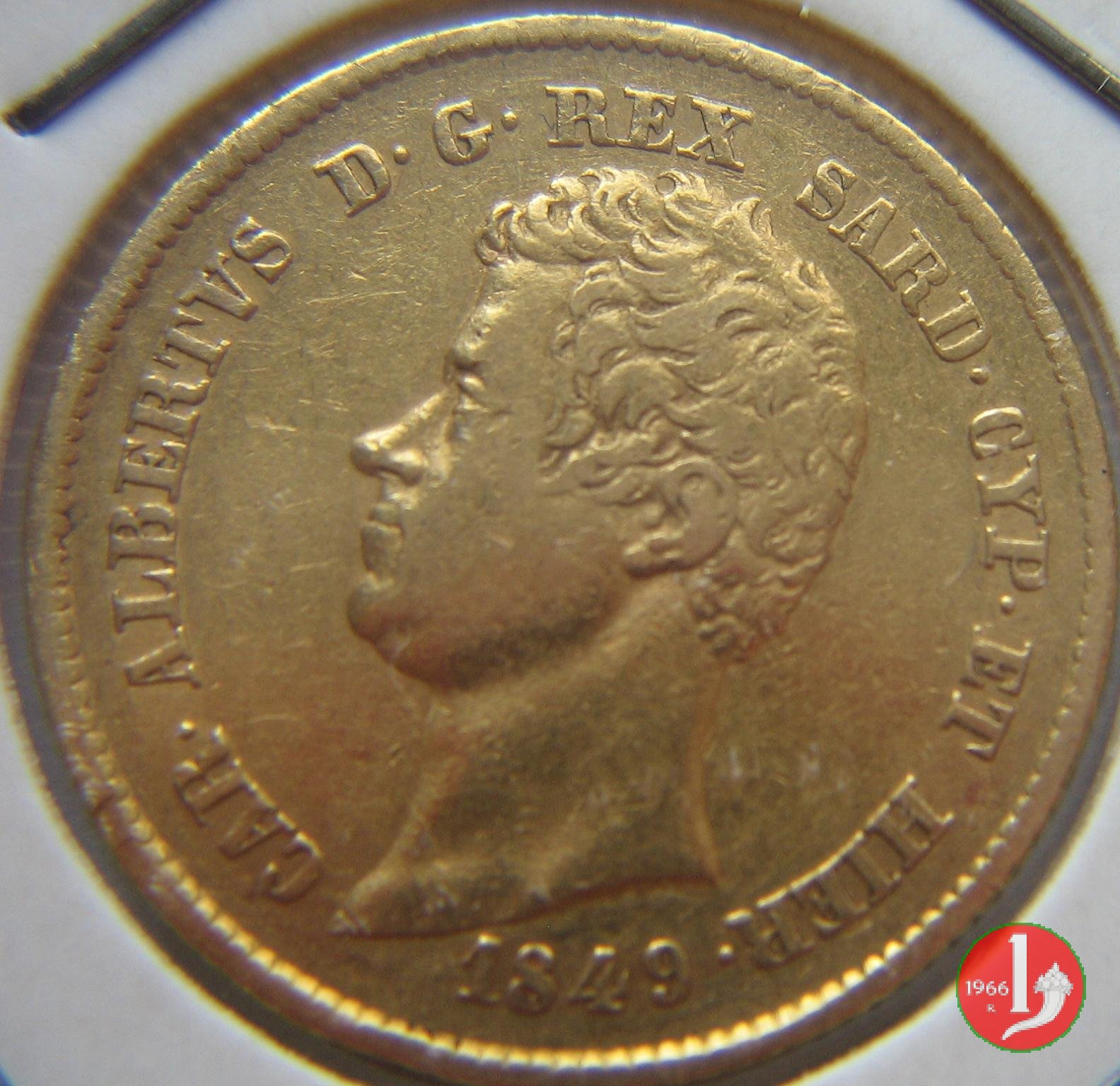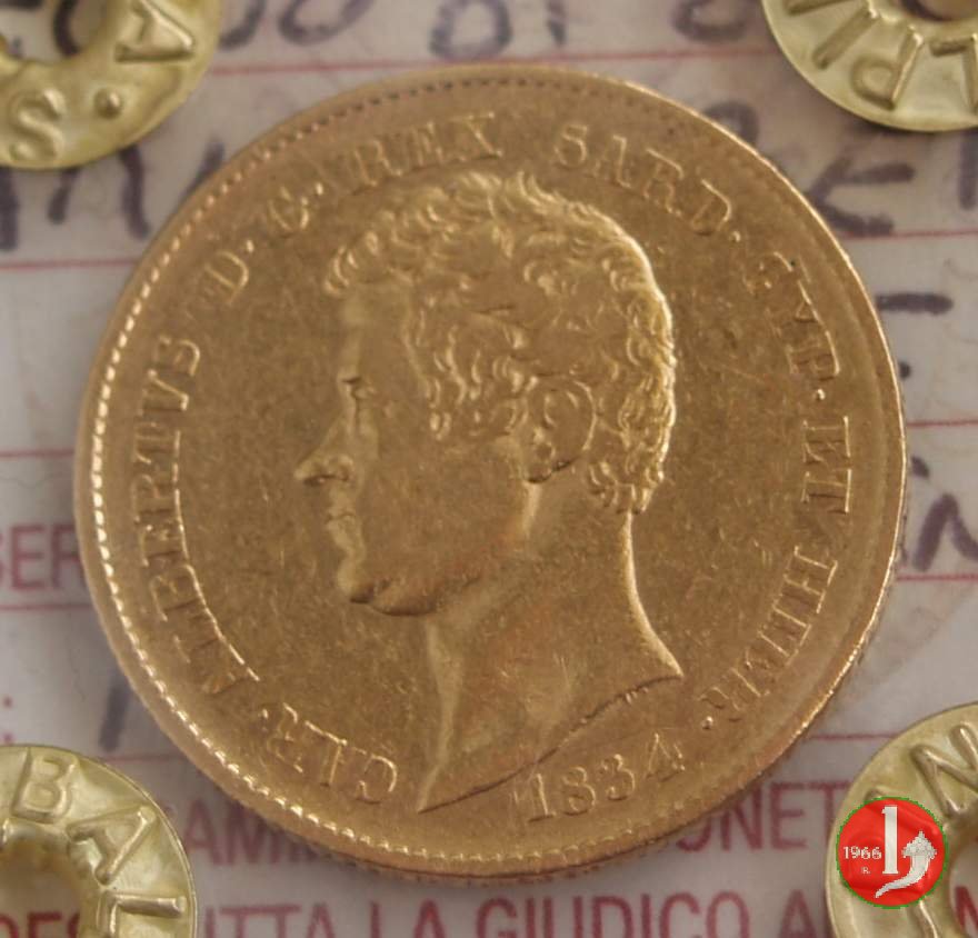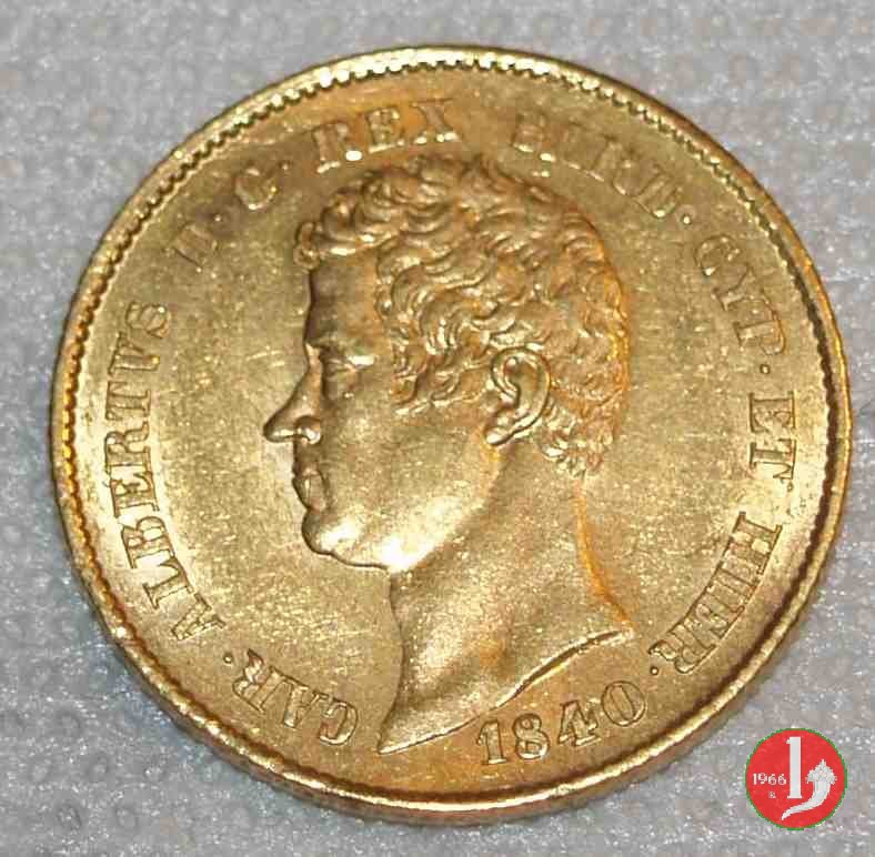 Testa del Re a sinistra, al di sotto della quale si trova il millesimo. Lungo il bordo, CAR • ALBERTVS D • G • REX SARD • CYP • ET HIER •. Sul taglio del collo indicazione dell'autore (F per Ferraris). Stemma con croce Sabauda sovrastato da Corona Reale e fregiato dal collare dell'Annunziata tra rami di lauro. Lungo il bordo: DVX SAB • GENVAE ET MONTISF • PRINC • PED • & •. In basso, da sinistra a destra, segno di zecca e indicazione del valore (L • 20).