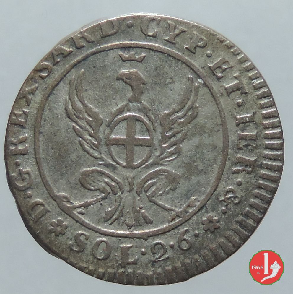 Semibusto del Re volto a destra. Intorno CAROLUS • EMANUEL • IV •. Sotto il collo del Re il millesimo. Nel campo, aquila sabauda ad ali spiegate con corona all'interno di una circonferenza. Intorno: rosetta, D • G • REX • SARD • CYP • ET • IER • & •, rosetta e indicazione del valore (SOL • 2 • 6 •).