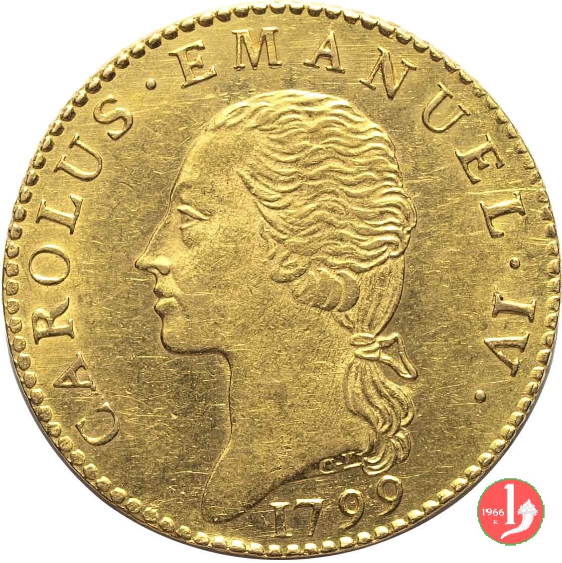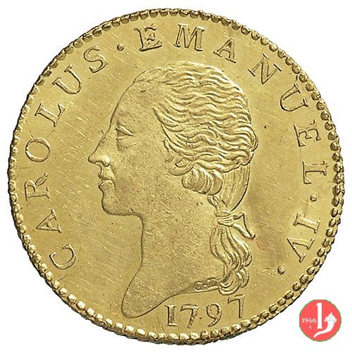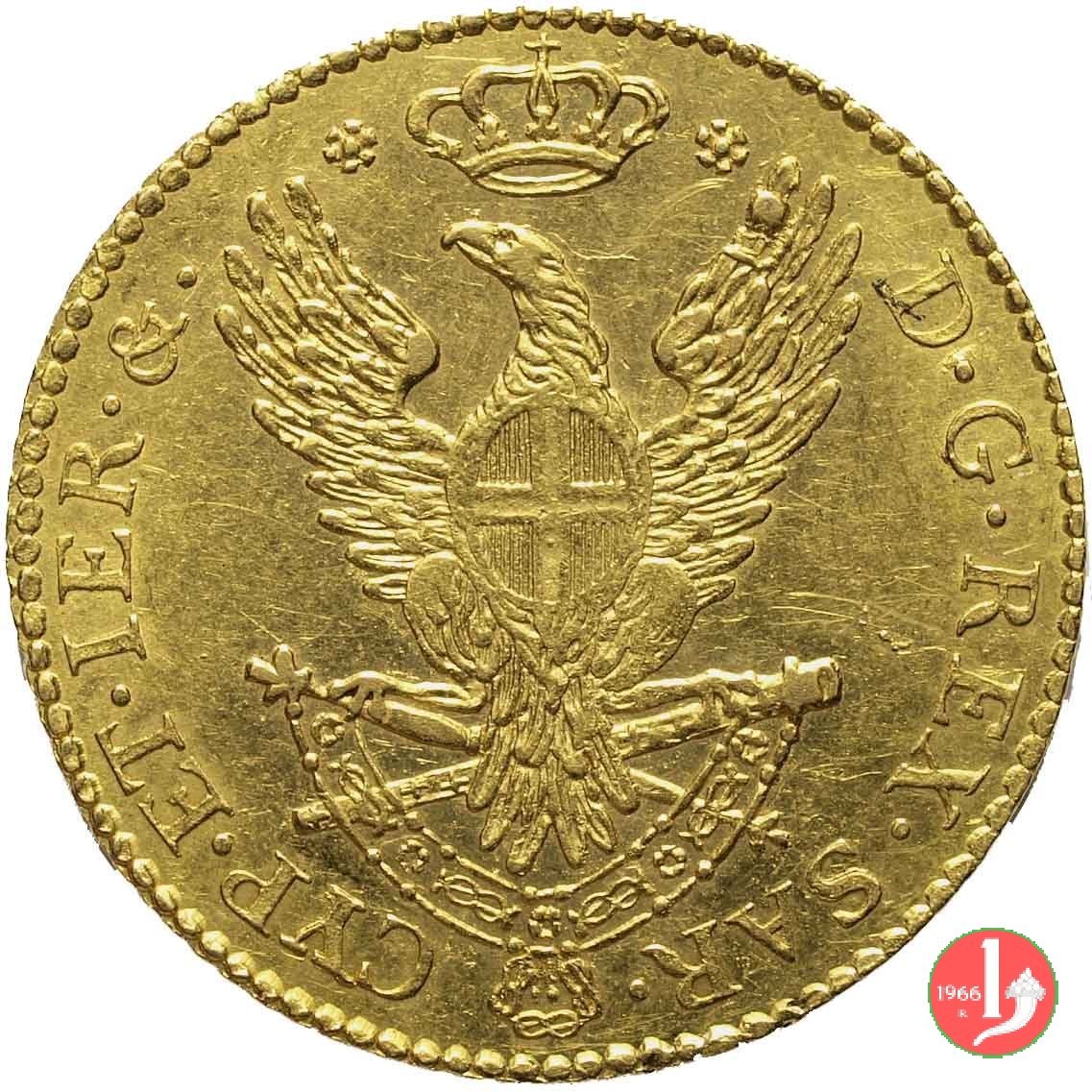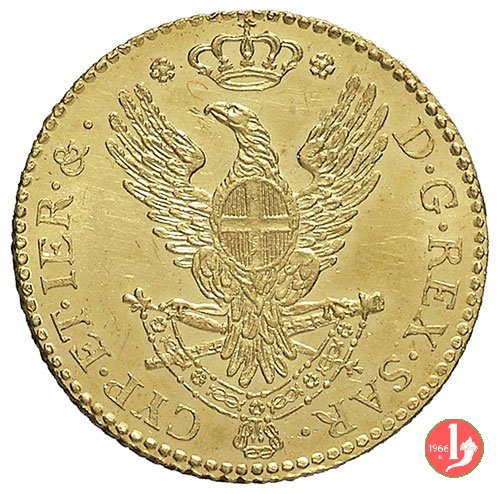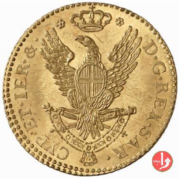 Busto del Re volto a sinistra. Intorno CAROLUS • EMANUEL • IV •, sotto il millesimo. Sul taglio del collo indicazione dell'autore (C • L • per Carlo Lavy). Aquila sabauda ad ali spiegate con stemma, sormontata da corona reale tra due rosette mentre ghermisce un bastone e uno scettro ornati dal collare dell'Annunziata. Intorno D • G • REX • SAR • CYP • ET • IER • & •.