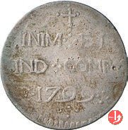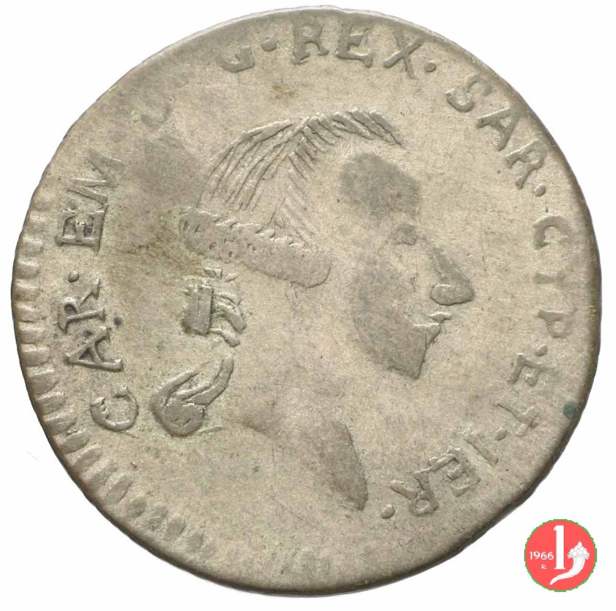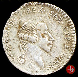 Testa del Re a destra, intorno CAR • EM • D • G • REX • SAR • CYP • ET • IER •. Su quattro righe: una croce, INIM quattro punti a rombo EI •, IND quattro punti a rombo CONF • , il millesimo tra due gruppi di quattro punti a rombo, quattro punti a rombo.