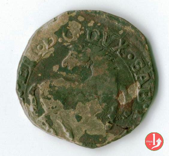 Immagine di un cavallo andante a destra, ma rivolto verso sinistra, in esergo tra due punti la data, intorno CAR • EM • D • G • DUX • SAB • P • P • Scudo semplice coronato affiancato da due rosette a cinque petali, intorno: stella PATRIAE • LIBERTATE • SERVATA