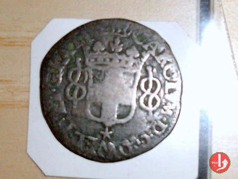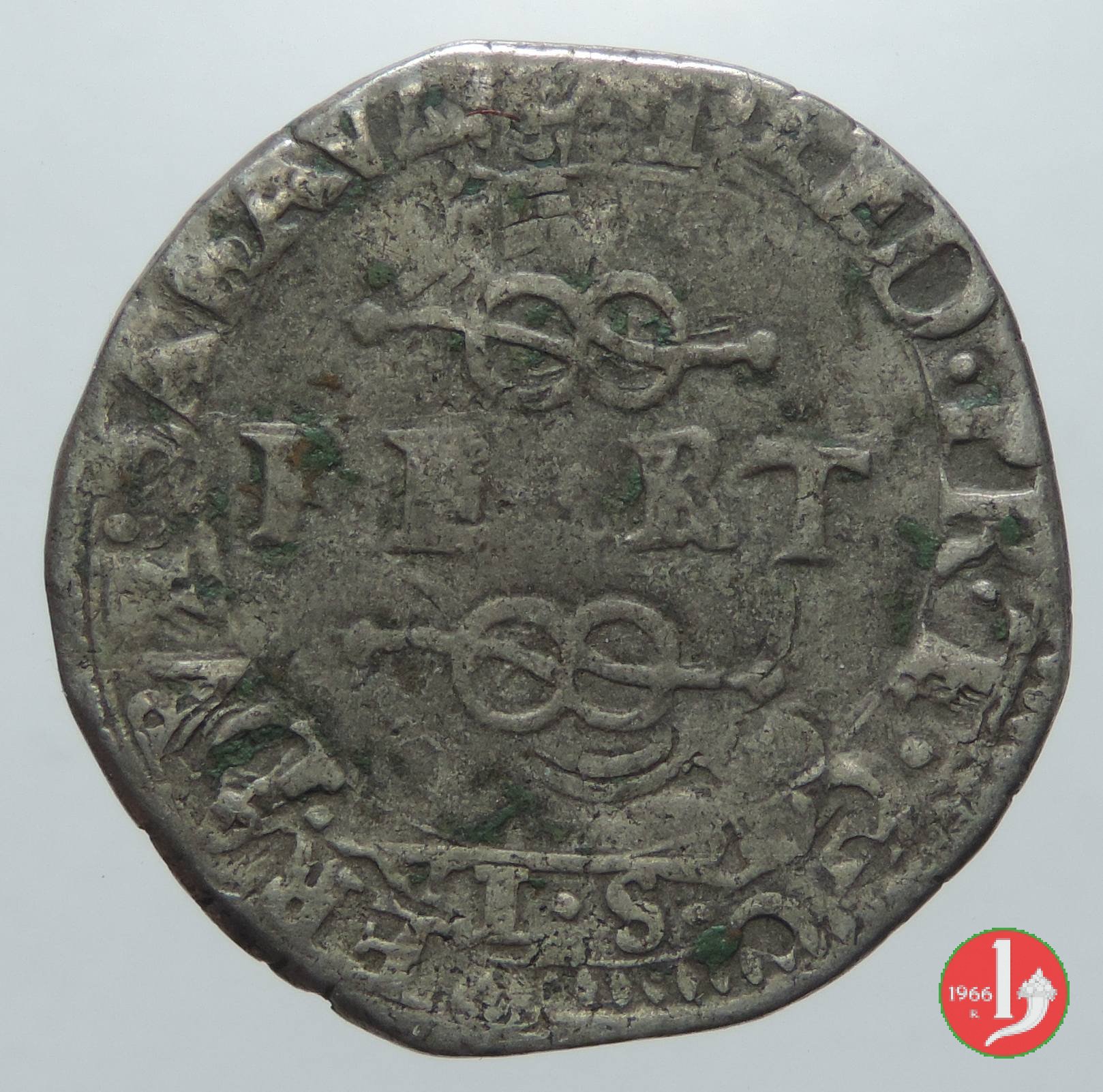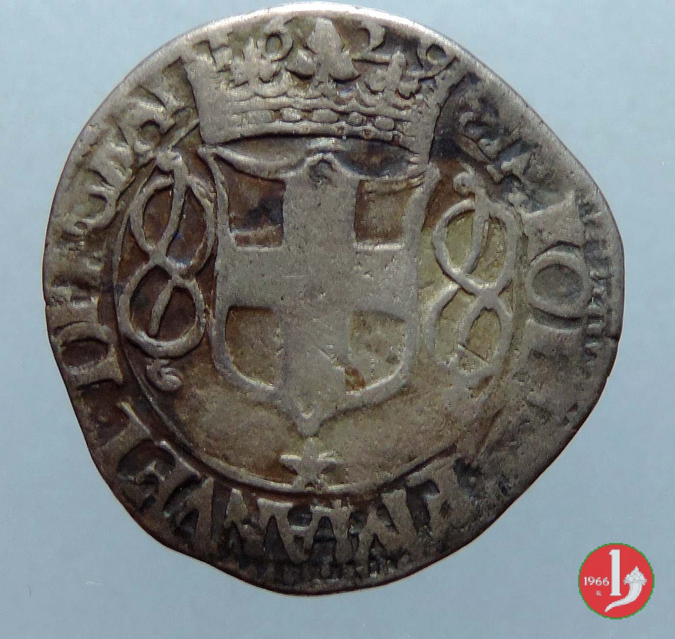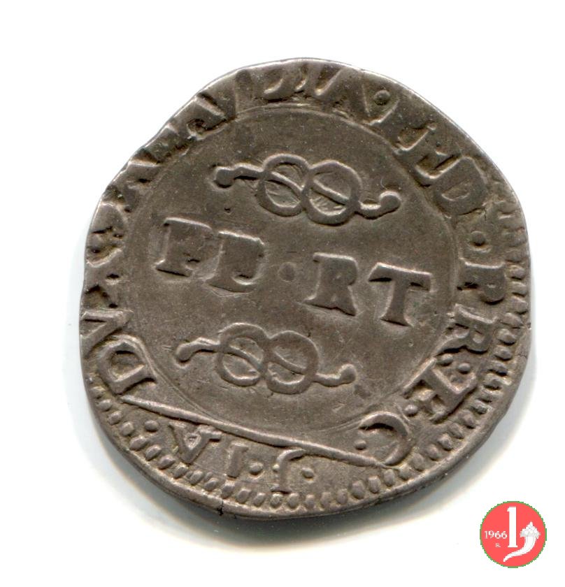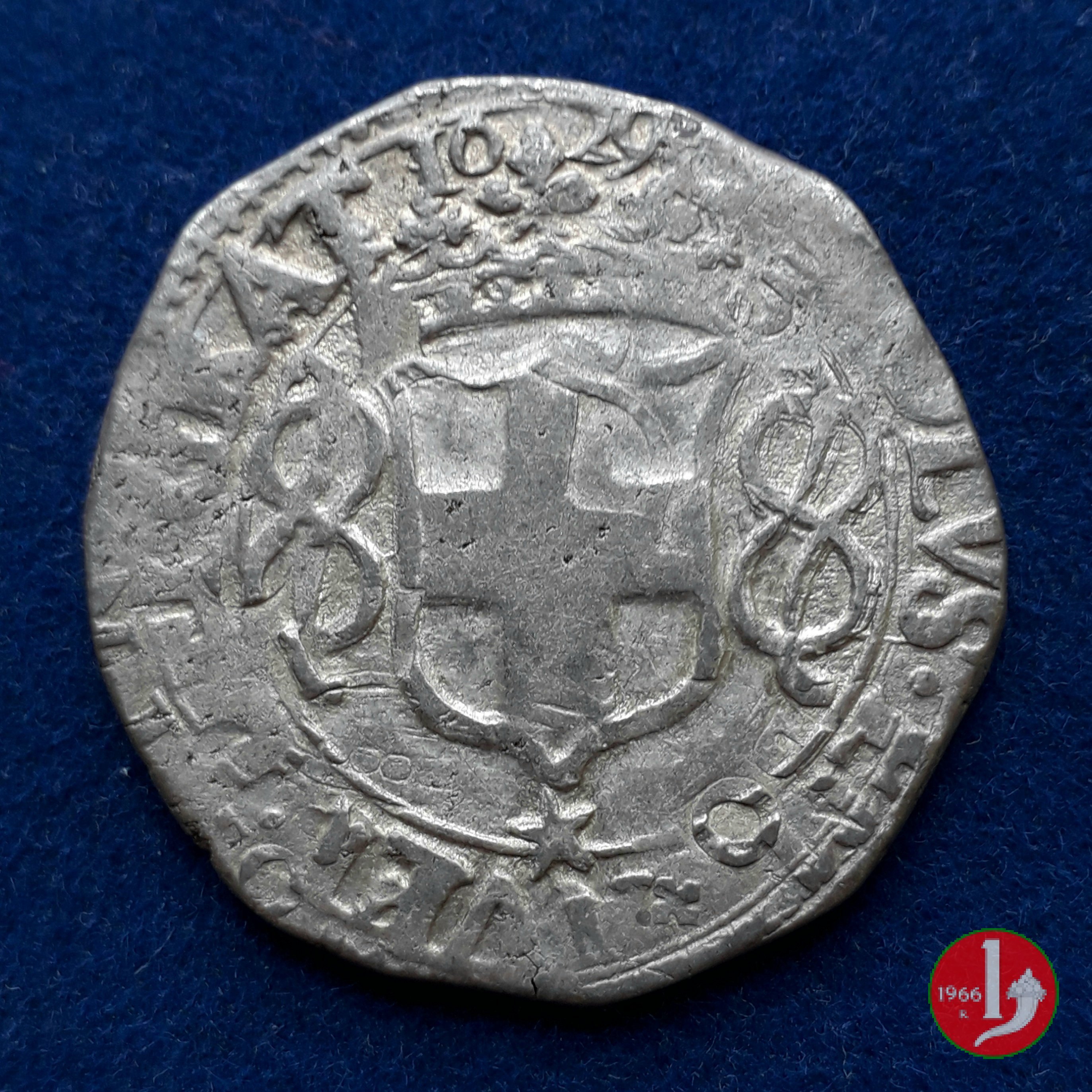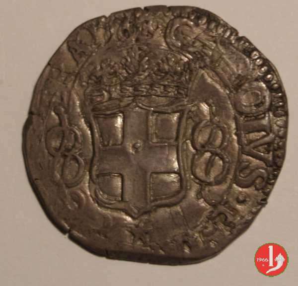Scudo semplice coronato affiancato da due nodi savoia, sotto una stella, sopra la corona la data, intorno CAROLUS • EMANUEL • DEI • GRAT In tre righe: nodo savoia - FE • RT - nodo savoia, in esergo il valore • VI • S • , intorno DUX • SABAUDIE • PED • PR • E • C