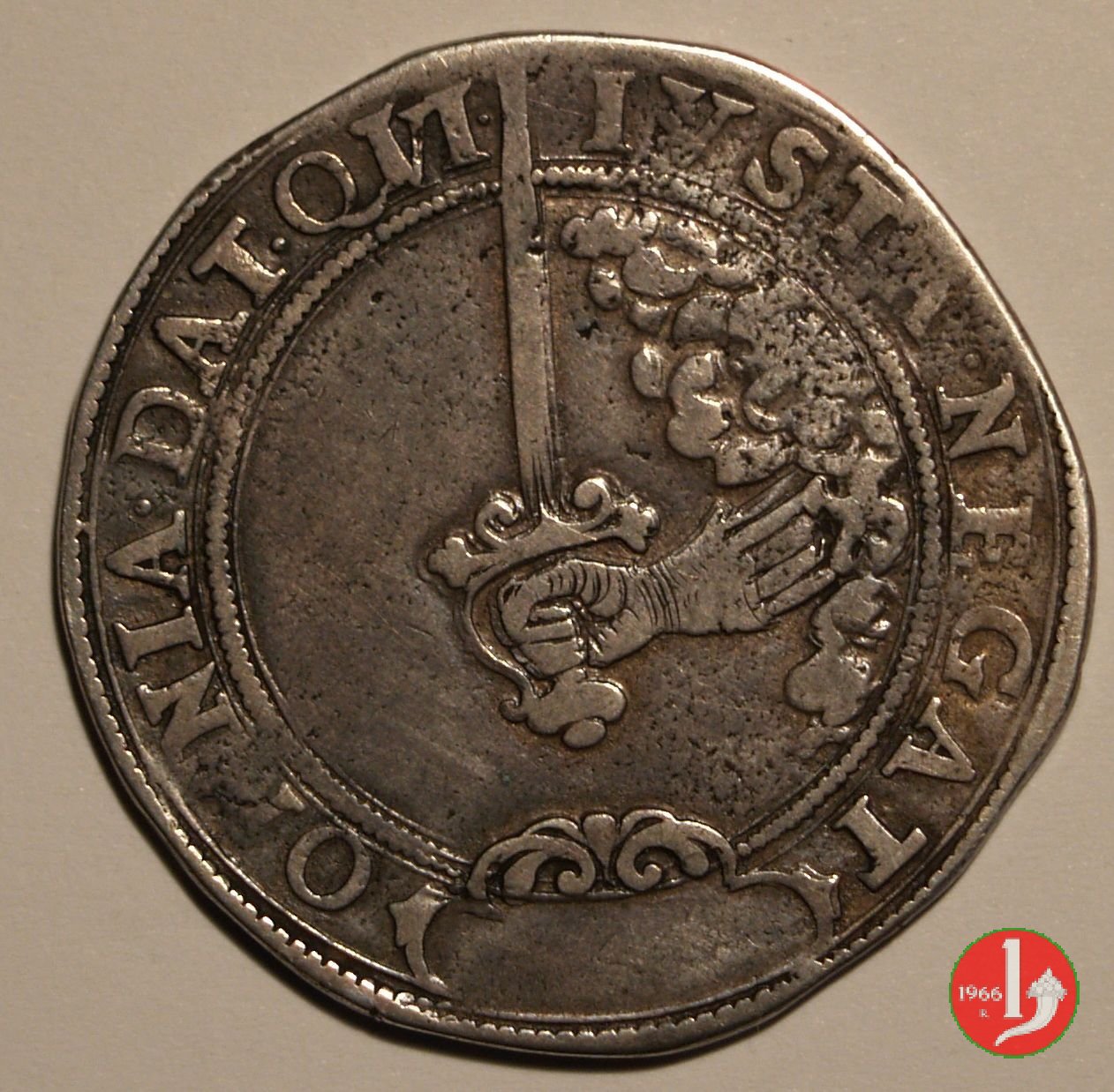 Busto corazzato del duca rivolto a destra, intorno CAROLUS • EM • D : G • DUX • SAB • P • P • E • C • Una mano inguantata impugnante una spada esce dalle nubi, in basso un'ornatino, intorno OMNIA • DAT • QUI • IUSTA • NEGAT •