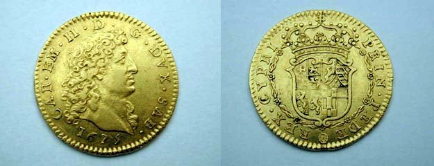 Testa nuda del re rivolta a destra, sotto il collo la data, intorno CAR • EM • II • D • G • DUX • SAB • Scudo completo coronato, circondato dal collare dell'annunziata, intorno PRIN • PEDE REX • CYPRI