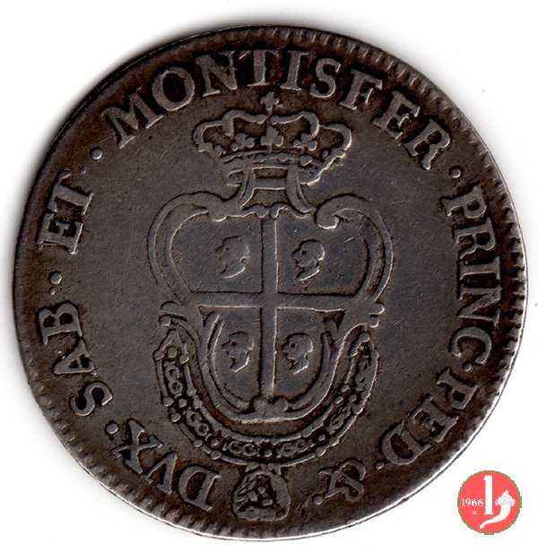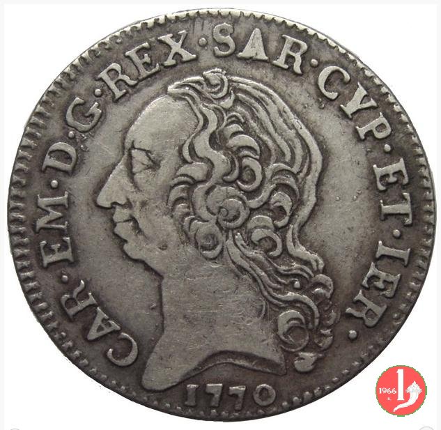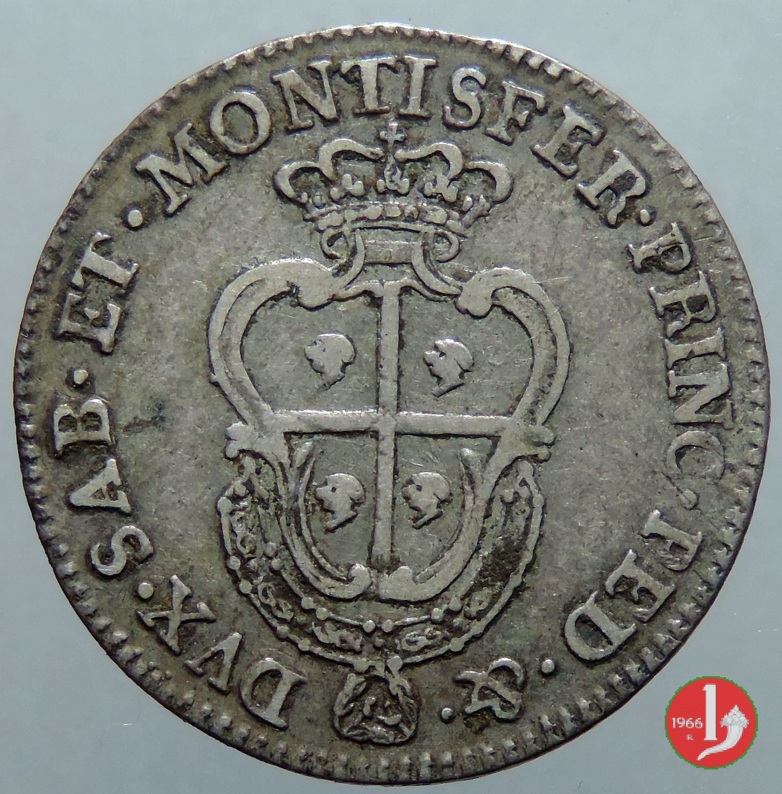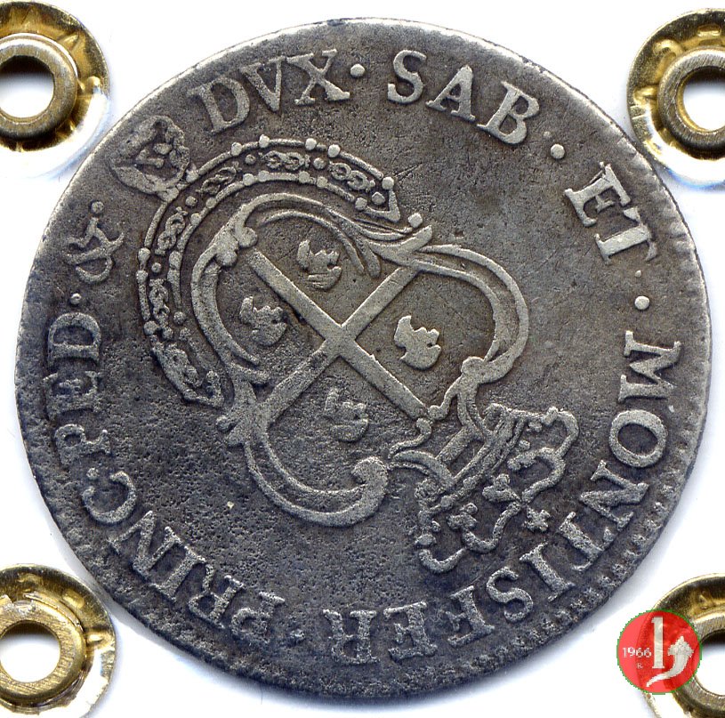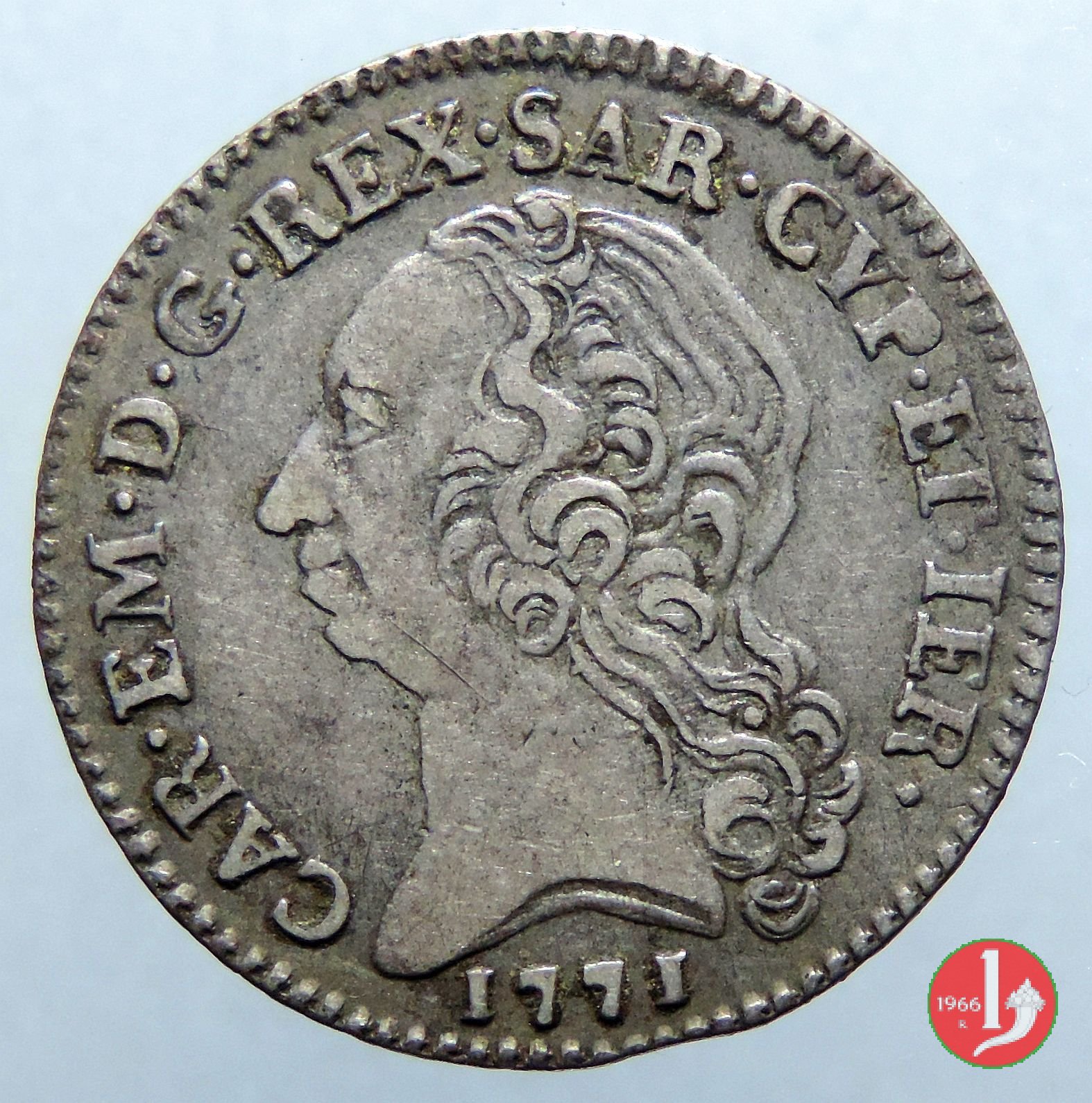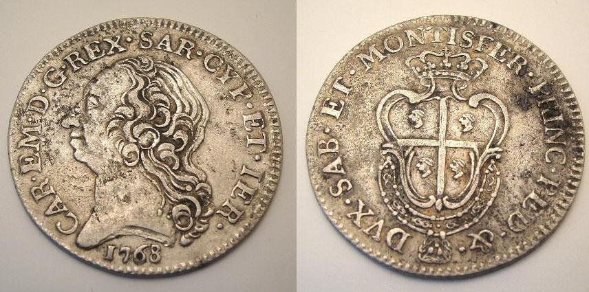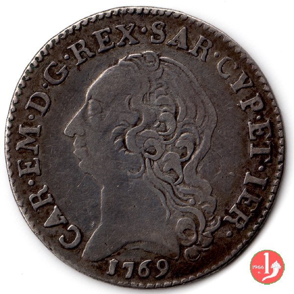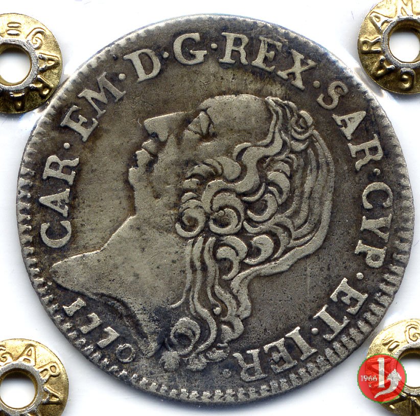Testa nuda del re rivolta a sinistra, sotto il collo la data, intorno CAR • EM • D • G • REX • SAR • CYP • ET • IER • Scudo sardo sagomato, coronato econ il collare dell' annunziata, intorno DUX • SAB • ET • MONTISF • PRINC • PED • & •