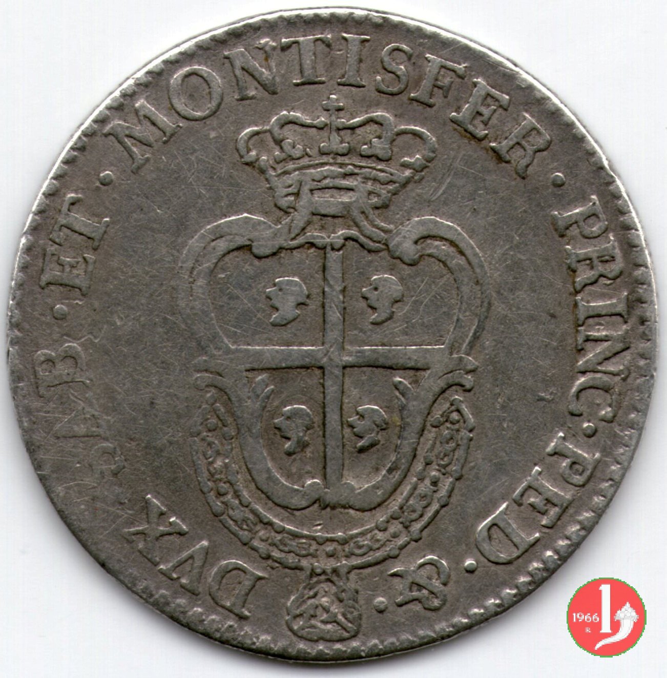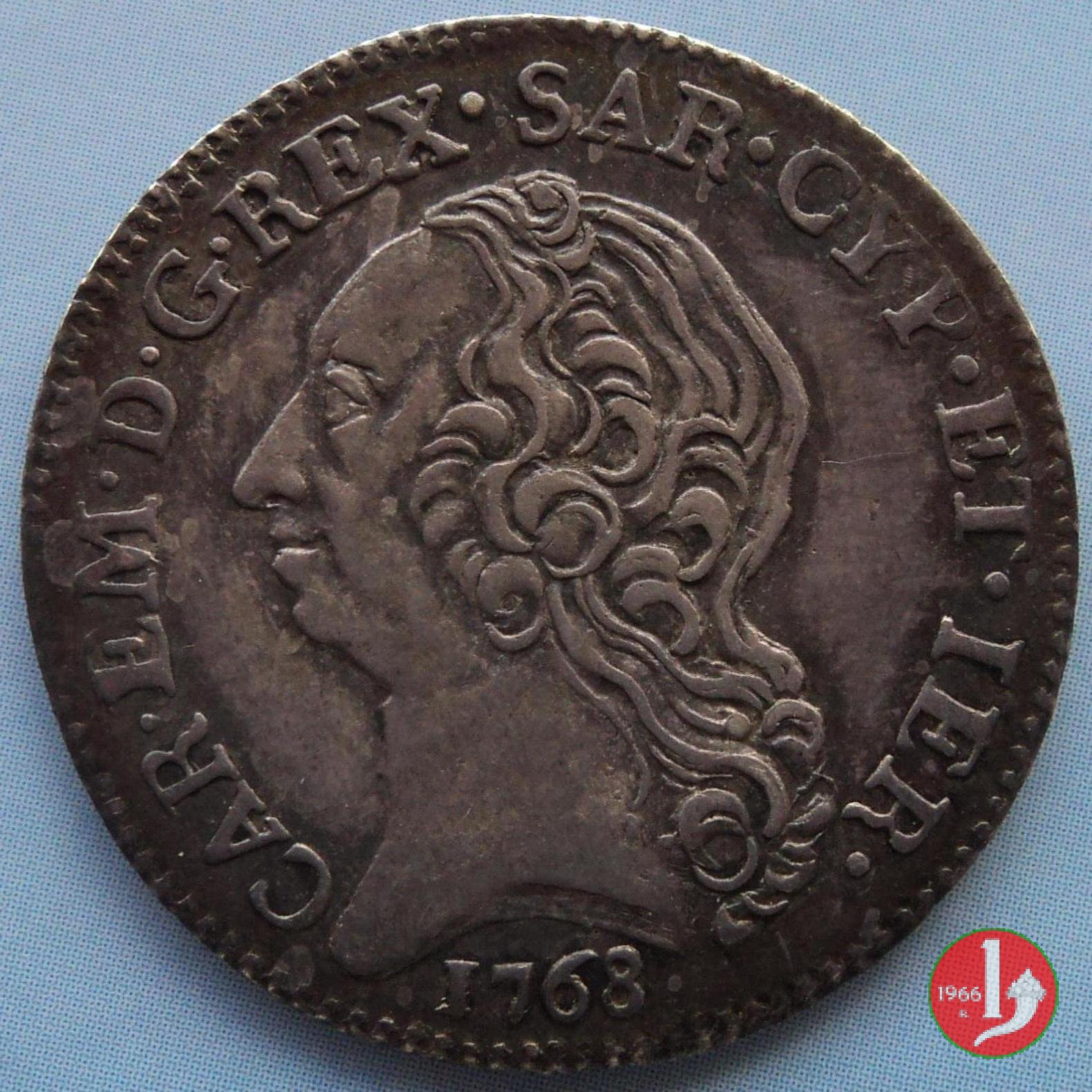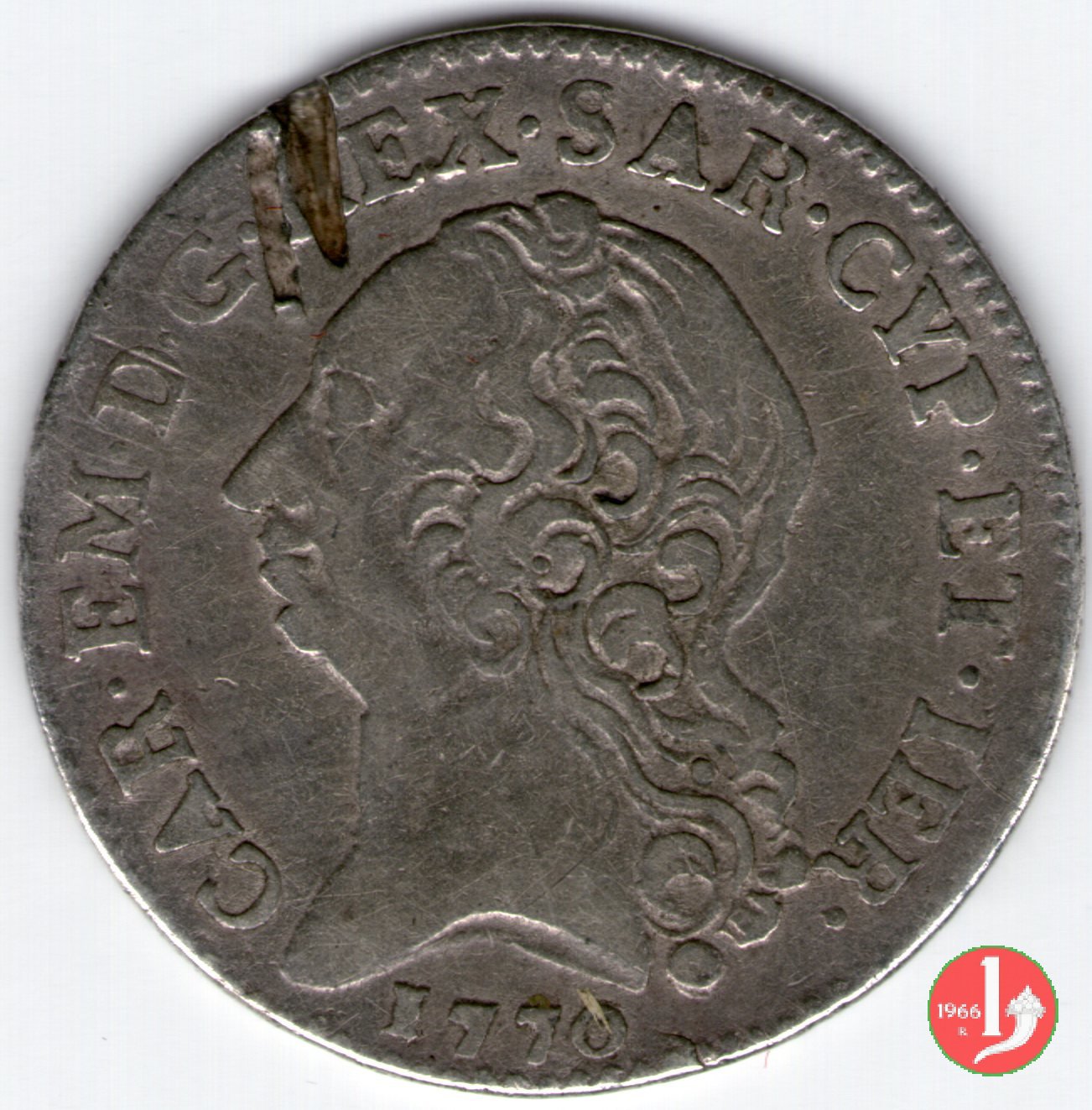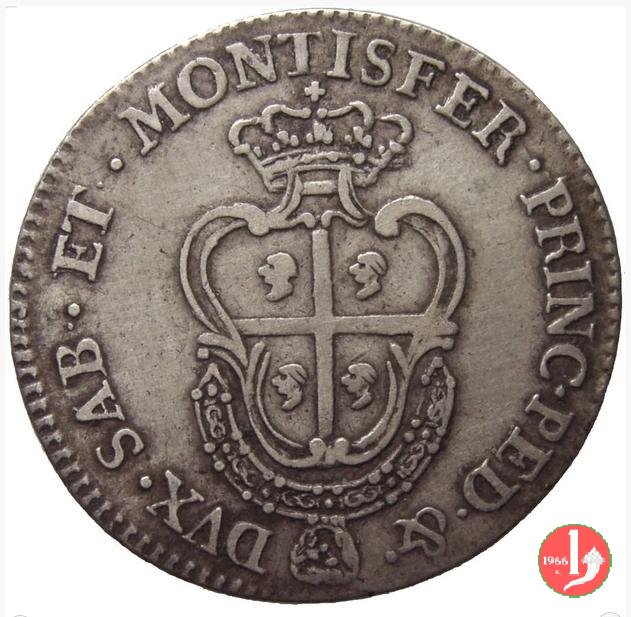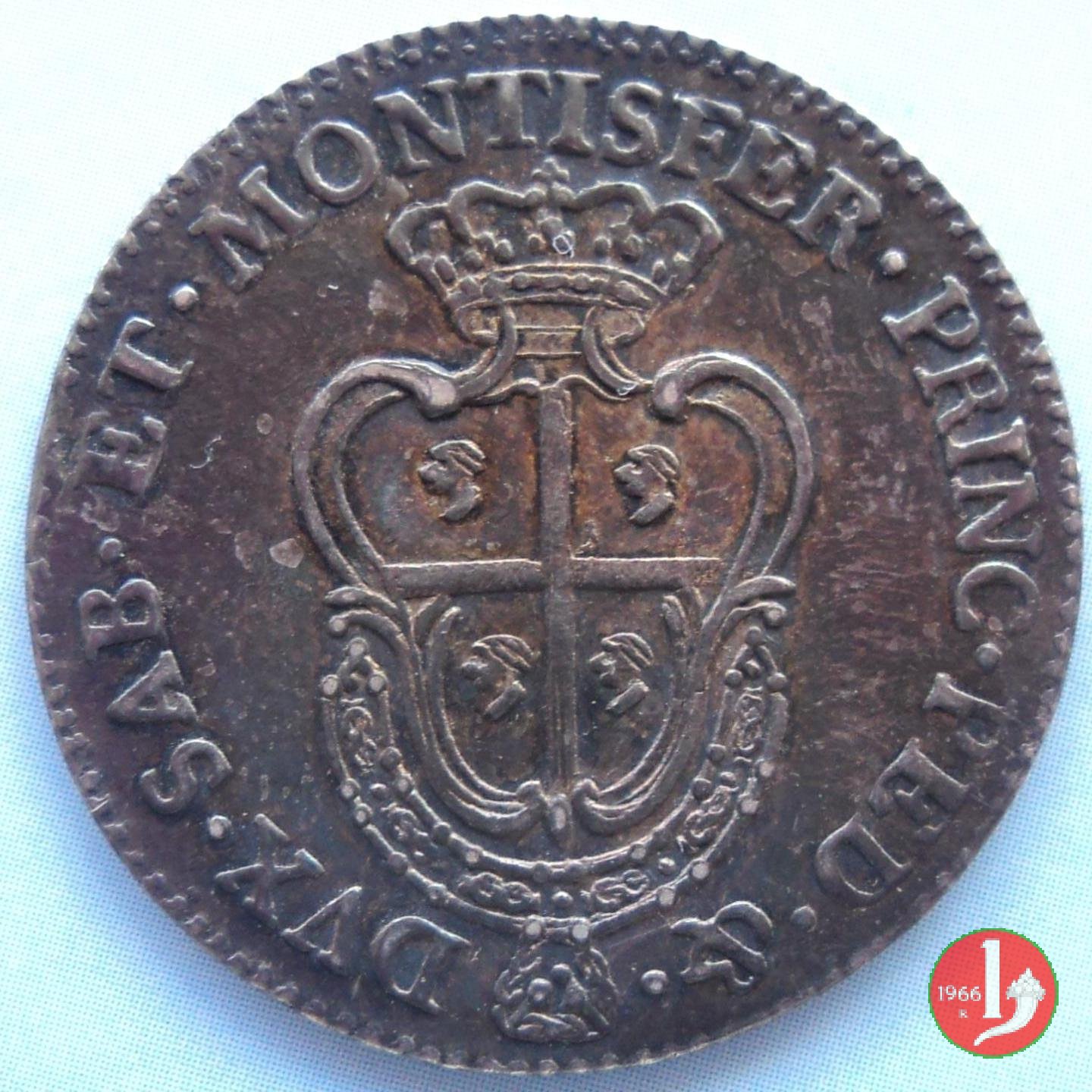Testa nuda del re rivolta a sinistra, sotto il collo la data, intorno CAR • EM • D • G • REX • SAR • CYP • ET • IER • Scudo sardo sagomato, coronato econ il collare dell' annunziata, intorno DUX • SAB • ET • MONTISF • PRINC • PED • & •