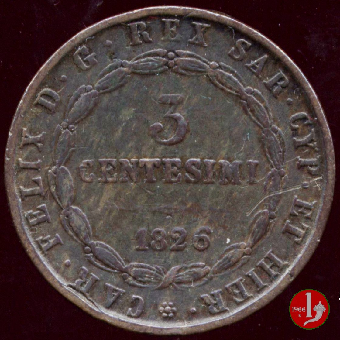 Nel campo indicazione del valore (3 CENTESIMI), fregio e millesimo (1826) su quattro righe, intorno corona di lauro e la scritta CAR • FELIX D • G • REX SAR • CYP • ET HIER •. Sotto, rosetta a 6 petali. Scudo con aquila Sabauda sormontato da corona reale e circondato da rami di quercia. In basso iniziali dell'autore (M. V.) e segno di zecca.