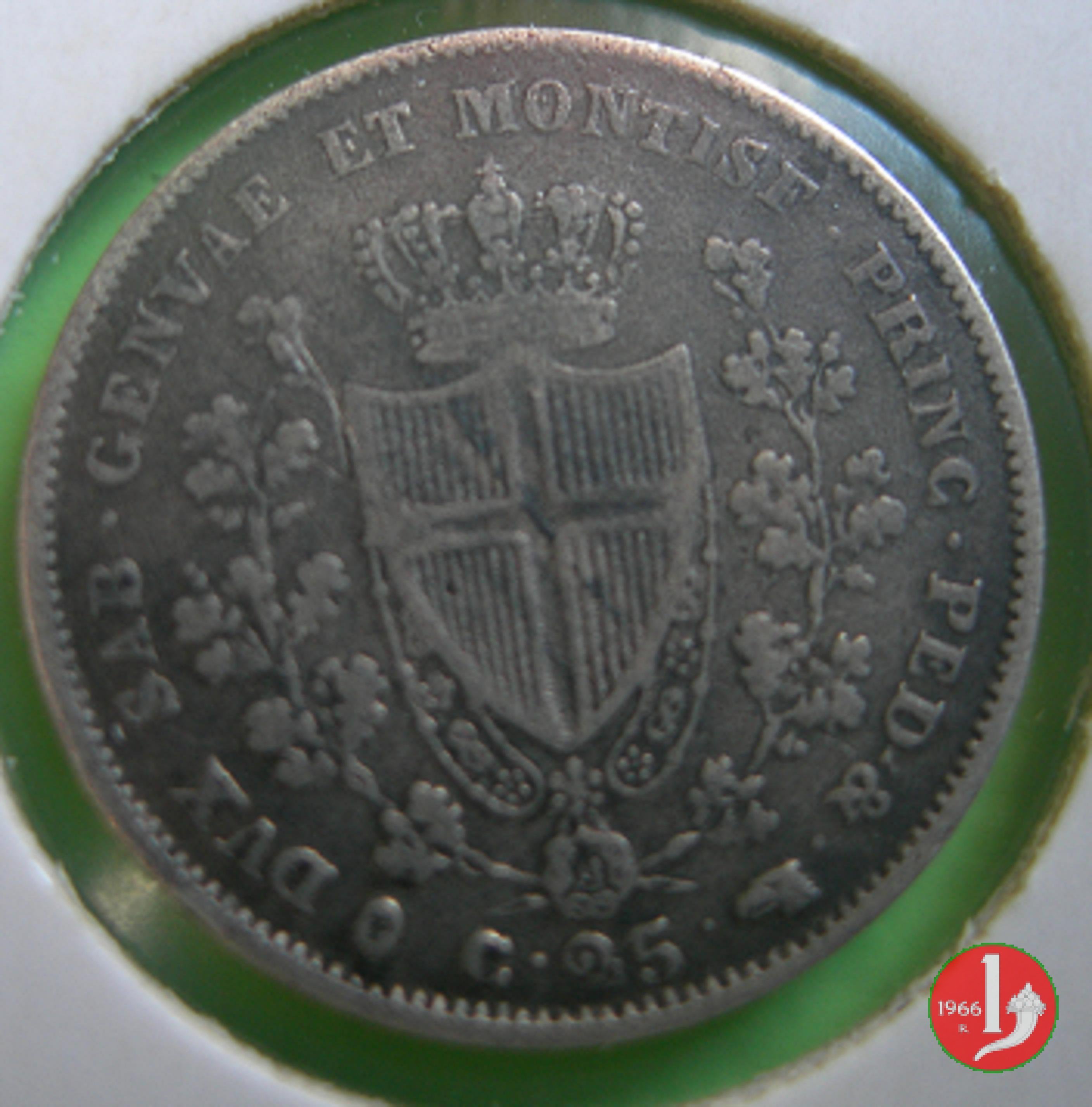 Testa del Re a destra, al di sotto della quale si trova il millesimo. Lungo il bordo, CAR • FELIX D • G • REX SAR • CYP • ET HIER •. Sul taglio del collo indicazione dell'autore (F • per Ferraris). Stemma con croce Sabauda a cuore sovrastato da Corona Reale e fregiato dal collare dell'Annunziata tra rami di quercia. Lungo il bordo: DVX SAB • GENVAE ET MONTISF • PRINC • PED • & •. In basso, attorniato dal segno di zecca, indicazione del valore (C • 25 •).