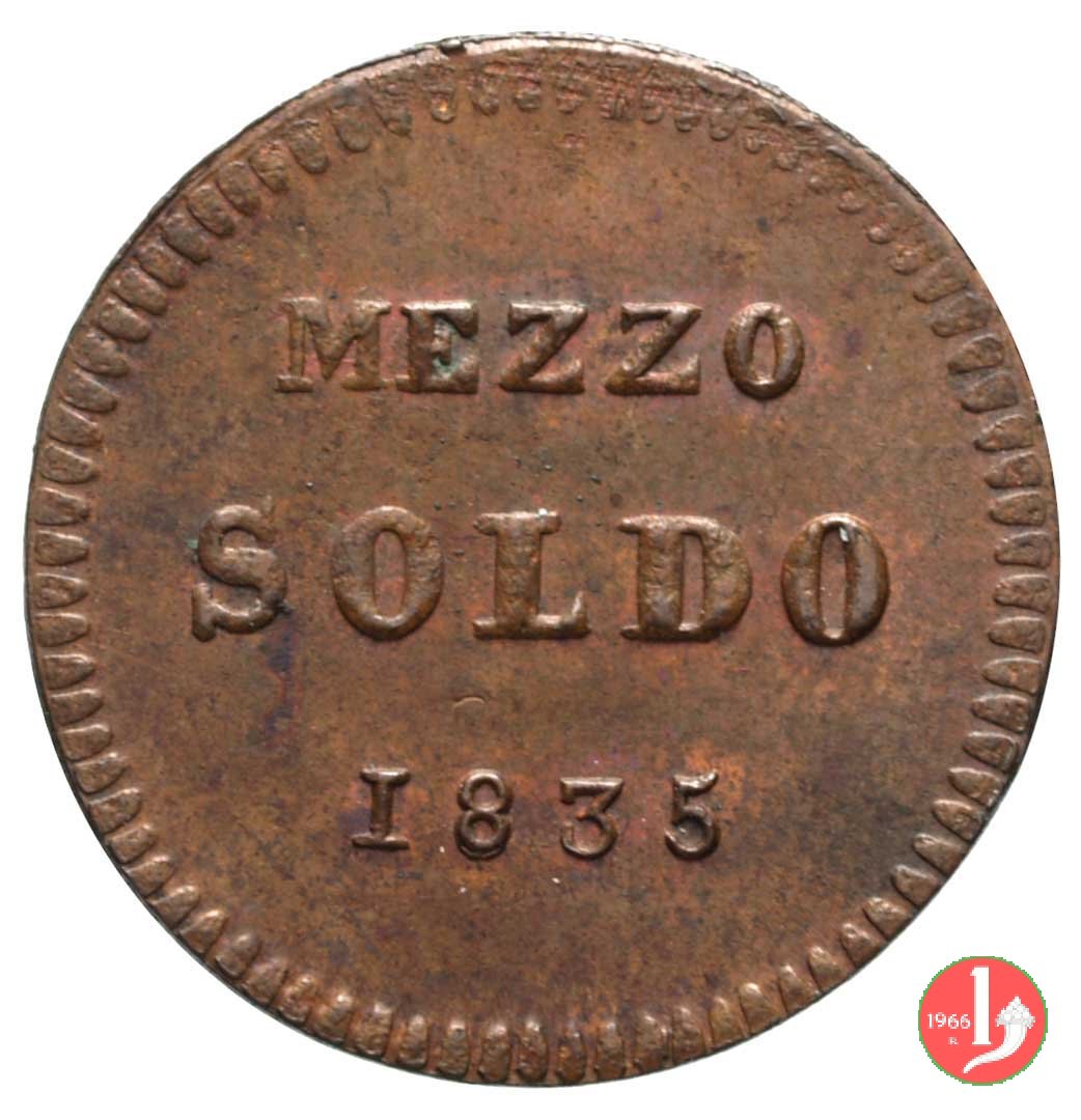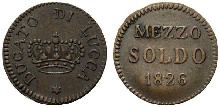 La moneta da mezzo soldo corrisponde a 6 denari lucchesi. Per il 1826 ci sono due tipi, uno molto curato nello stile e nei caratteri ed un secondo piú grezzo, probabilmente coniato negli anni successivi al 1826