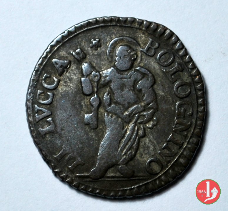 Pantera rampante a sinistra con stemma coronato, affiancato da ramo di lauro con 6 foglie. In basso indicazione del millesimo (1790) All'interno di una cartella. San Pietro di fronte con le chiavi alzate. Intorno BOLOGNINO DI LVCCA e rosetta a sei petali.