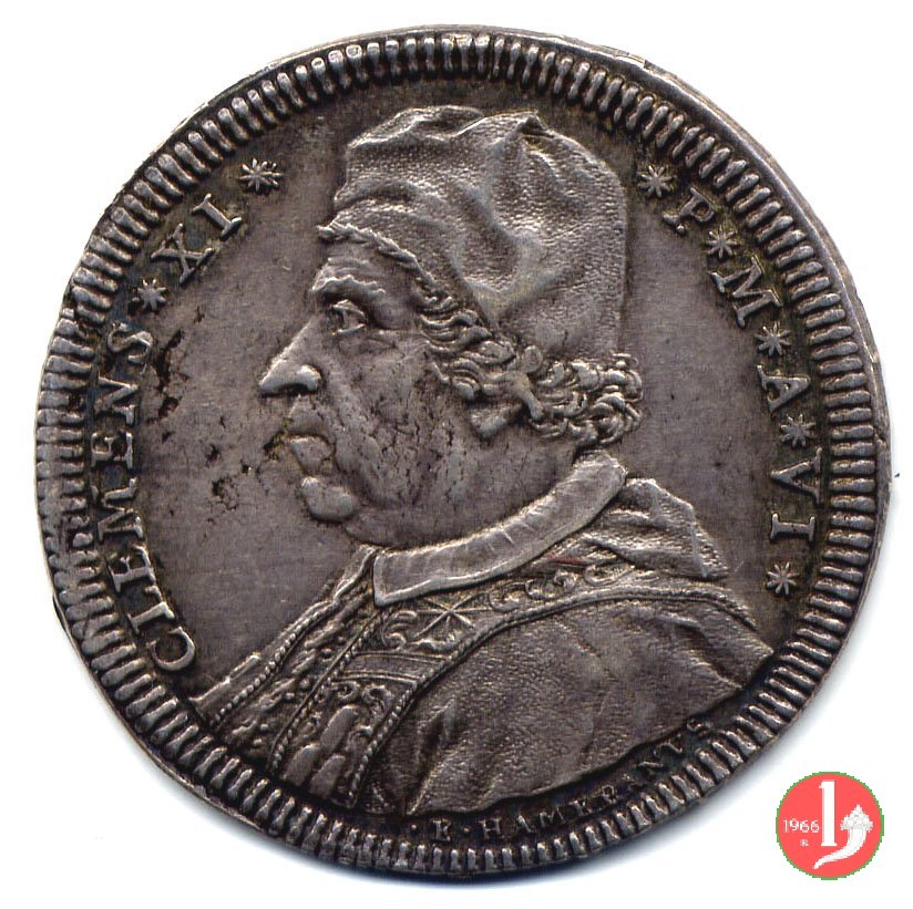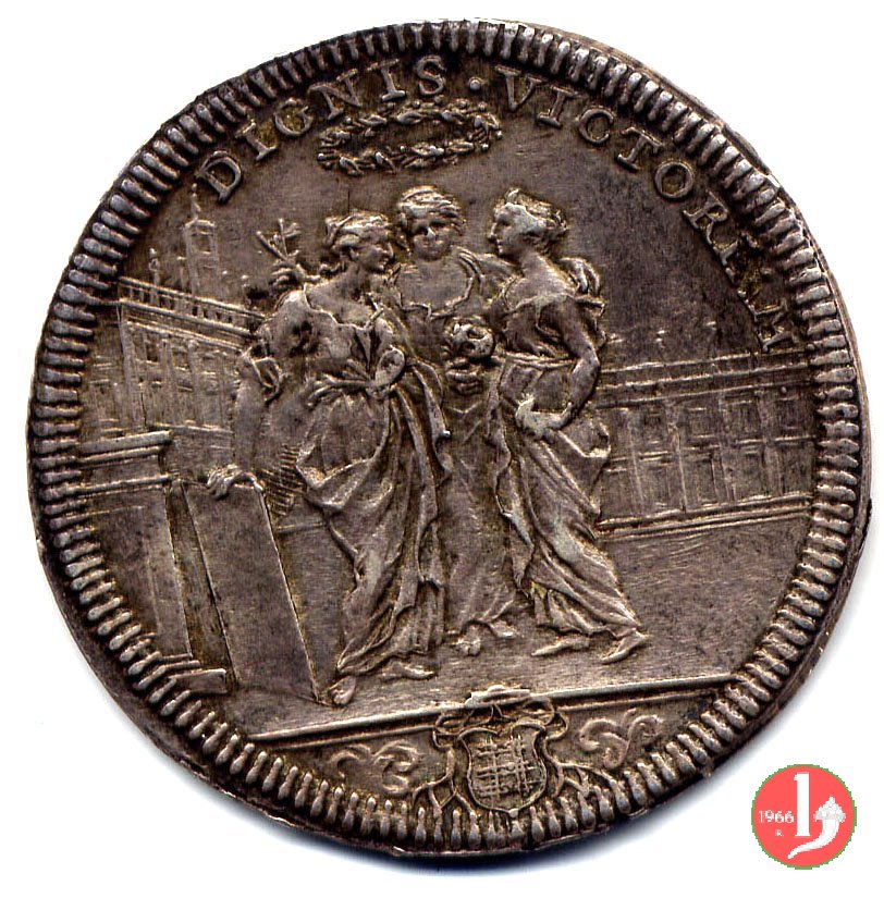 Questa emissione ricorda l'istituzione da parte di Clemente XI dei premi per le Belle Arti (da cui la corona d'alloro), come descritto dalla legenda "DIGNIS VICTORIAM" ossia "vittoria per i meritevoli", tratto da un passo biblico del II libro dei Maccabei. La cerimonia di premiazione avvenne il 5 maggio 1706 presso l'Accademia del Disegno, che aveva sede in Campidoglio. | |||||||||