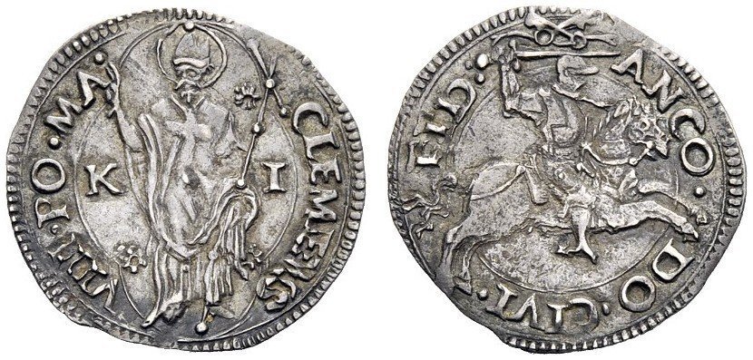 CLEMENS__VII •PO •M • /S.Ciriaco mitrato e nimbato, in piedi di fronte, benedicente e con lunga croce pomata; ai lati K__I; alle punte della cornice: rosetta Chiavi Decussate ANCON •__D •CIVIT_FID • /Cavaliere galoppante a destra con spada brandita