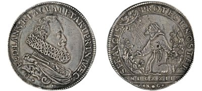 Busto a destra, barbuto, a testa nuda, con gorgiera, coraza, paludamento e collare del Toson d'oro.