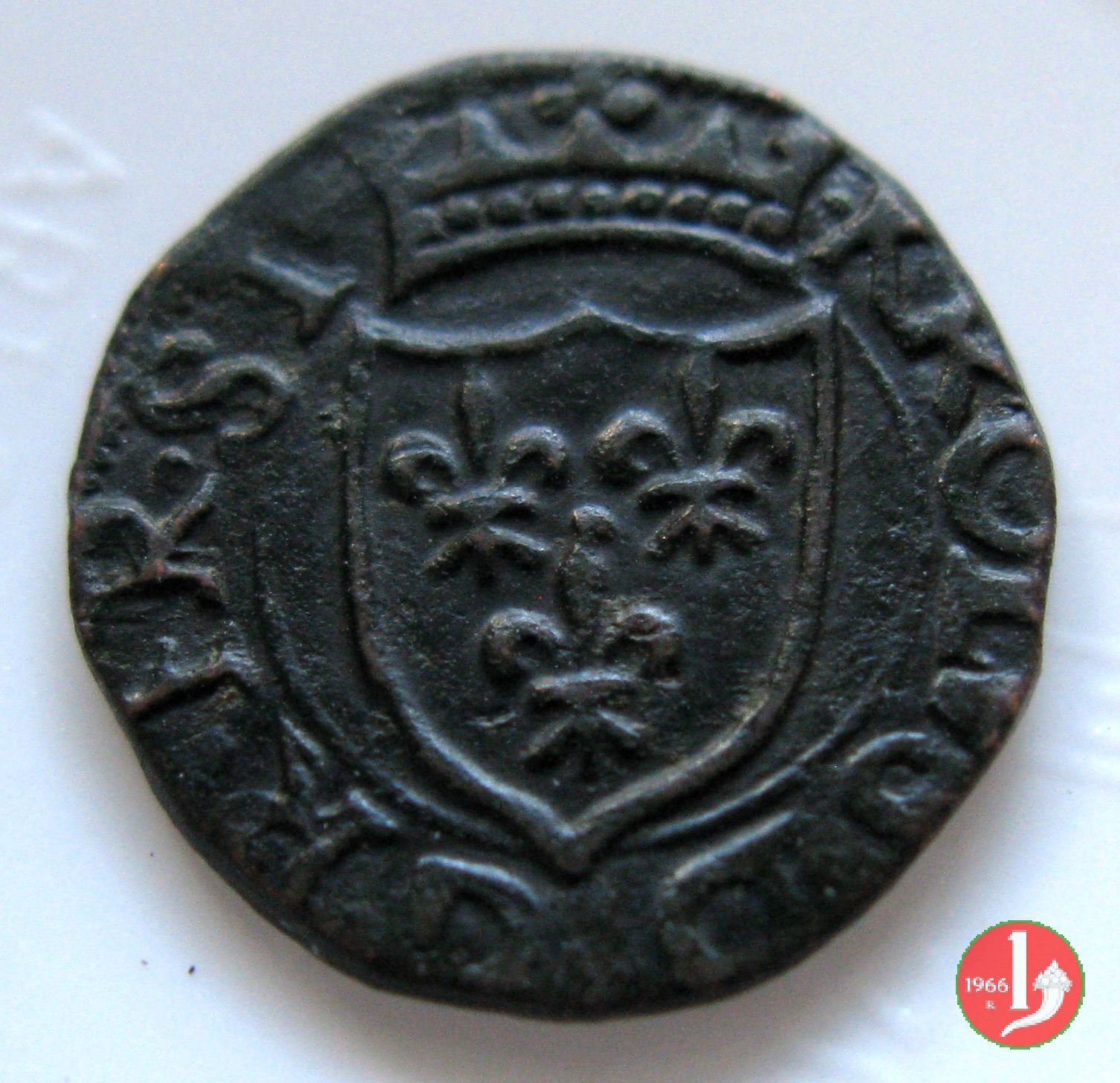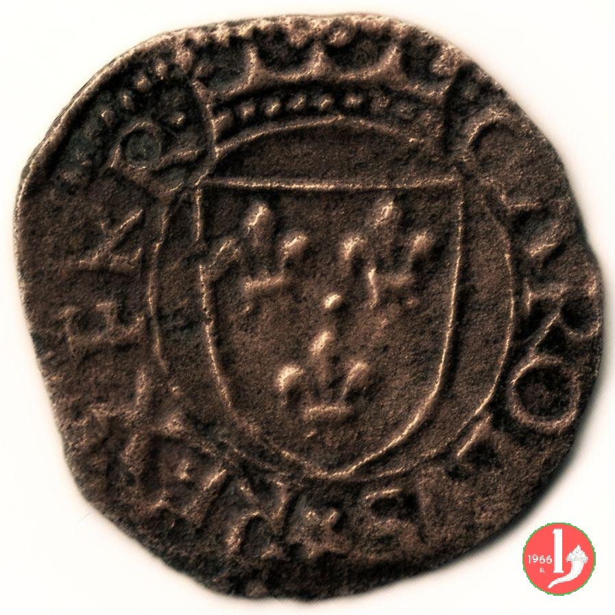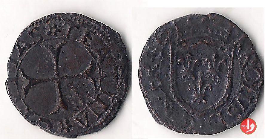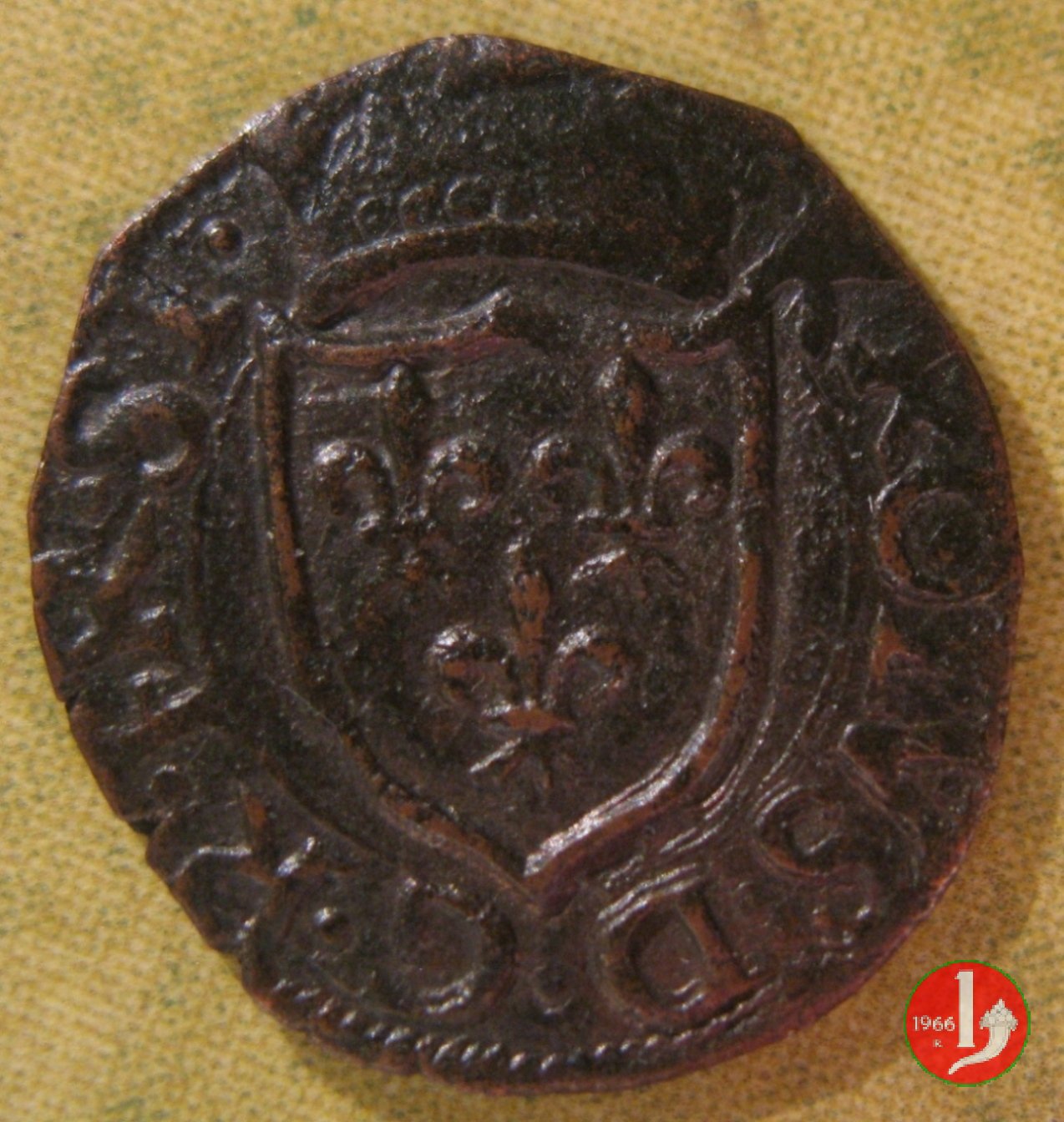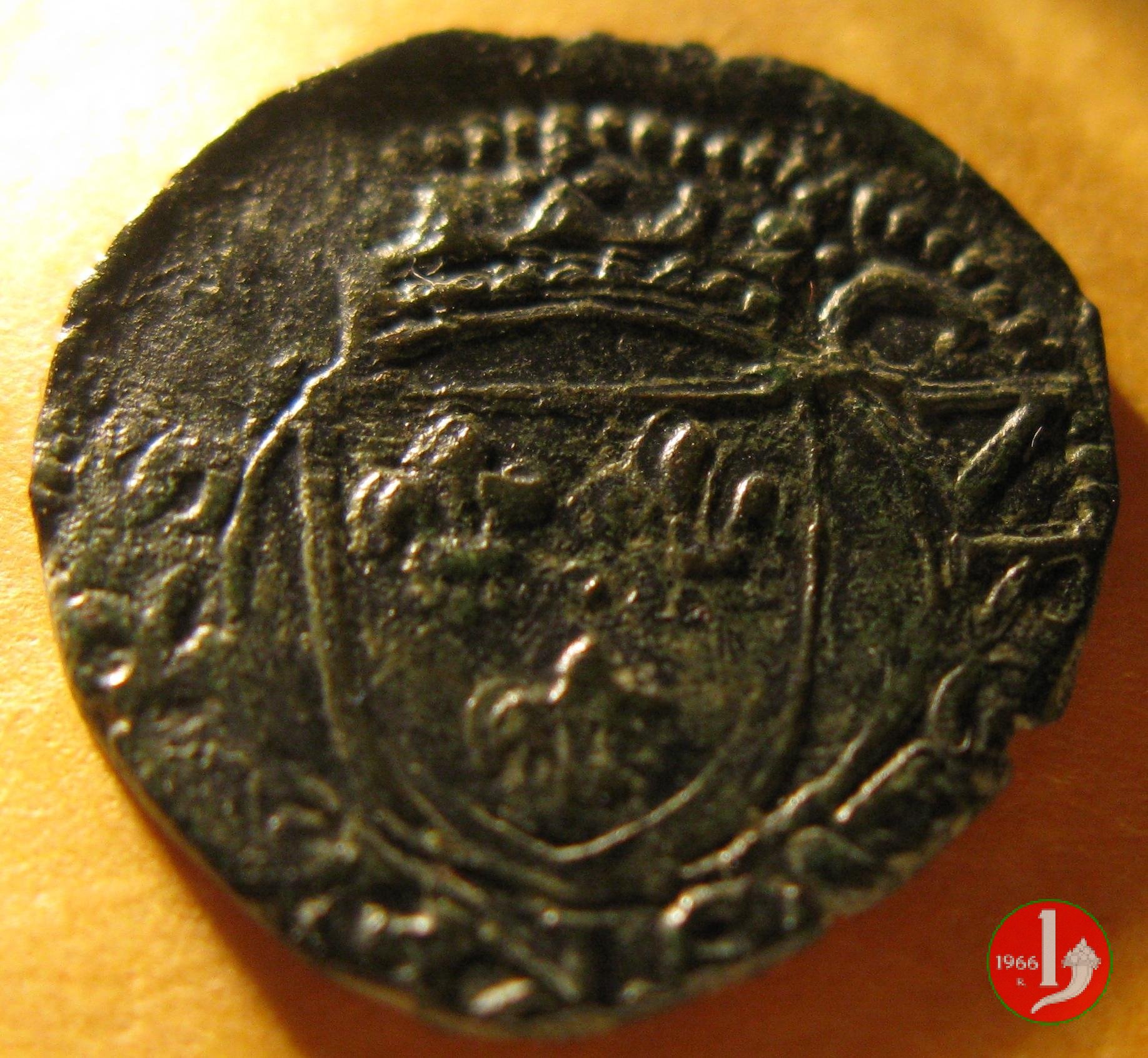 CΛROLVS.REX.FRR, Stemma di Francia coronato. rosetta a 5 petali TEΛTINΛ rosetta a 5 petali CIVITΛS, Croce ancorata.
