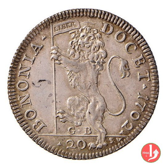1 D/: (s) CLEMENS - • XI • P • M • Stemma oblungo con tiara radiante chiavi con fiocchi, in basso armette D'Adda e di Bologna e iniziali T • B // R/: (s) stella a 5 punte BONONIA stella a 5 punte - stella a 5 punte DOCET stella a 5 punte G • B stella a 5 punte Leone vessillifero, in basso il valore XX