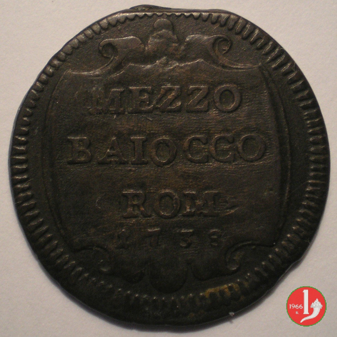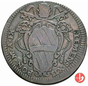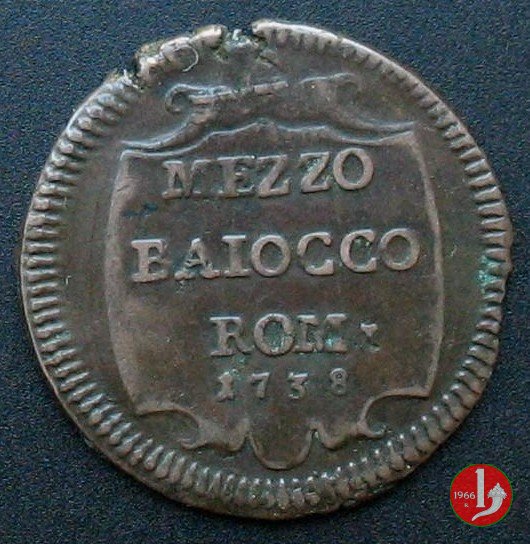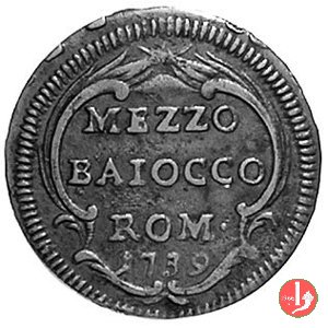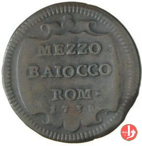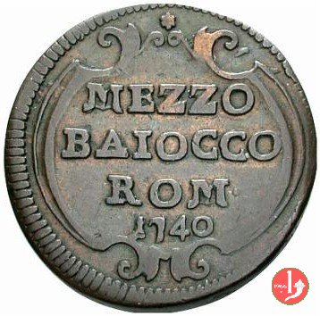 Stemma a targa oblunga con fogliami, chiavi con impugnatura quadrilatera con cordoni e fiocchi. Legenda da DX: CLEMENS XII - PON • M • A • anno di pontificato. MEZZO / BAIOCCO / ROM (triscele) / millesimo, in cartella quadrilatera con volute.