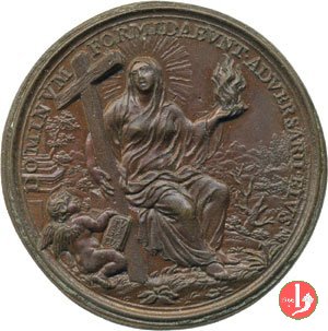 La chiesa assisa di 3/4 a dx raggiante con fiamma e croce, sotto angelo regge libro iscritto: TV = SA = LVS