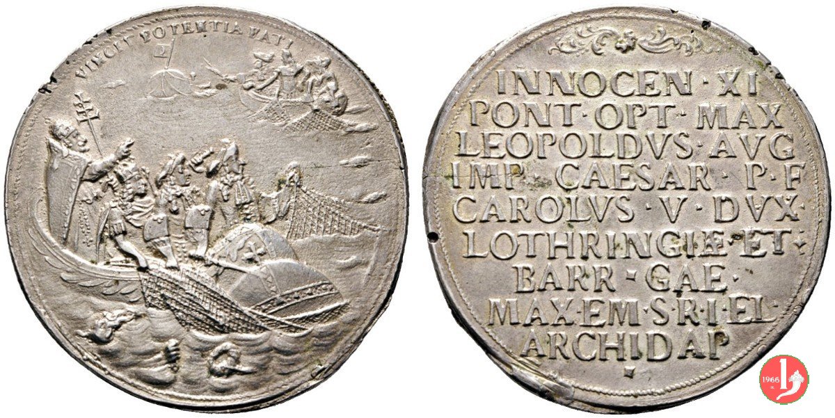 nel campo: fregio = INNOCEN • XI = PONT • • OPT • MAX = LEOPOLDVS AVG = IMP • CAESAR • P • F = CAROLVS • V • DVX • = LOTHRINGIAE • ET : = BARR • CAE • = MAXEM • SR • I • EL • = ARCHIDAP
