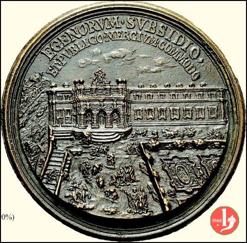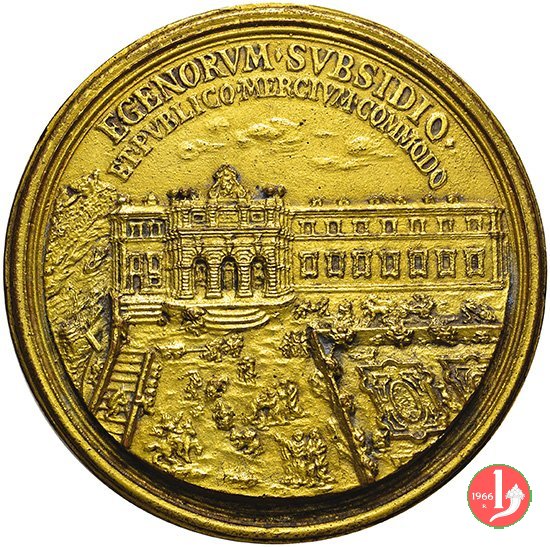 | Medaglia straordinaria fusa, realizzata nel 1694 per ricordare la costruzione della nuova Dogana presso il Tevere a Ripa Grande. L'edificio riprodotto nella medaglia fu disegnato dall'Architetto Mattia de Rossi (1637-1695). | ||||||