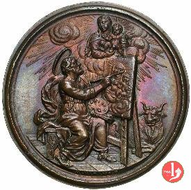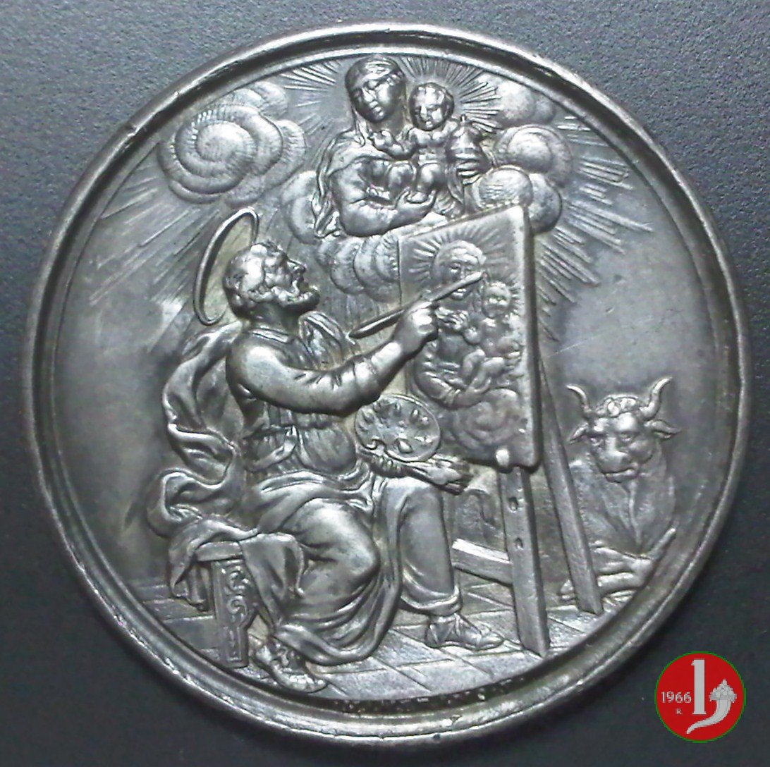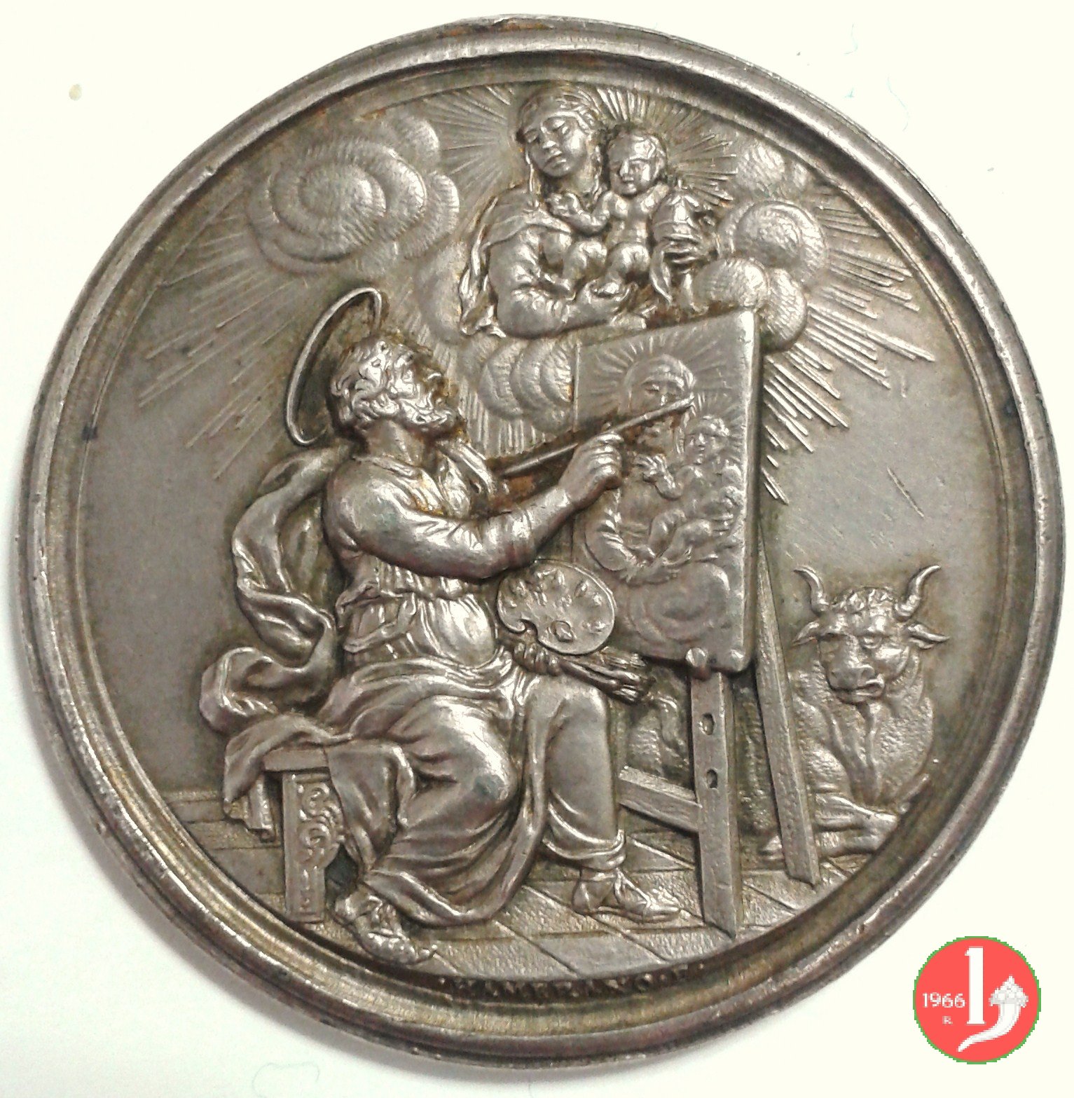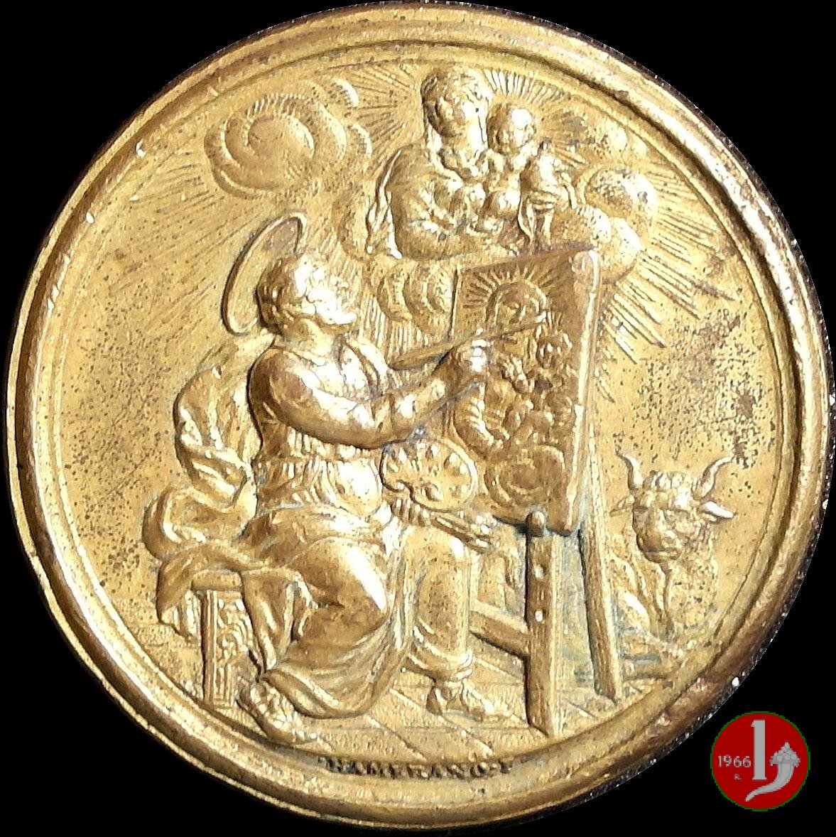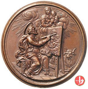 San Luca nimbato verso dx in atto di dipingere, al cavalletto, l'immagine della Madonna con bambino che gli appare in ato raggiante tra nubi, a dx il toro assiso