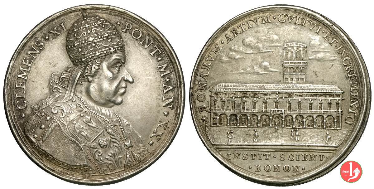| Medaglia straordinaria coniata, emessa a ricordo delle opere di abbellimento e costruzione della torre astronomica eseguite a Palazzo Poggi in Bologna grazie all' interessamento e al finanziamento di Clemente XI. | |||||||