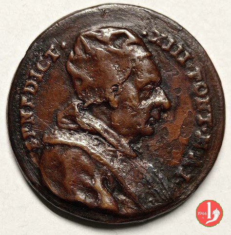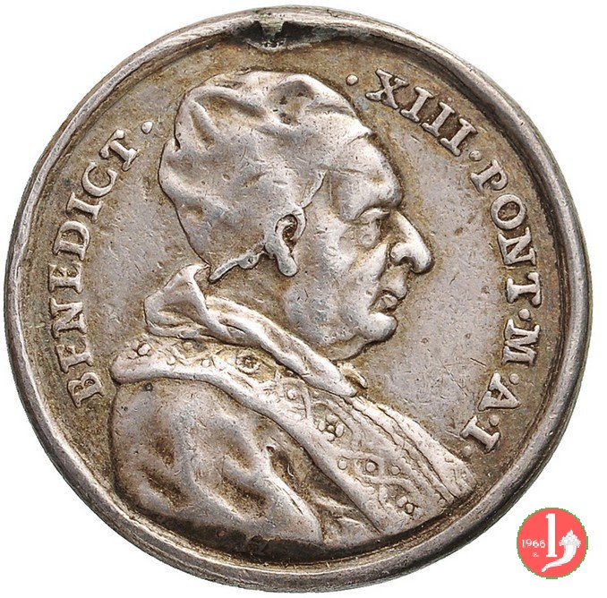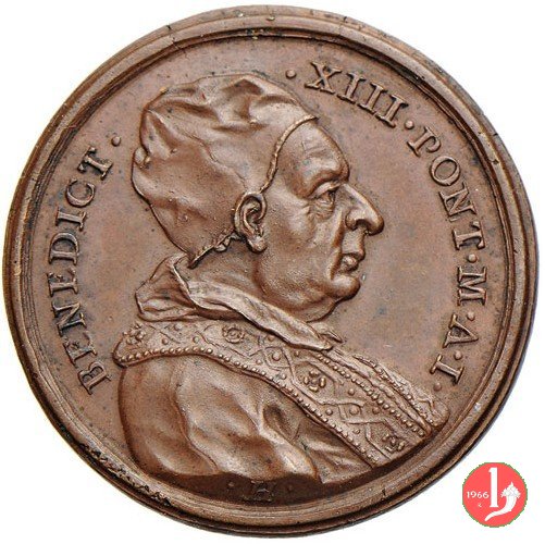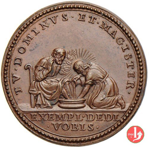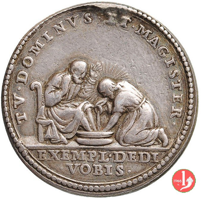 Medaglia coniata, emessa il 23-03-1725, per ricordare la celebrazione In Coena Domini con la tradizionale lavanda dei piedi del Giovedi Santo. Primo tipo si differenzia dalla M191a in quanto utilizza il conio del Dritto della medaglia del Possesso (M186), senza il punto prima della legenda BENEDICT. | |||||||