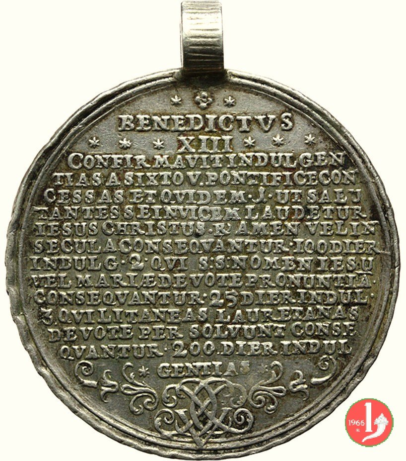Medaglia coniata, emessa il 12-01-1728 per ricordare la conferma dell'indulgenza, concessa da Sisto V, per la lode del Santissimo Nome di Gesú con la preghiera: Sia lodato Gesú Cristo e sempre sia lodato.
