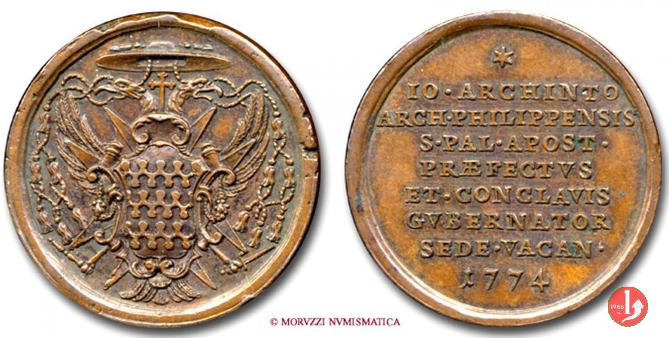 Stemma di Mons. Giovanni Archinto sormontato da galero * = IO • ARCHINTO = •.. = •. APOST • = PRAEFECTVS = ET • CONCLAVIS = GVBERNATOR = SEDE • VACAN • = 1774