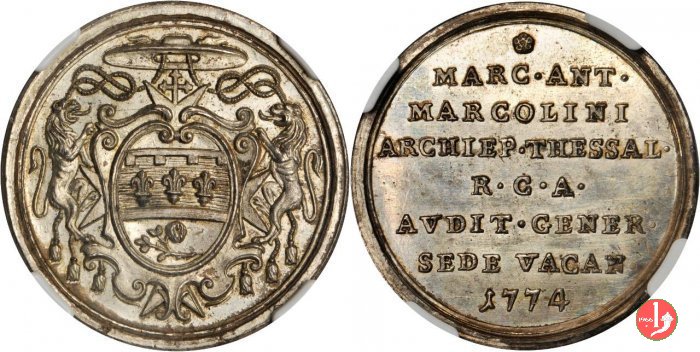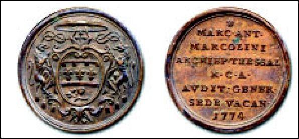 | Medaglia coniata, emessa per la Sede Vacante del 1774 dall'Uditore Generale della Reverenda Camera Apostolica Mons. Marco Antonio Marcolini. | ||||||