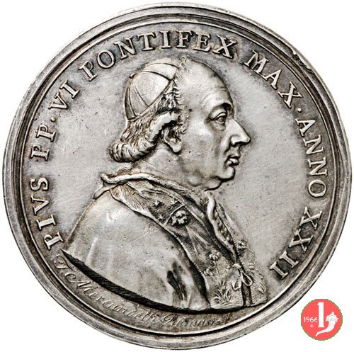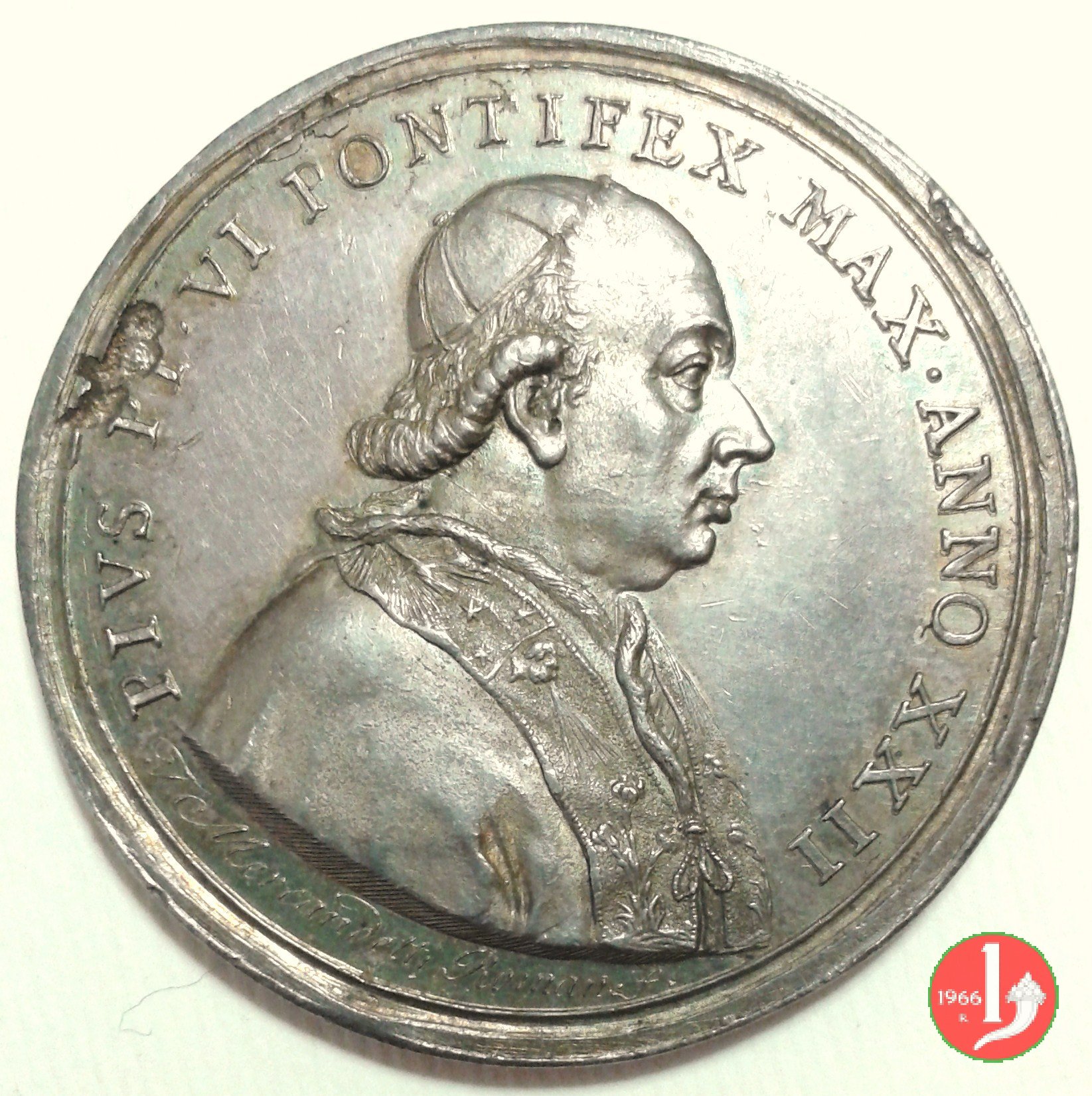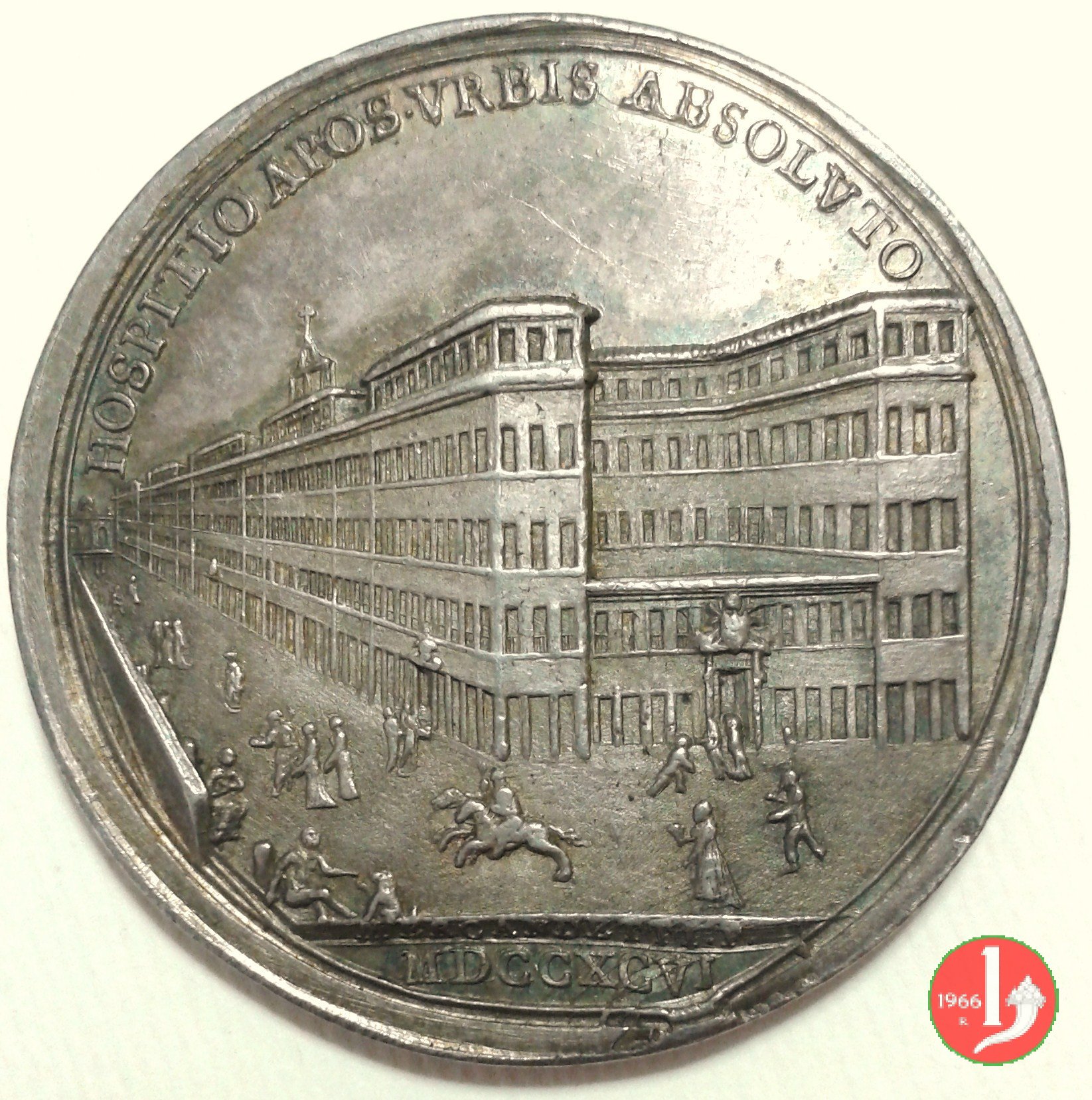 Medaglia annuale coniata, emessa il 29-06-1796 a ricordo della fine lavori all'Ospizio Apostolico. Le medaglie in argento di questa emissione sono quasi sempre a basso contenuto di metallo prezioso. | ||||||||