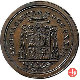 Medaglia coniata, emessa per la Sede Vacante 1823 dal prefetto dei Sacri Palazzi Apostolici e governatore del Conclave, Monsignor Francesco Marazzani Visconti (1755-1829). Ne esistono due tipi con varianti nelle legende al Verso. Questo è il Primo tipo che fu probabilmente rifatto per la scarsa leggibilità del Verso e la mancanza del secondo cognome. | |||||||