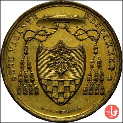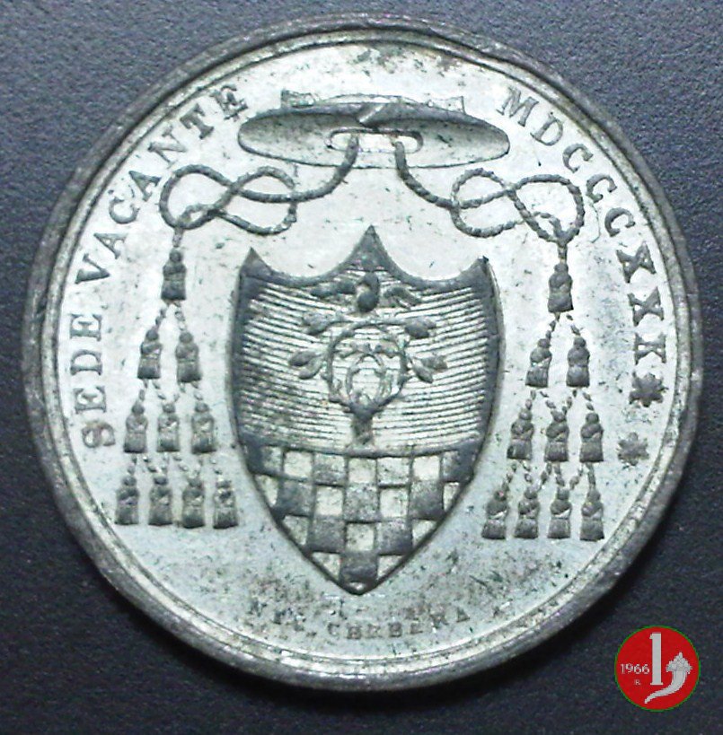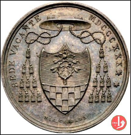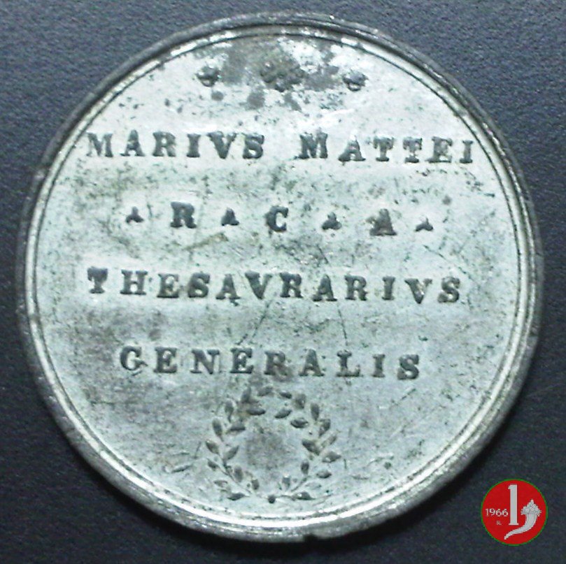 | Medaglia coniata, emessa per la Sede Vacante del 1830, dal Tesoriere Generale della Sede Vacante Monsignore Mario Mattei. | |||||||