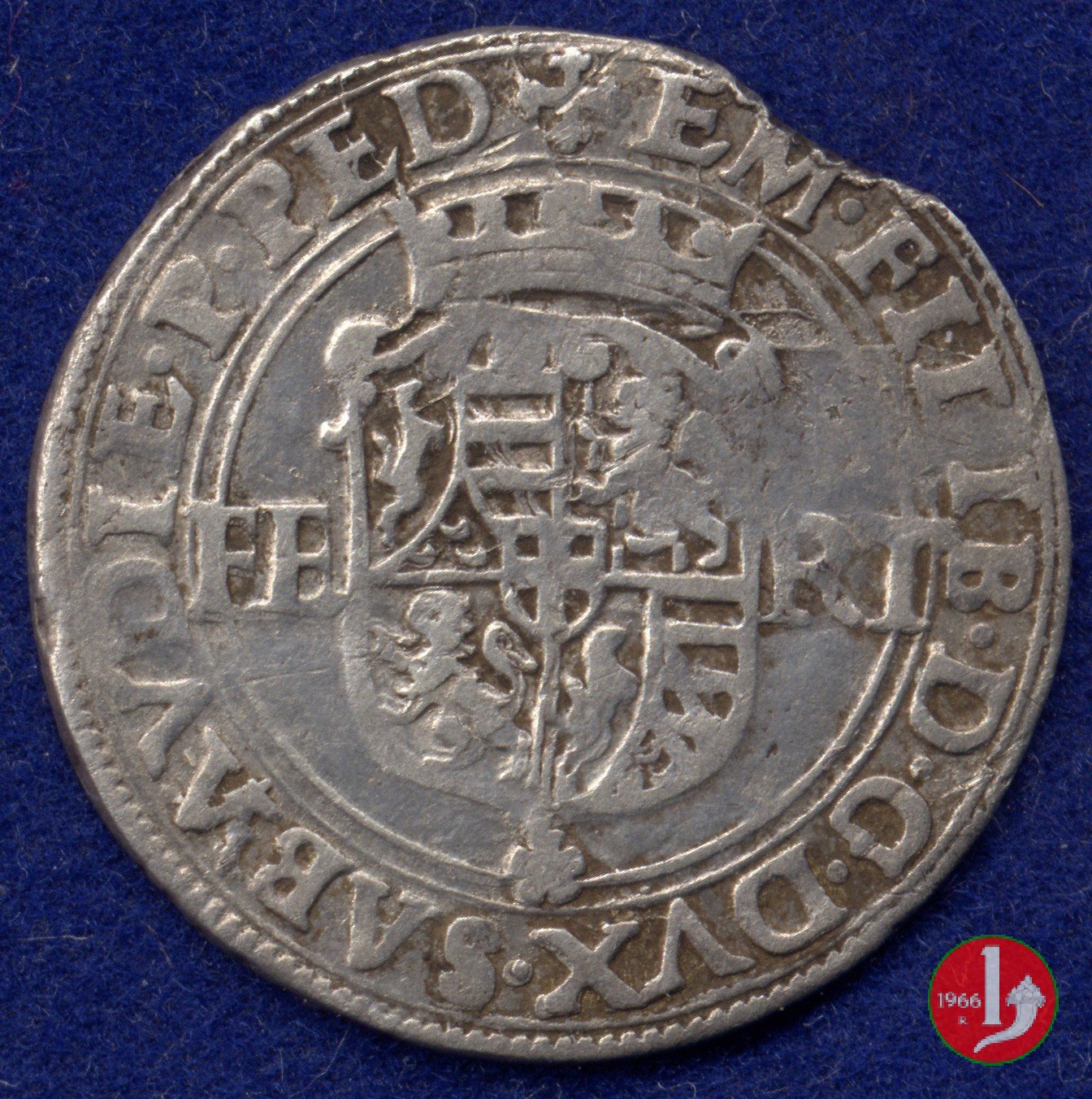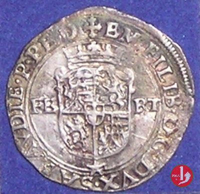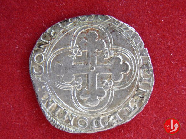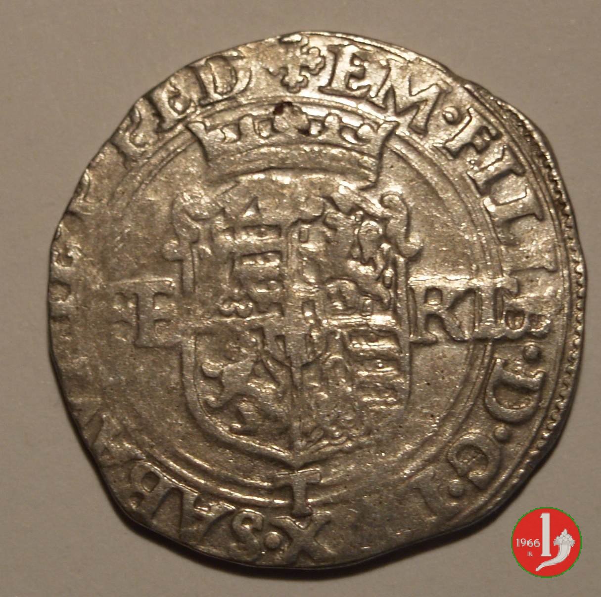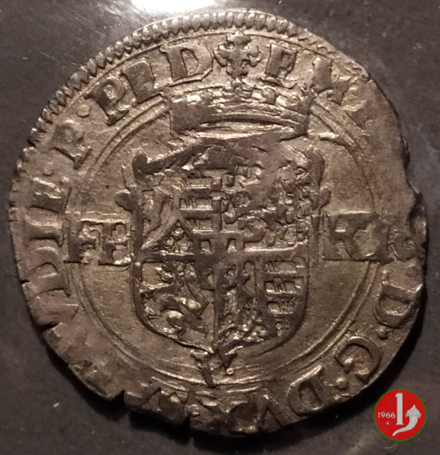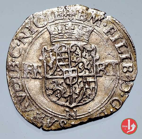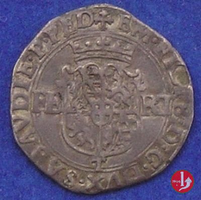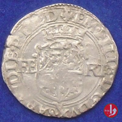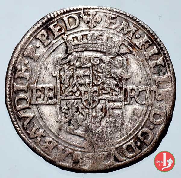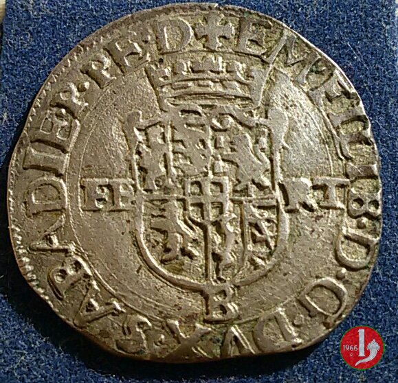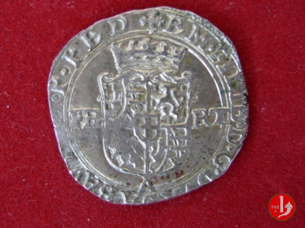 Scudo completo coronato con ai fianchi la scritta FE RT e sotto le sigle di zecca, intorno: croce EM • FILIB • D • G • DUX • SABAUDIE • P • PED Croce mauriziana dentro una cornice quadrilobata doppia con dei trifogli alle punte, intorno: croce IN • TE • DOMINE • CONFIDO • data e sigle