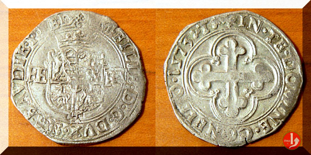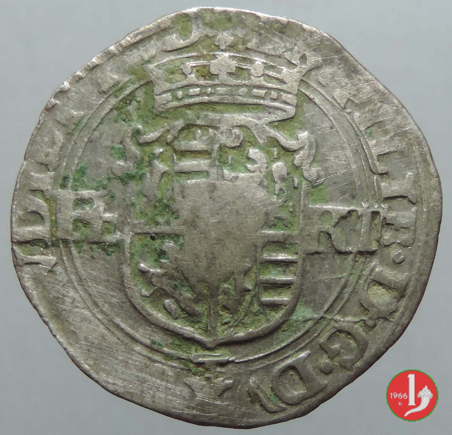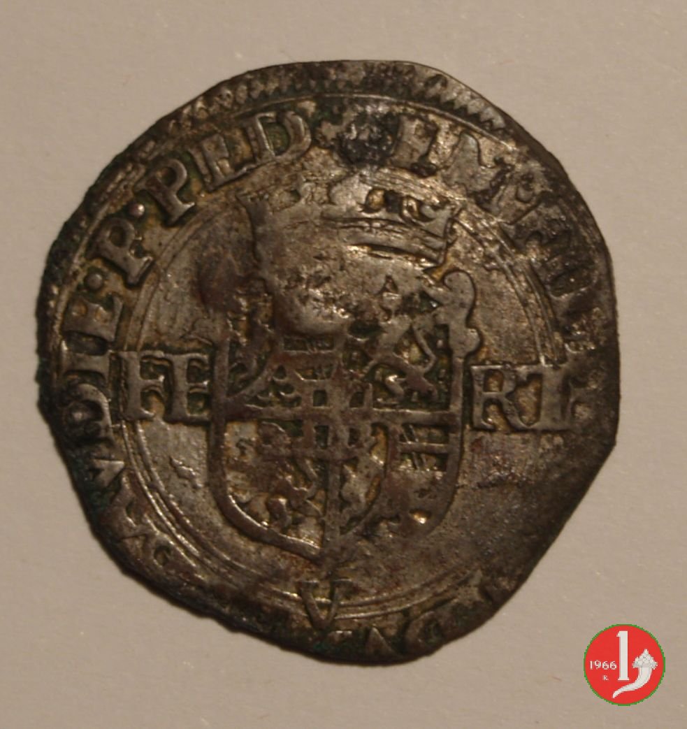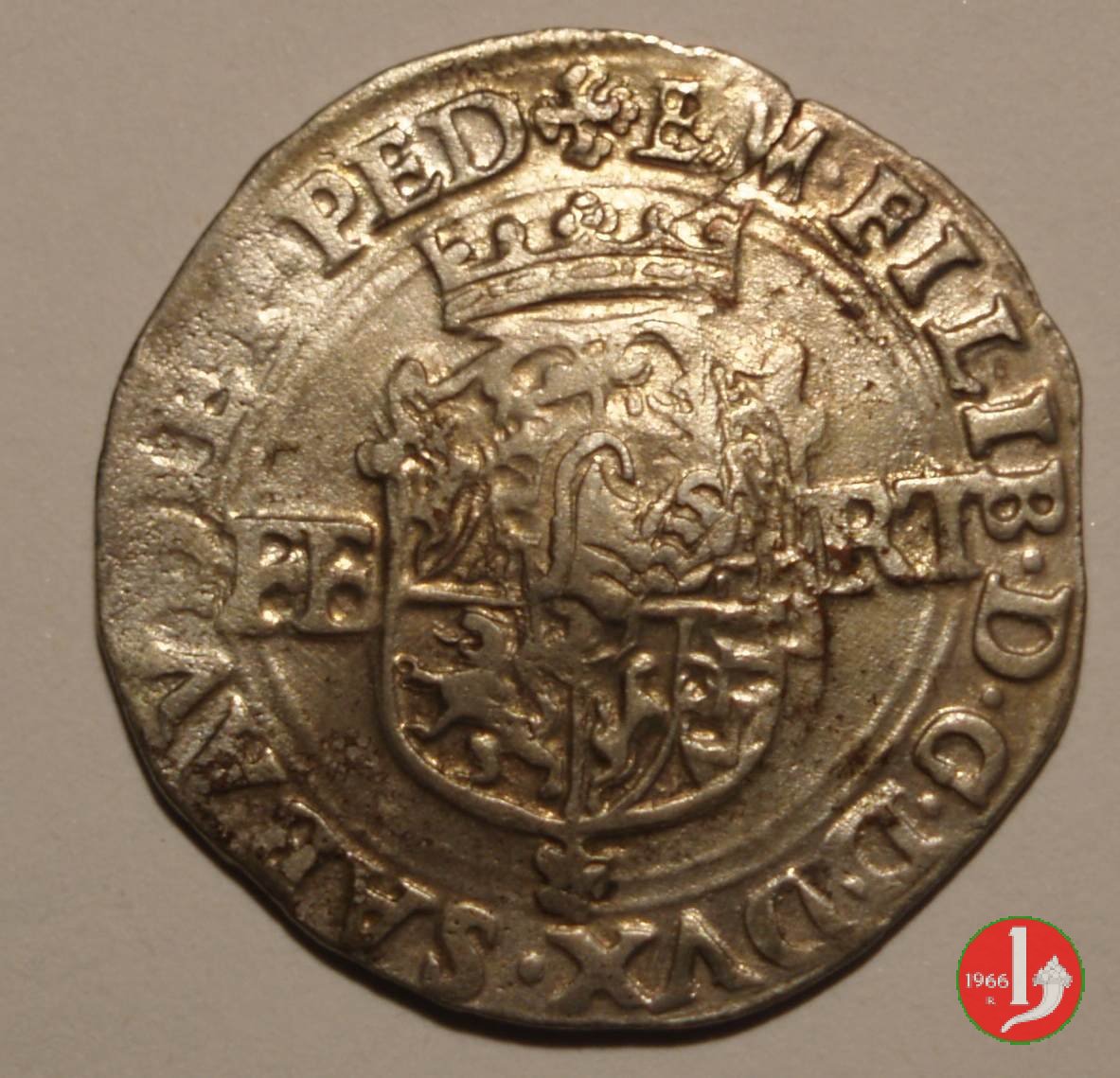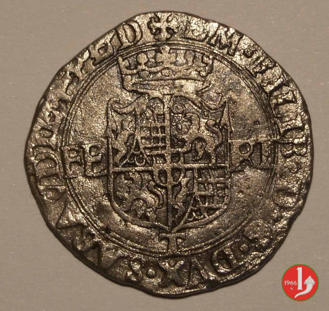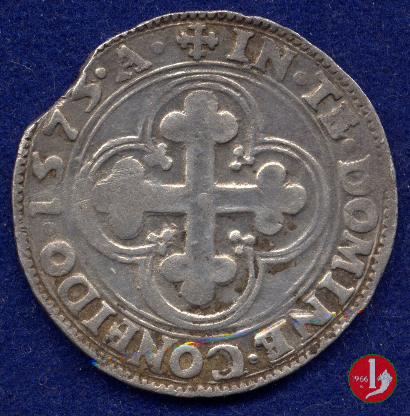 Scudo completo coronato con ai fianchi la scritta FE RT e sotto le sigle di zecca, intorno: croce EM • FILIB • D • G • DUX • SABAUDIE • P • PED Croce mauriziana dentro una cornice quadrilobata doppia con dei trifogli alle punte, intorno: croce IN • TE • DOMINE • CONFIDO • data e sigle