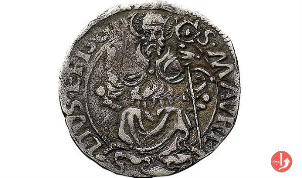 Il Duca, in armatura, a cavallo galoppante verso destra, tiene lo scettro nella destra alzata.