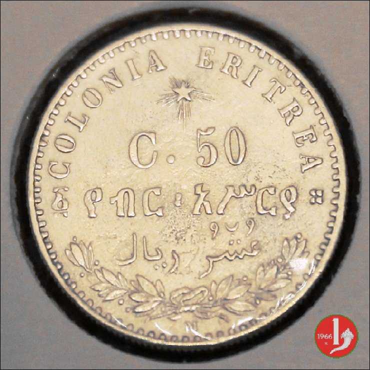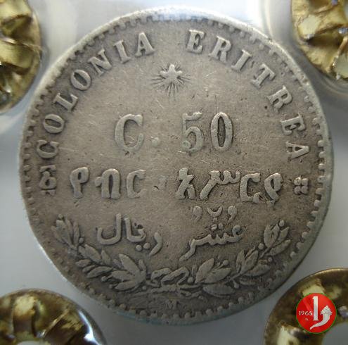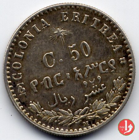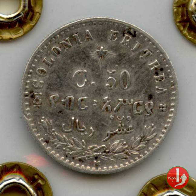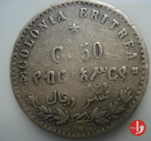 Semibusto in uniforme del Re con corona volto a destra. Lungo il bordo, UMBERTO I RE D'ITALIA • e il millesimo (1890). Sotto il busto, indicazione dell'autore (SPERANZA). Nel campo indicazione del valore in italiano (C. 50), arabo ed amarico su tre righe sotto la stella italiana. Lungo il bordo, in alto, COLONA ERITREA, in basso, rami di alloro intrecciati con un fiocco al di sotto del quale vi è il segno di zecca (M).