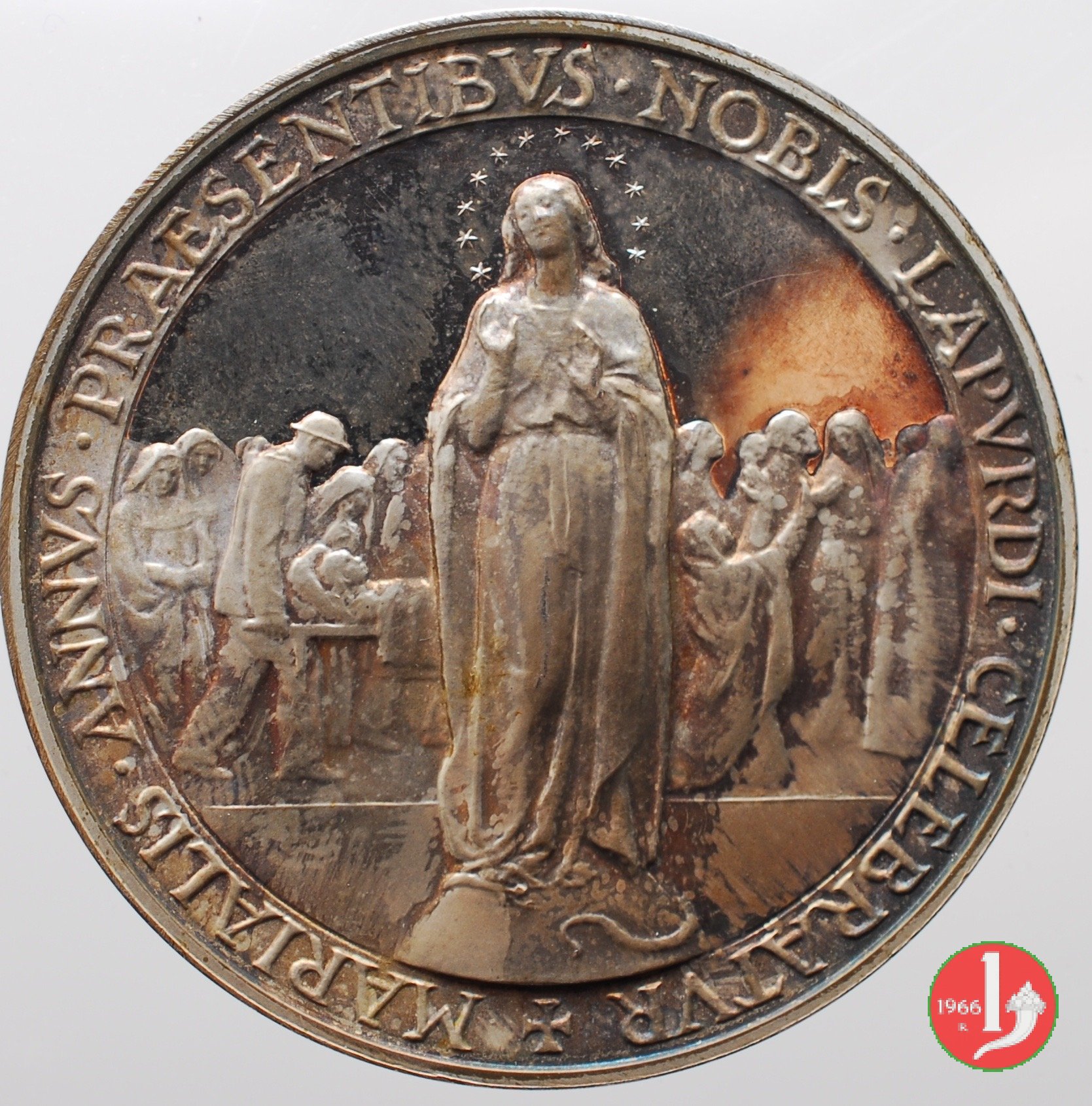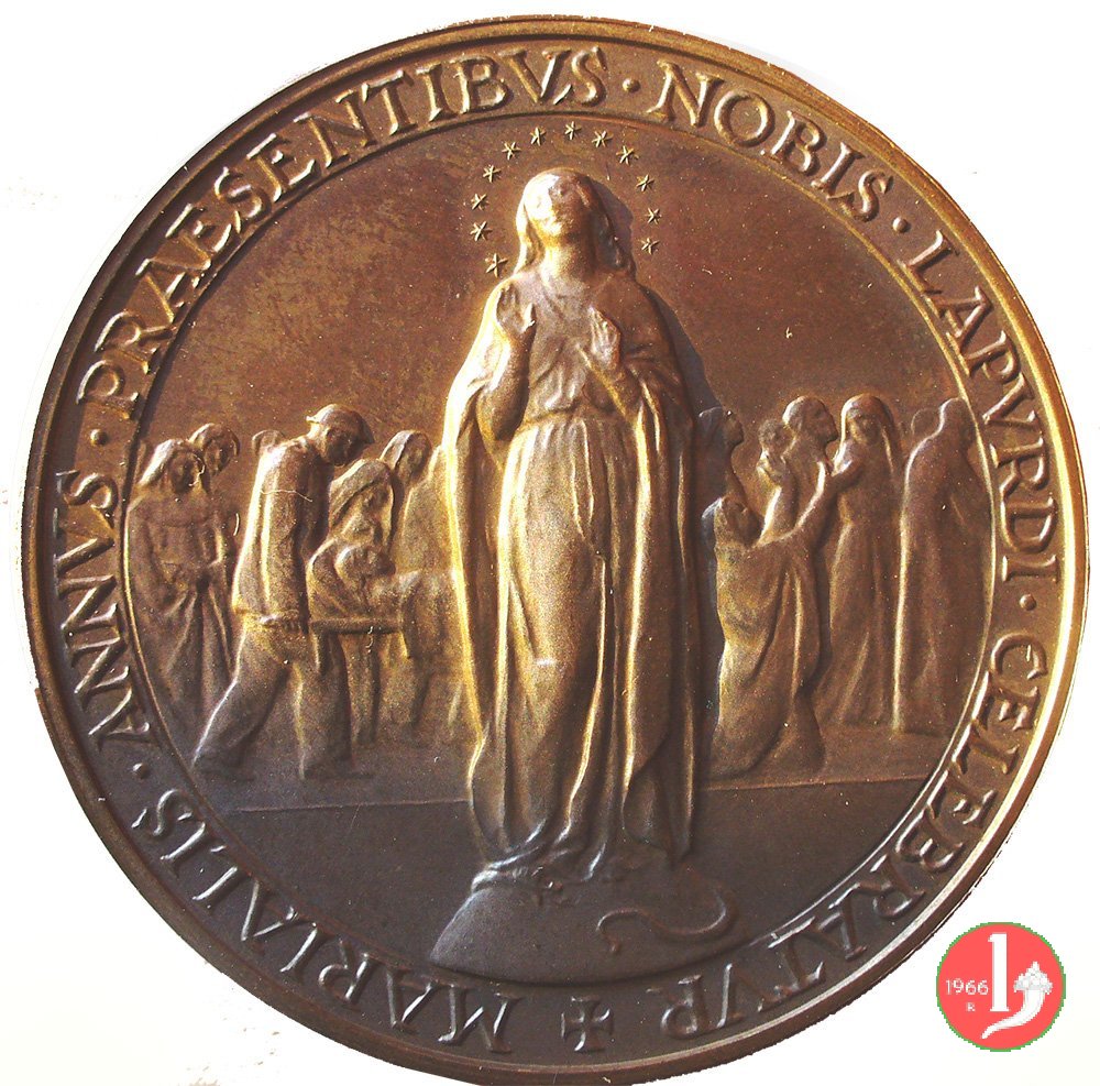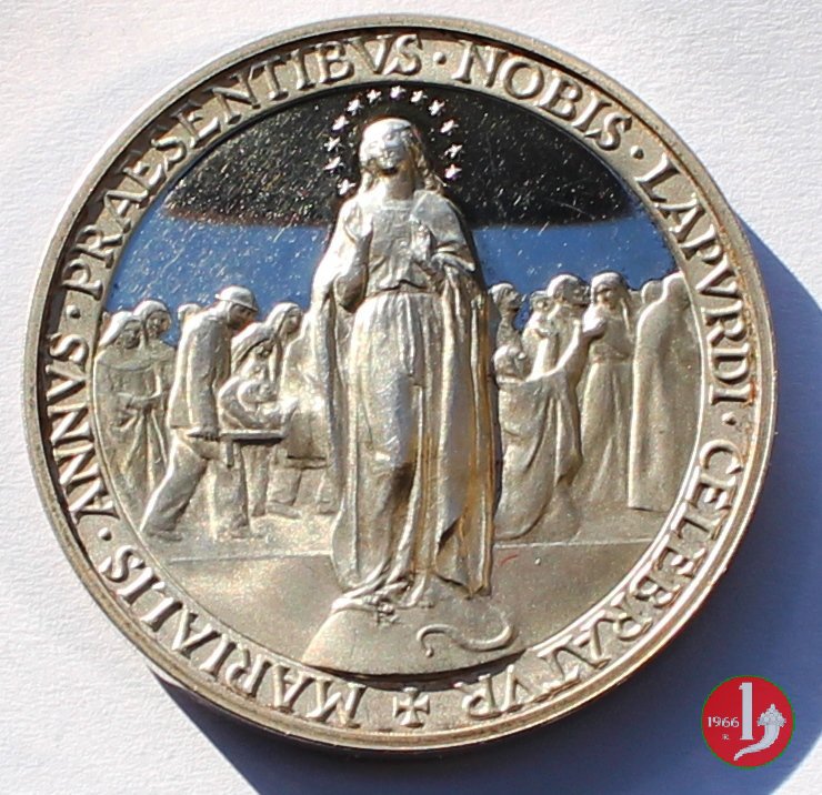 Medaglia annuale coniata, emessa il 29-06-1959, dalla Zecca Italiana con fondo lucido a ricordo dell'anno Mariano celebrato a Lourdes nel centenario dell'apparizione della Madonna.