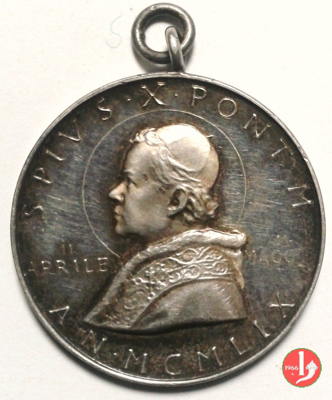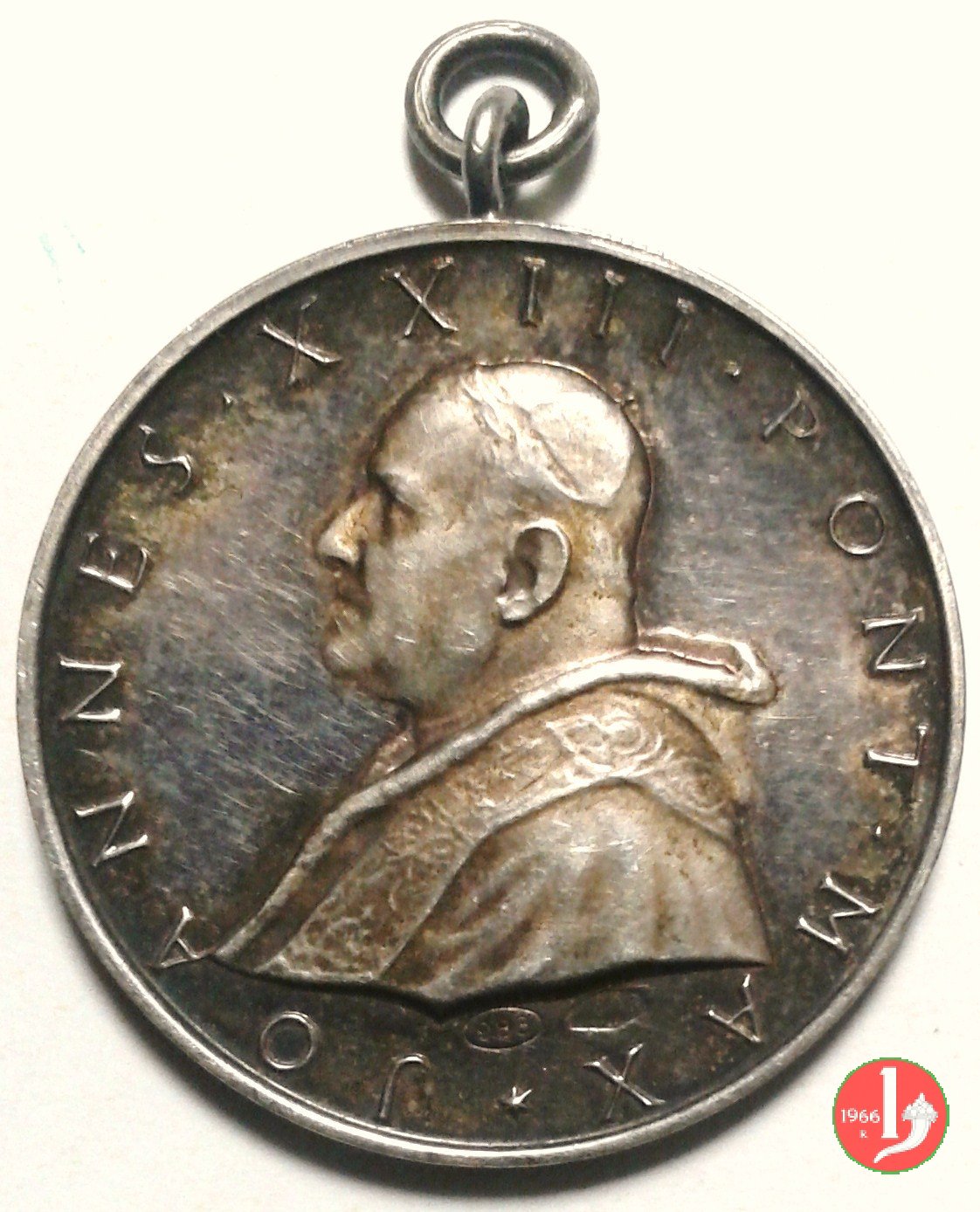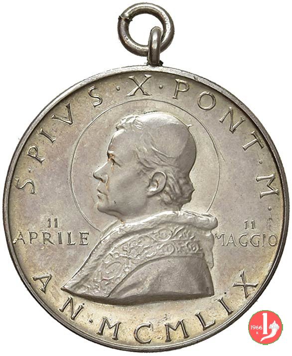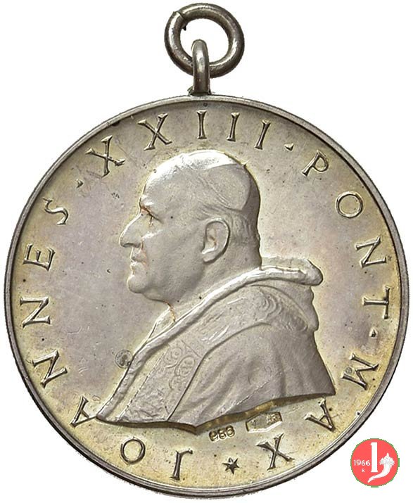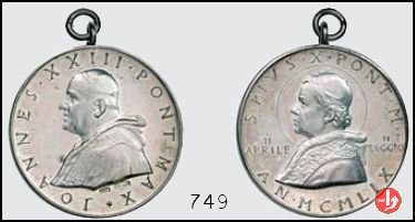 Medaglia coniata, emessa il 11-04-1959, per ricordare la traslazione delle spoglie di Pio X a Venezia. Esiste una versione con la firma dell'incisore J-PAULUS sotto il busto di Giovanni XXIII (vedi scheda successiva). E' stata emessa con due differenti titoli dell'argento 925 e 986. | |||||||