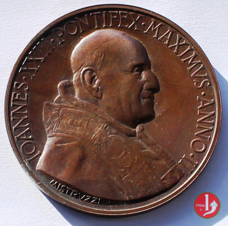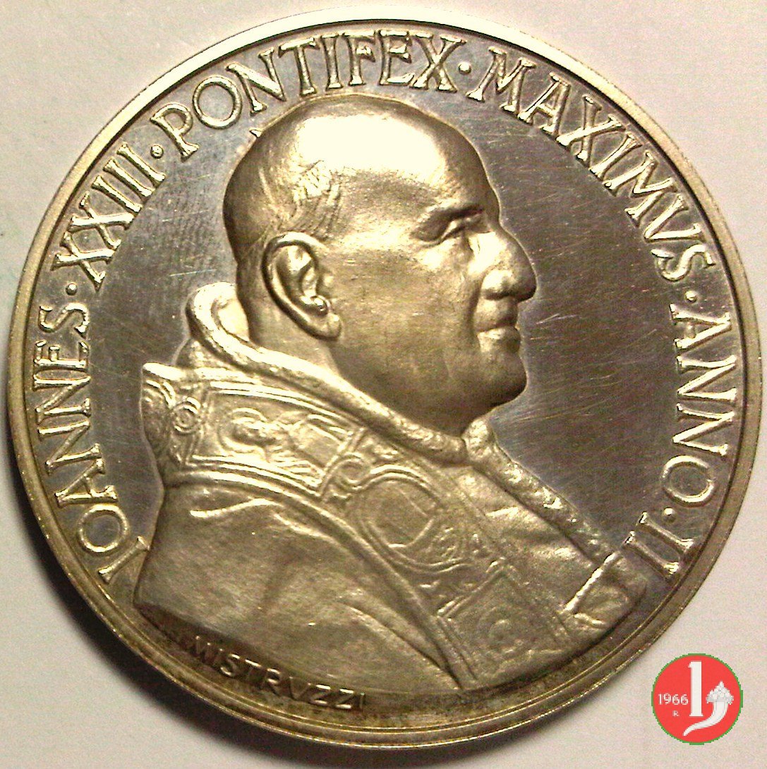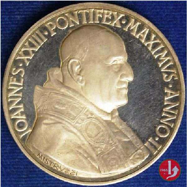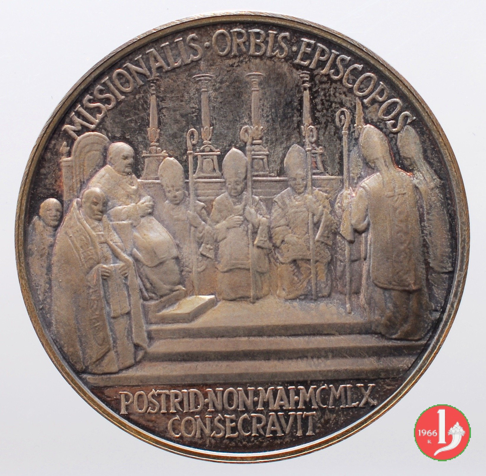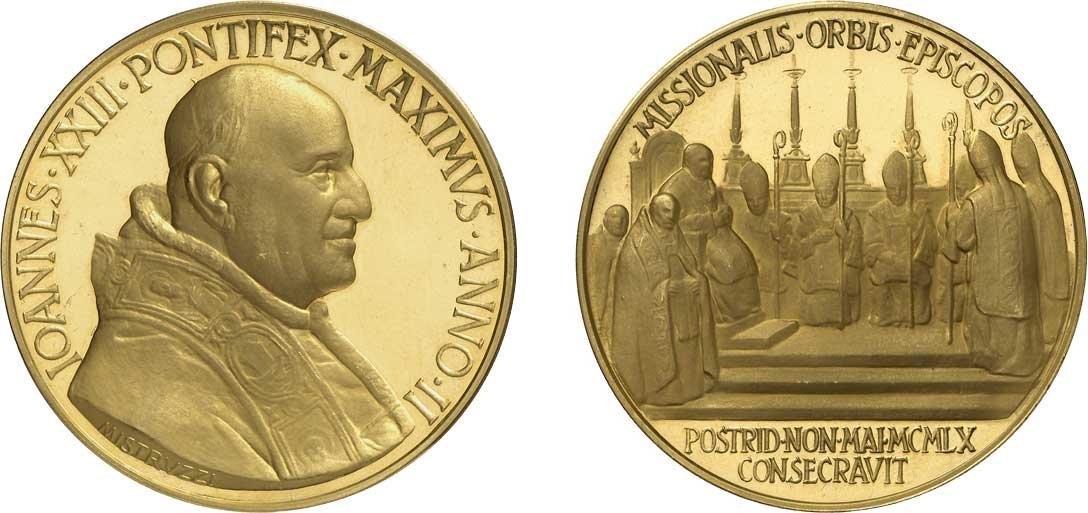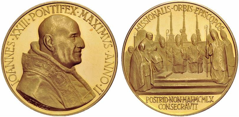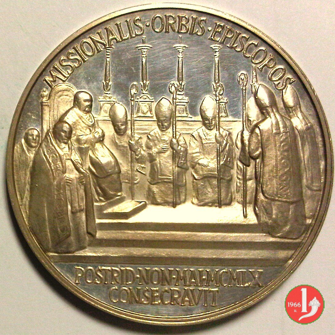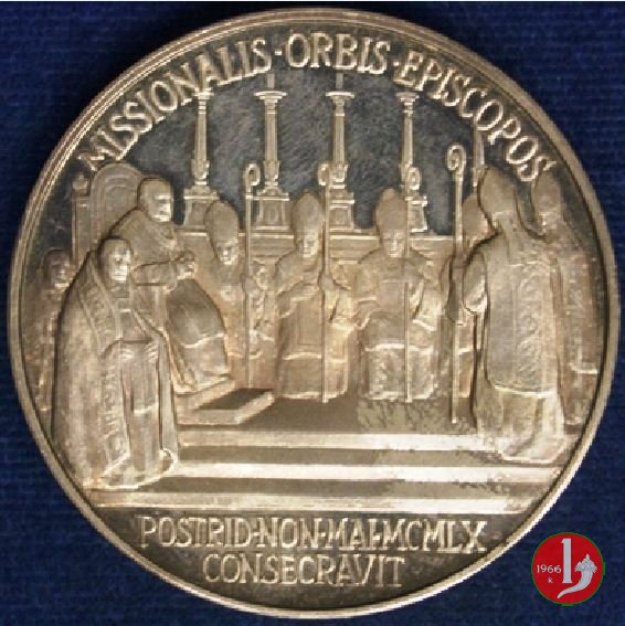 | Medaglia annuale coniata, emessa il 29-06-1960, a ricordo della consacrazione di 14 Vescovi dell'Africa, dell'Asia e dell'Oceania; cerimonia celebrata in S. Pietro il 08-05-1960. | ||||||||