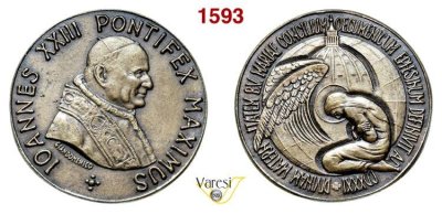 | Medaglia straordinaria fusa, realizzata a ricordo dell' apertura del Concilio Ecumenico Vaticano II e del concilio di Efeso del 431 nel quale la B. V. Maria venne proclamata Madre di Dio e quindi definí la doppia natura di Cristo: vero Dio e vero uomo. | ||||||
