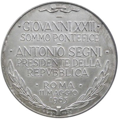 | Medaglia straordinaria coniata, eseguita il 11-05-1963, con fondo satinato dalla Zecca di Stato Italiana, per ricordare la visita di Giovanni XXIII al Presidente della Repubblica Italiana Antonio Segni, al Quirinale. | |||||||