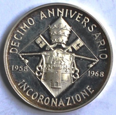 Medaglia coniata privatamente, emessa nel 1968, con fondo specchio dalla Zecca di Stato Italiana, per ricordare il decimo anniversario dell'incoronazione di Giovanni XXIII. | ||||||